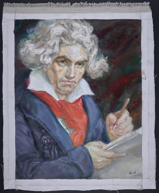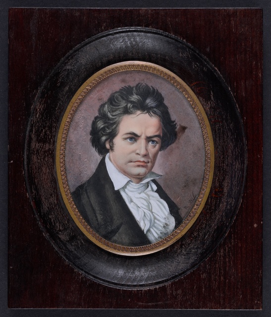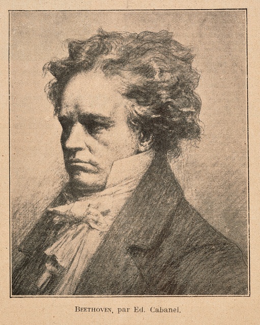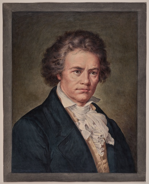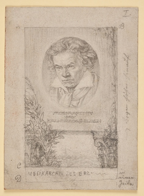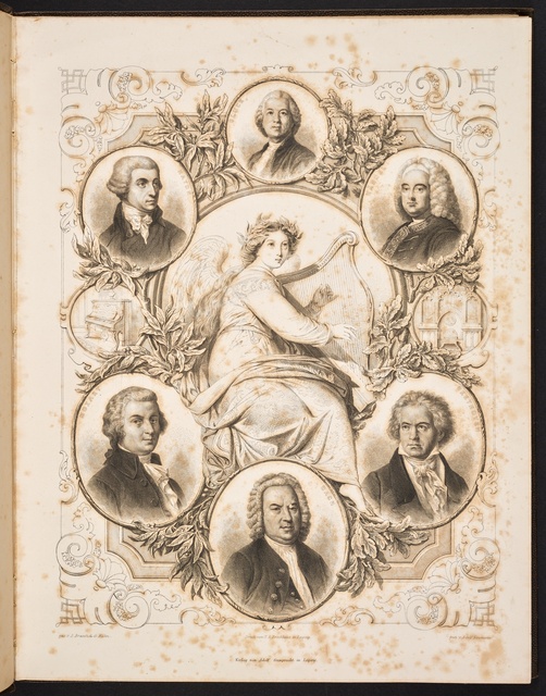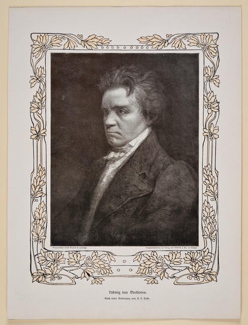 Die heilige Cäcilie, umrahmt von Komponistenporträts in Medaillons, darunter Ludwig van Beethoven - Stahlstich von Adolf Neumann nach einer Zeichnung von A. Brasch und G. Kühn, gestochen von Adolf Neumann, gedruckt von A. Brockhaus, erschienen bei Adolf Gumprecht, Leipzig, 1860