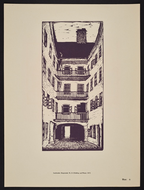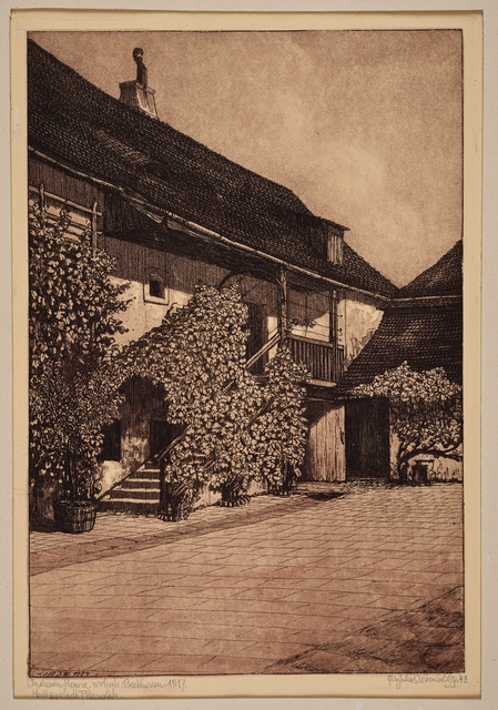 Wien, Heiligenstadt, Probusgasse 6, Wohnung von Ludwig van Beethoven, Hofansicht - Holzschnitt von Carl Moll, im Aquarelldruckverfahren farbig gedruckt von der Wiener Werkstätte, Wien, um 1907