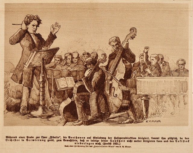 Beethoven als Dirigent bei einer Probe von "Fidelio" 1821 - Zeichnung von Karl Viktor Mayr, Reproduktionsdruck, Wien, 1927