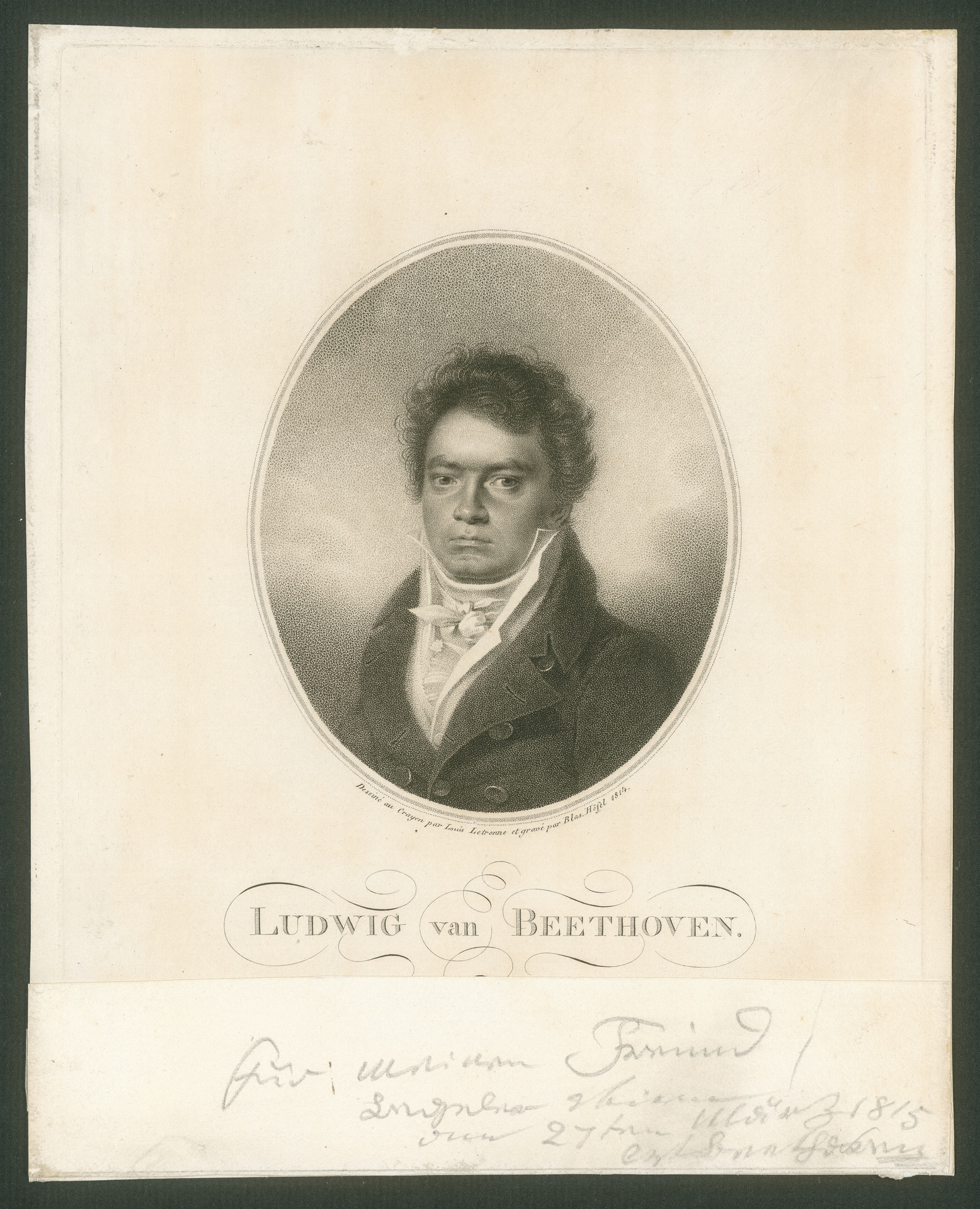 Ludwig van Beethoven - Stich von Blasius Höfel aus dem Jahr 1814 nach einer Zeichnung von Louis Letronne, erschienen bei Artaria, Wien, 1814, mit Widmung Beethovens an Franz Gerhard Wegeler