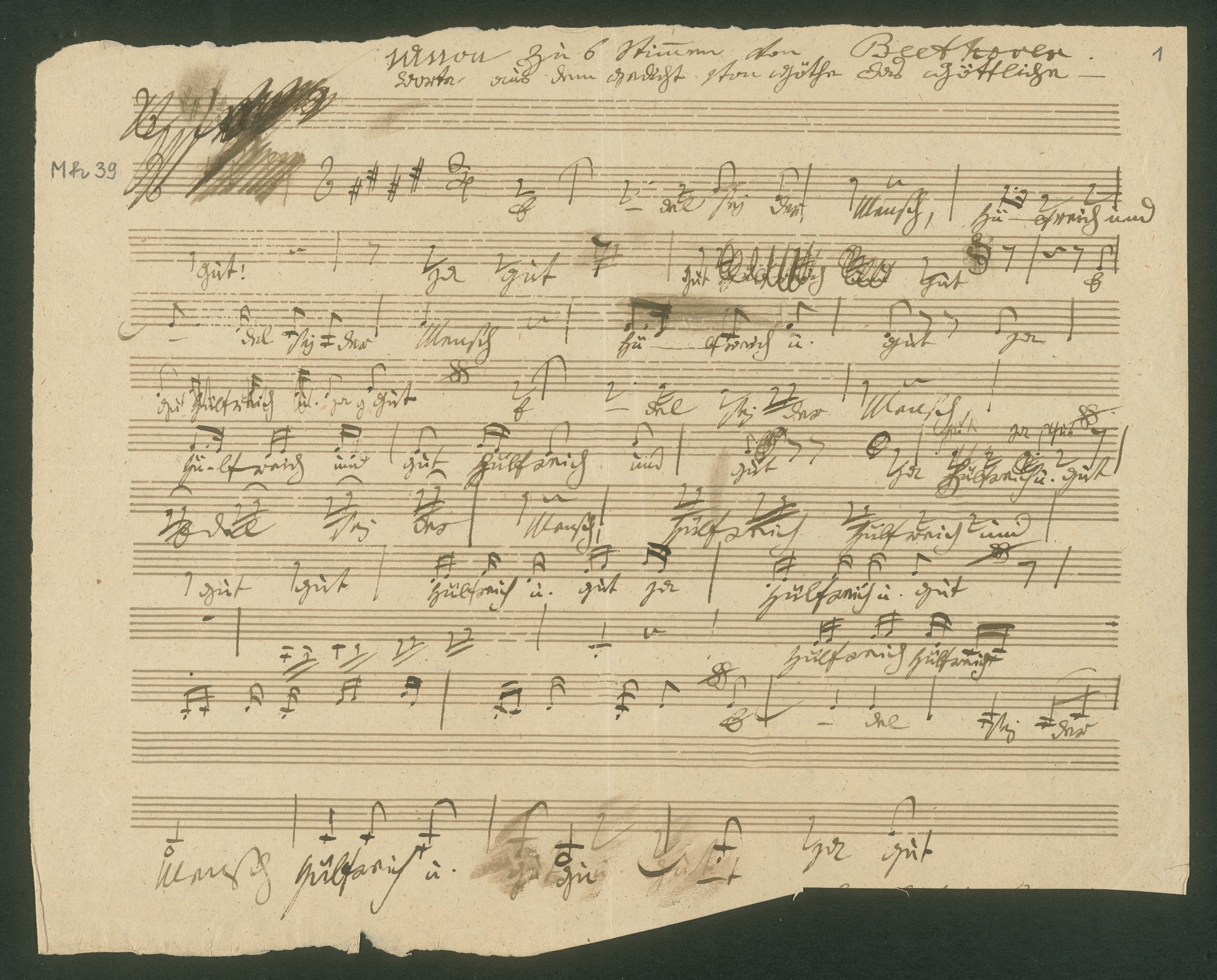 Beethoven wrote many of his canons more or less spontaneously as entries in his visitors' or friends' albums or as mementoes. This might have been the case with the autograph manuscript shown here. He made a note of the source in the title, "Worte aus dem Gedicht von Göthe Das Göttliche" (Words from a poem by Goethe "Das Göttliche"). The leaf is missing the bottom right-hand corner. As a few upstrokes are still visible above the torn-off corner, it is not improbable that there was a dedication. Unfortunately the provenance of the autograph manuscript cannot be followed back far enough to be able to determine to whom it was dedicated. (J.R.)