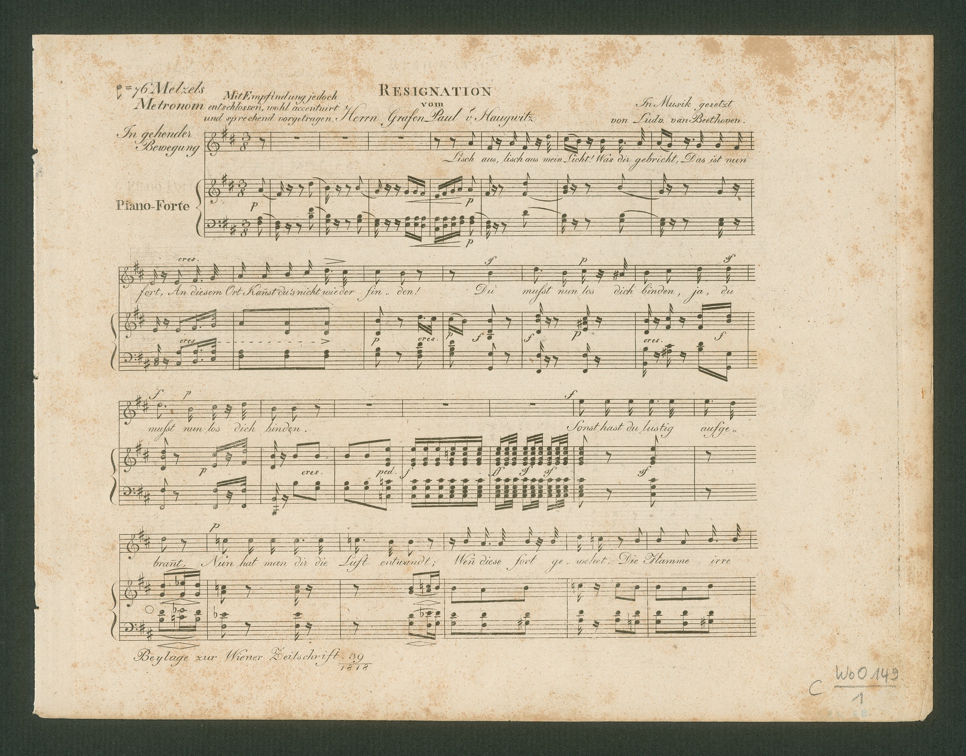 Ludwig van BeethovenPaul von Haugwitz, "Resignation", Lied für Singstimme und Klavier WoO 149, Wiener Zeitschrift für Kunst, Literatur, Theater und Mode