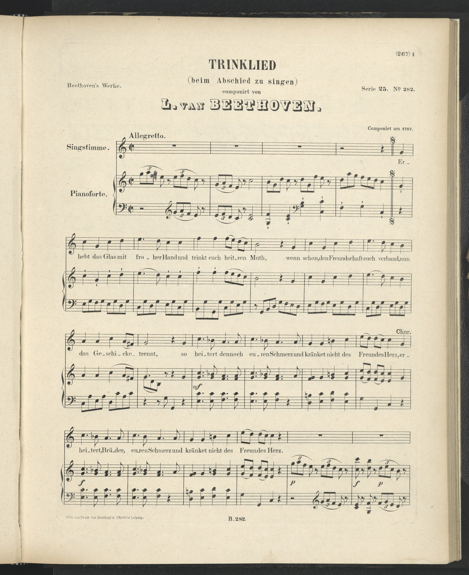 Ludwig van Beethoven, "Trinklied (beim Abschied zu singen)", Lied für Singstimme, einstimmigen Chor und Klavier WoO 109, Breitkopf und Härtel, 282