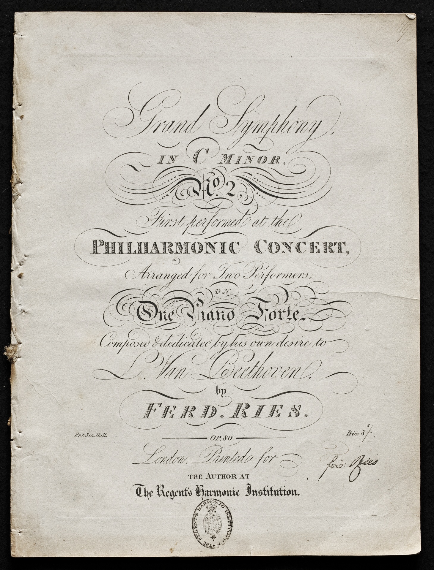 Ferdinand Ries, Sinfonie Nr. 2 op. 80, für Klavier vierhändig, London, Selbstverlag, 1819