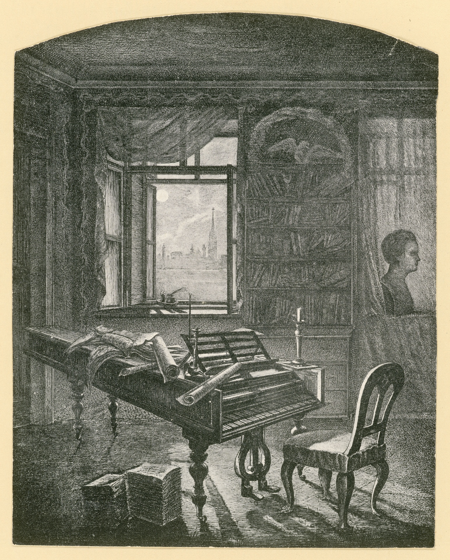 Wien, Alsergrund, Schwarzspanierstraße 15, Wohnung von Ludwig van Beethoven (Schwarzspanierhaus), Schlaf- und Klavierzimmer - Radierung von Gustav Leybold nach einer Zeichnung von Johann Nepomuk Hoechle von 1827, anonyme Reproduktion, um 1925?