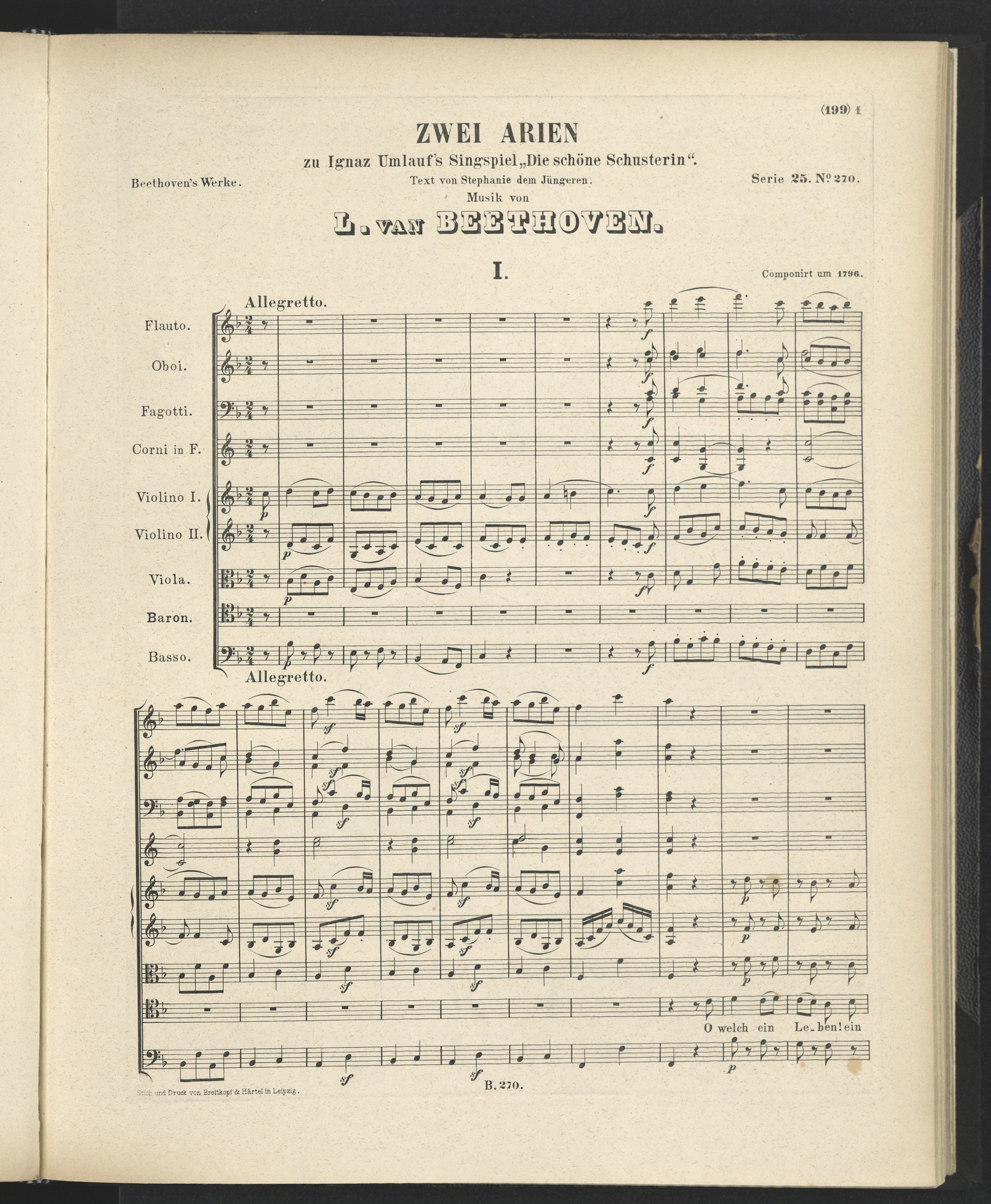 Ludwig van BeethovenGottlieb Stephanie, Arien zu Ignaz Umlaufs Singspiel "Die schöne Schusterin" für Singstimme und Orchester WoO 91, 1-2, Partitur, Breitkopf und Härtel, 270