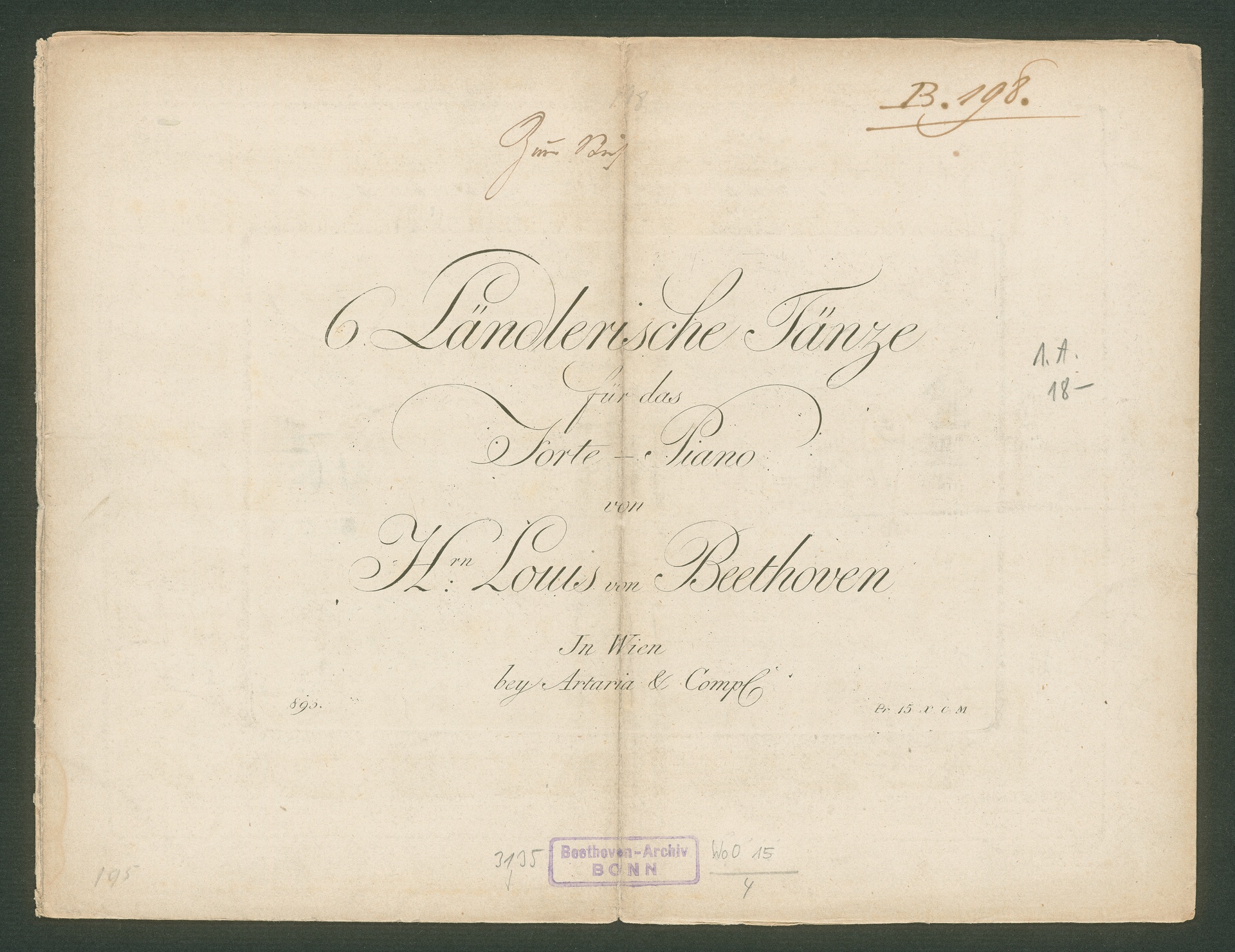 Ludwig van Beethoven, Ländlerische Tänze für 2 Violinen und Bass (D-Dur) WoO 15, 1-6, Fassung für Klavier, Artaria, 893