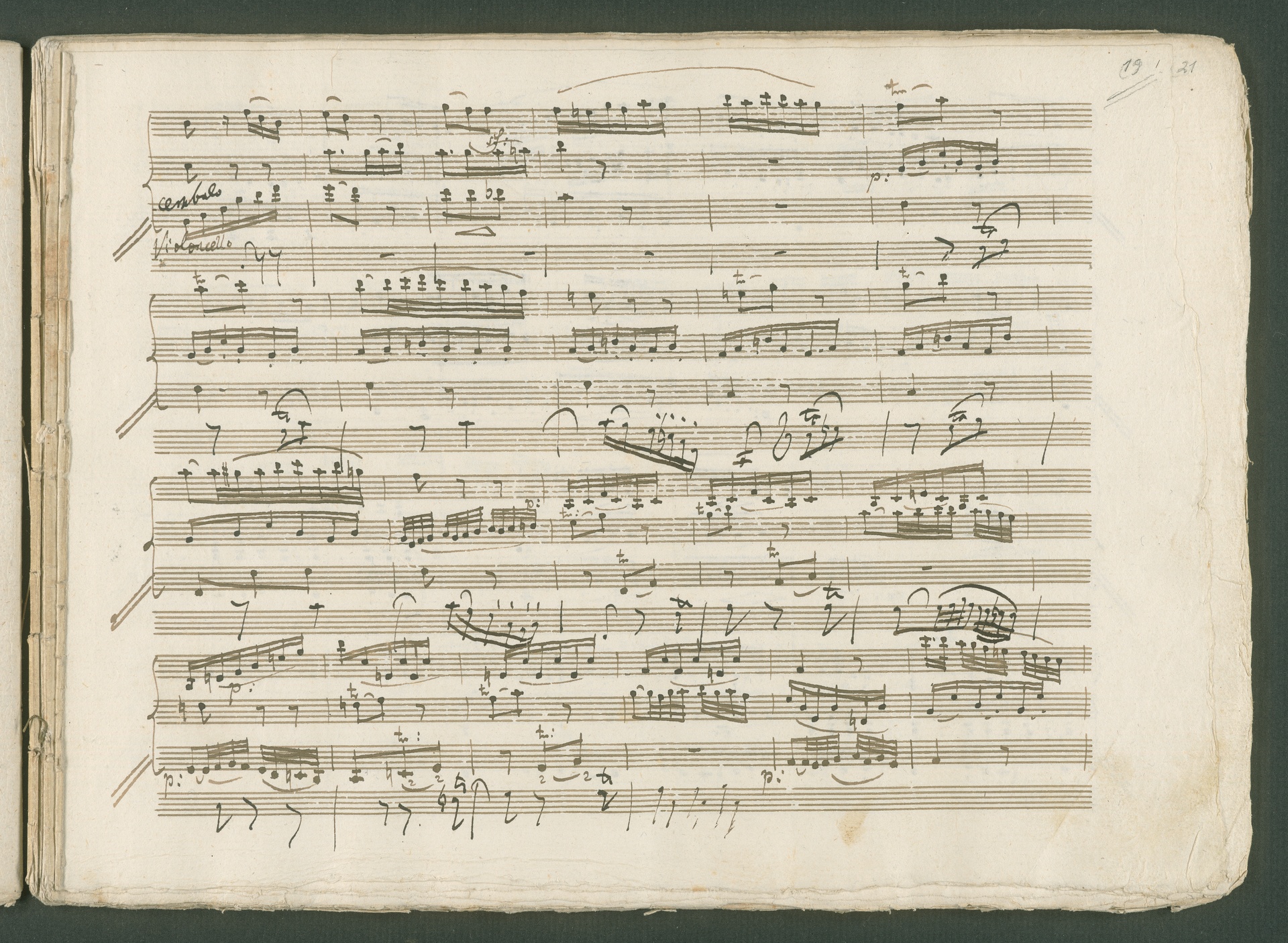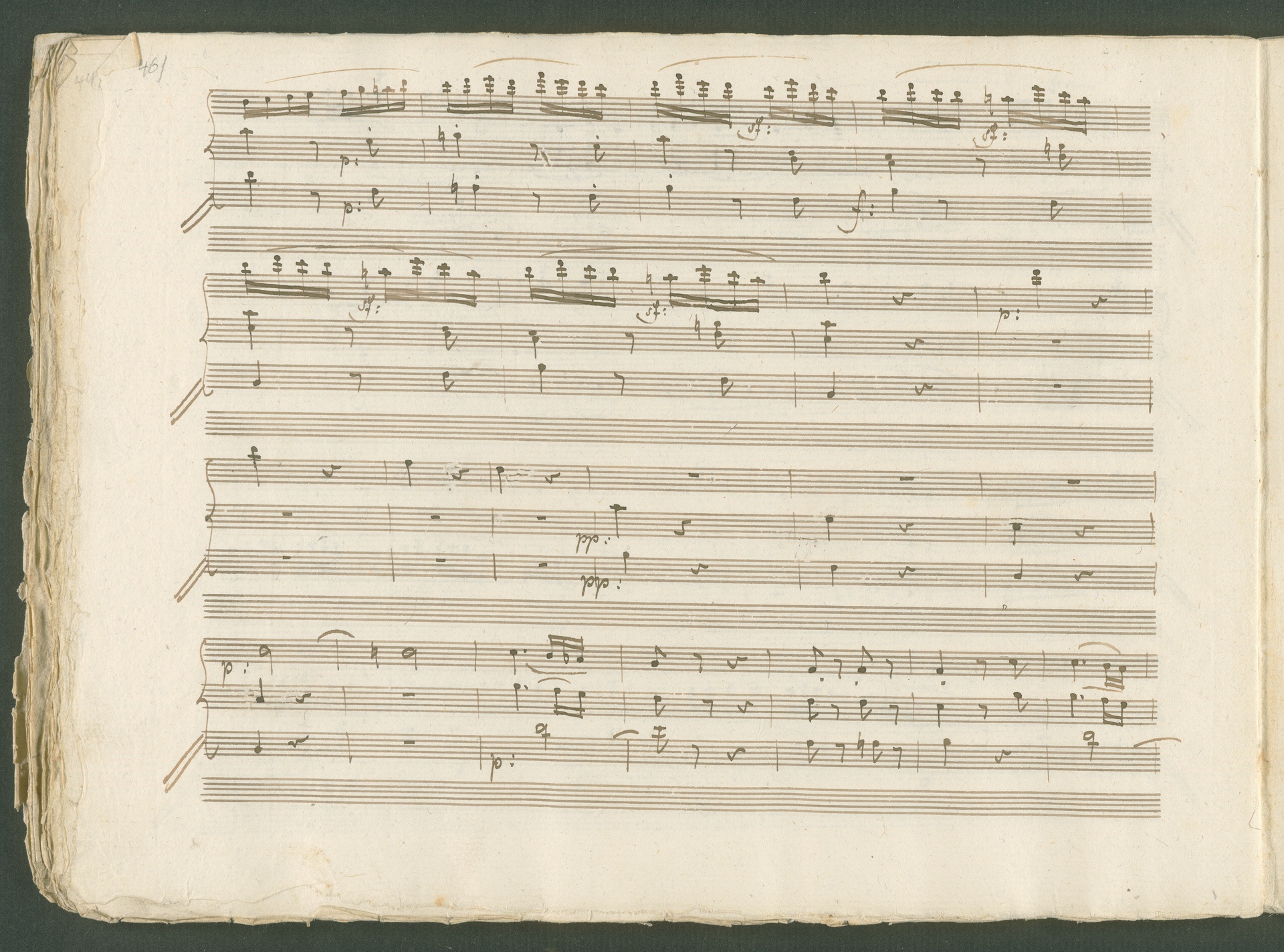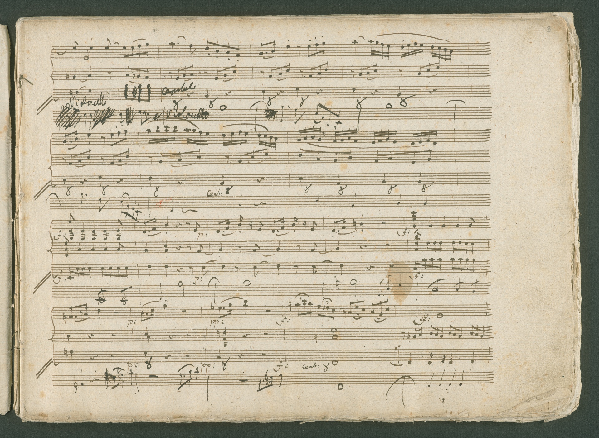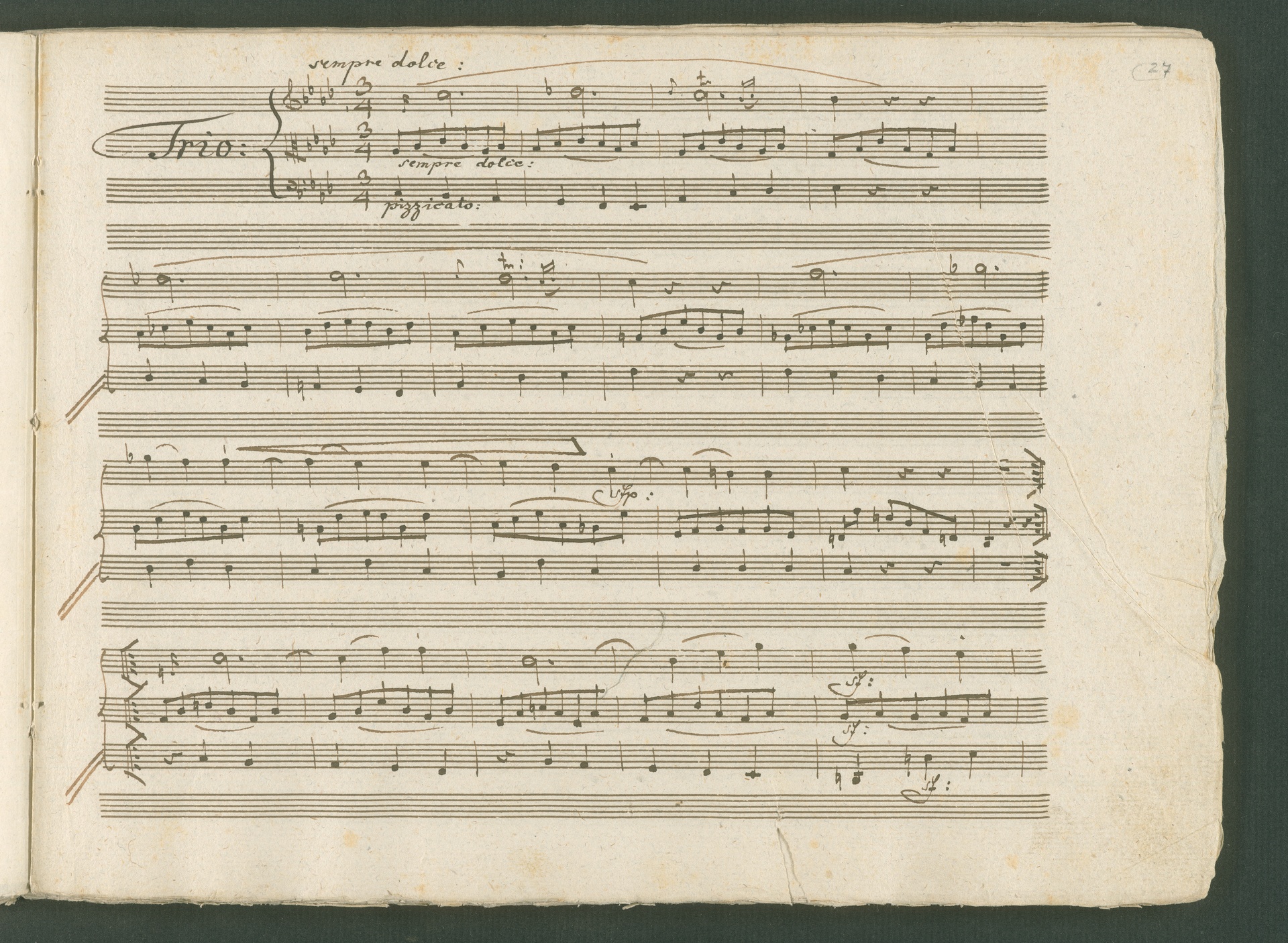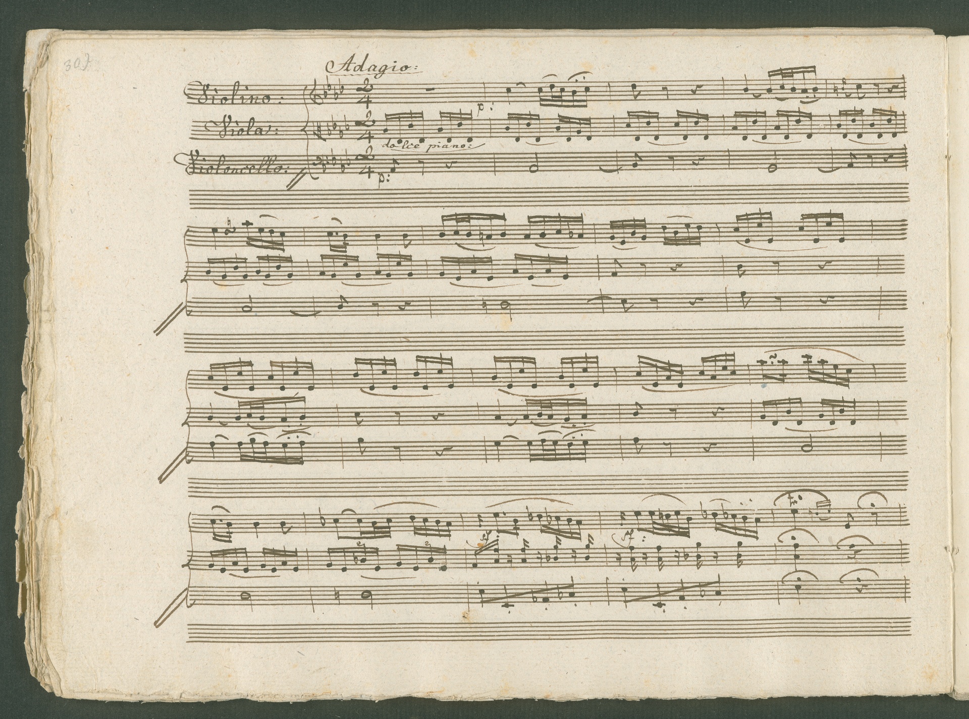 Here you can see a corrected copy of the String Trio op. 3. However, Beethoven's remarks can only be found up to page 19 - all subsequent pages do not contain any corrections or comments in the composer's hand. The copyist had notated the three stringed instruments in the score and joined them together using an accolade, leaving a stave free underneath each accolade. Beethoven made use of these free lines in the first movement and the first 44 bars of the second movement for his comments. The background to these corrections has not been explained up to now. In the first bar Beethoven writes: "Der Herr Violoncellist ist gebeten diesen Takt zu pausiren" (The cellist is asked to rest in this bar), he frequently adds the word "Cembalo" (harpsichord) or the abbreviation "Cemb" to his comments. It was this combination of corrections for the cello part as well as the introduction of the harpsichord (i.e. a keyboard instrument) that surprised scholars, causing them to speculate why. In 1920 Wilhelm Altmann presumed that Beethoven had wanted to rework the string trio for piano trio. It was for this reason that he notated a new cello part (in the fourth stave) and reworked the previous cello part as the left-hand part for a keyboard instrument. The right-hand harpsichord part would then have been the viola part. The viola, as an instrument in its own right, would no longer have had a part to play in this version, and the violin part would have remained unchanged. Another possibility was also considered: even the retention of all the strings would be possible. With an additional harpsichord or piano part, which Beethoven later sketched into the free staves, the copy could be a draft for piano quartet. Beethoven's real intentions remain unknown. There are both pros and cons for both models. Beethoven obviously discarded the arrangement himself, as we would otherwise have an authentic arrangement of the string trio (the arrangement for piano and cello op. 64 is not by Beethoven!) and the markings would not cease after the first two pages of the second movement. (J.R.)