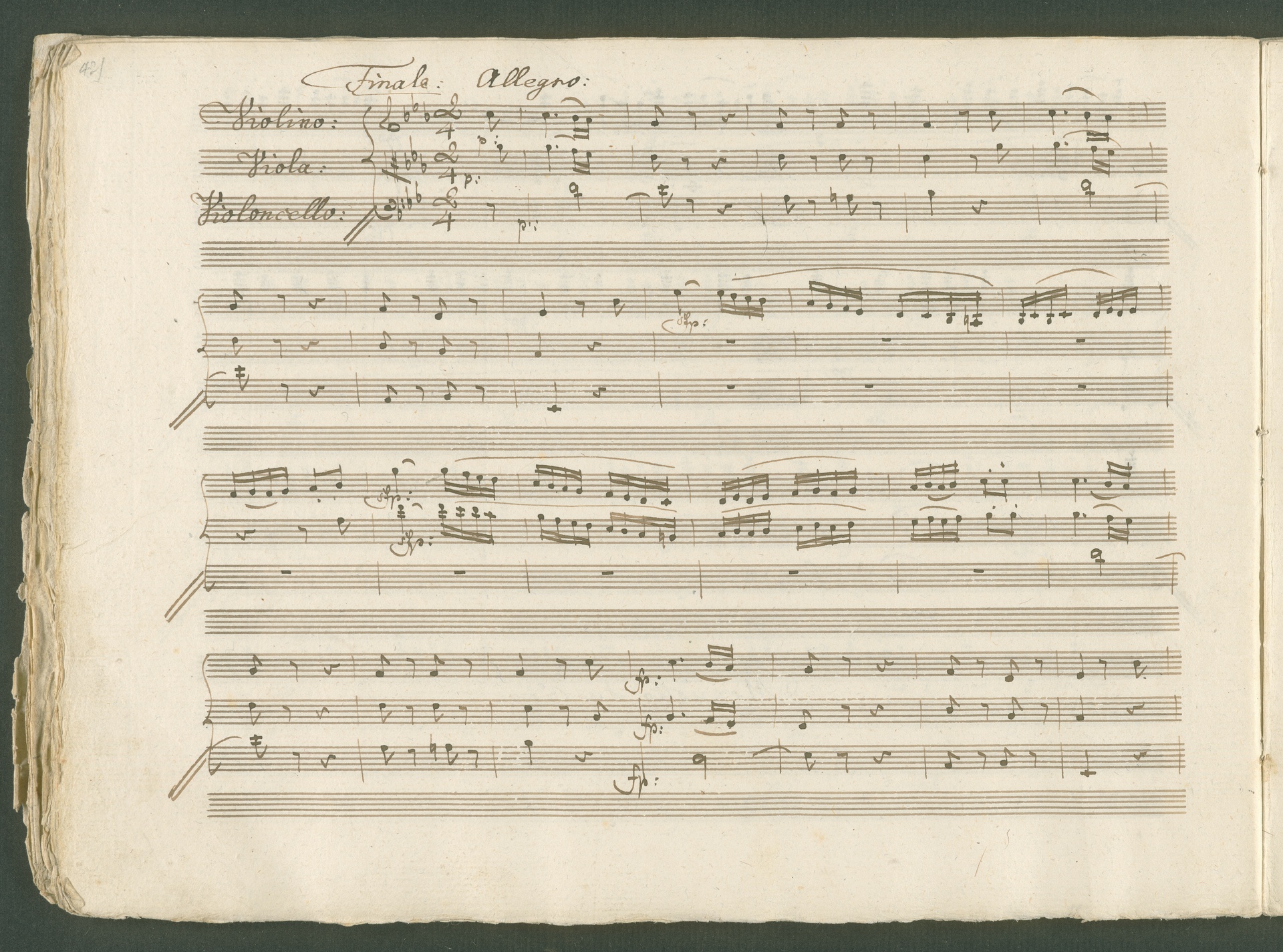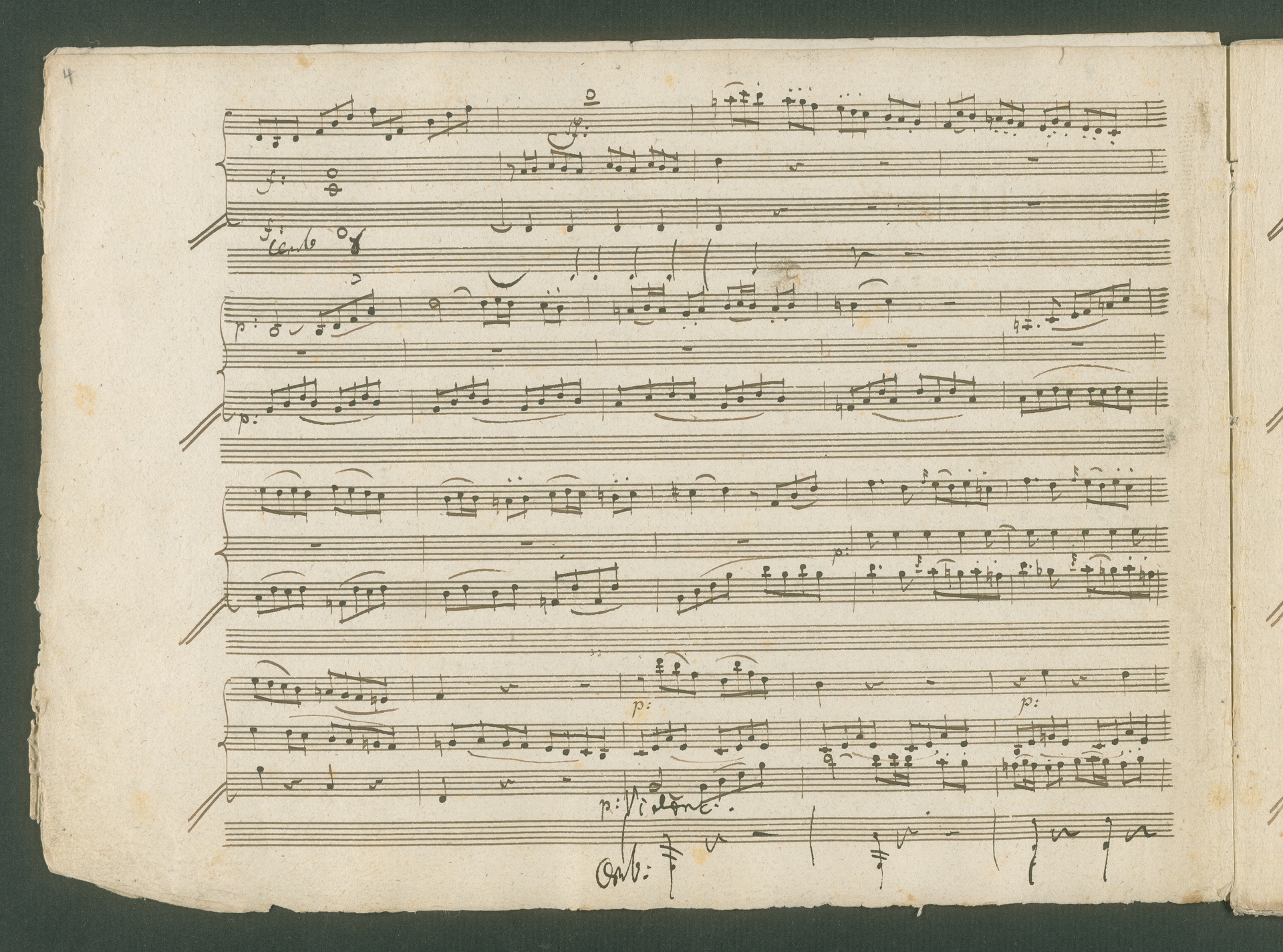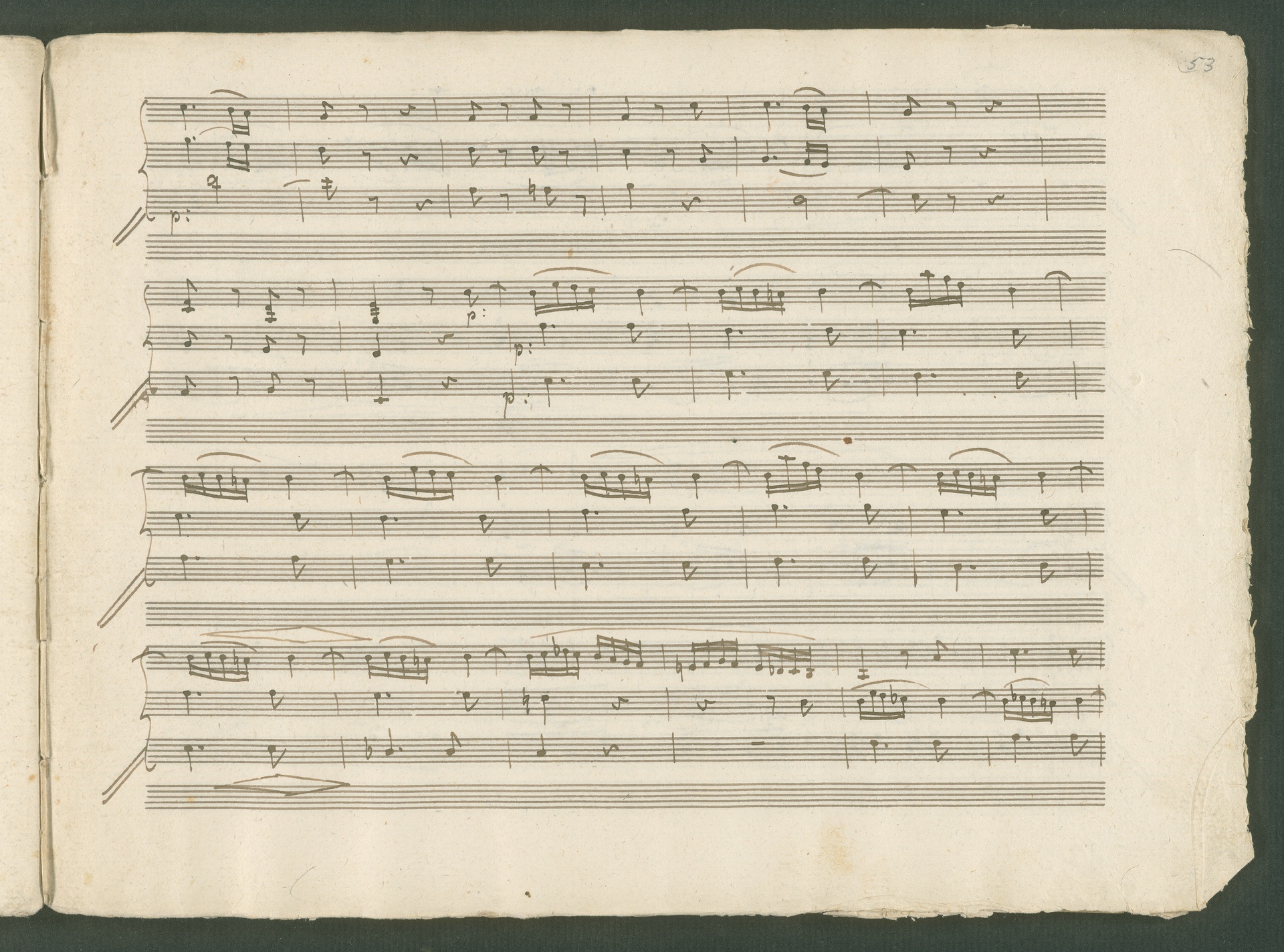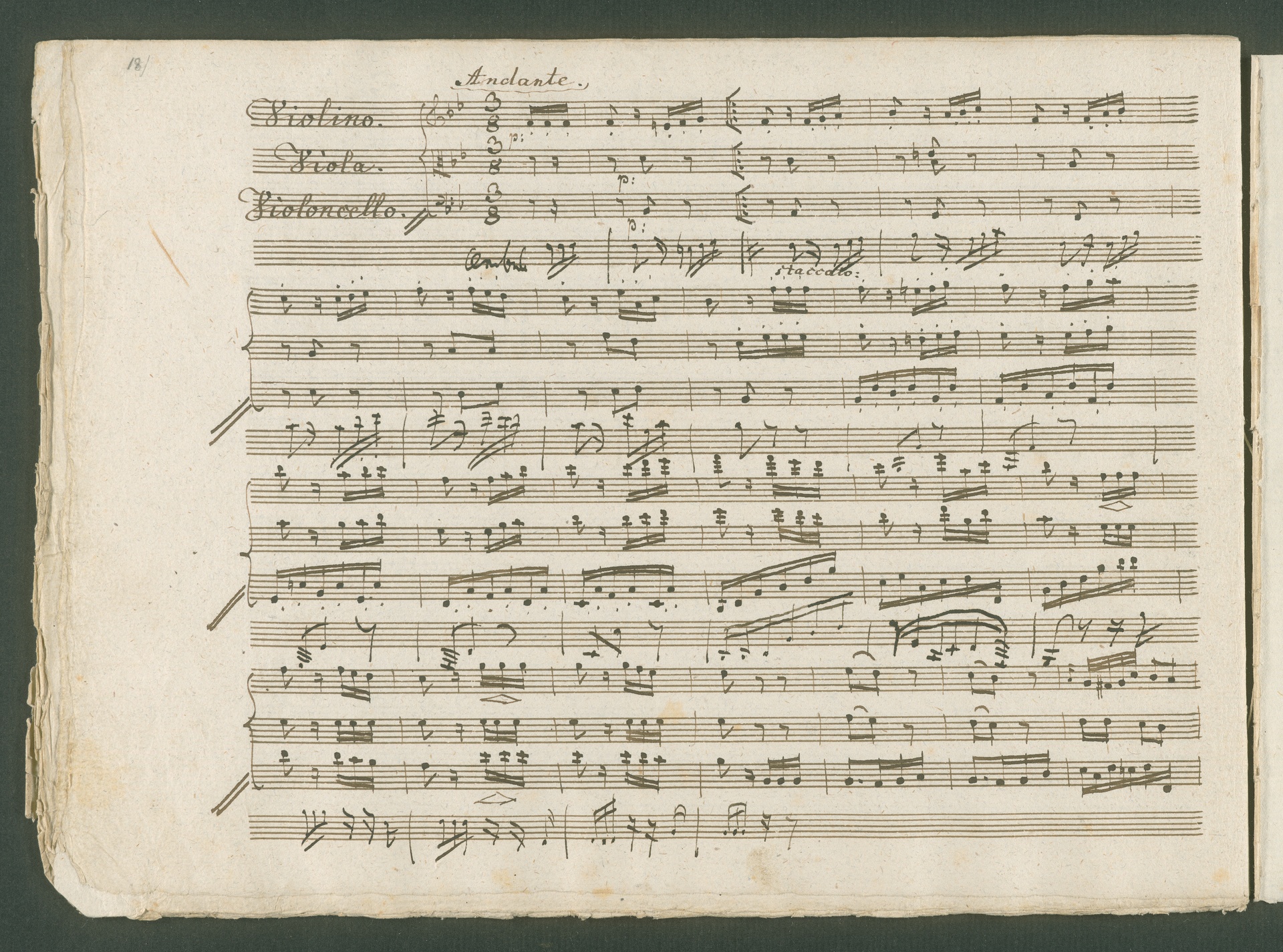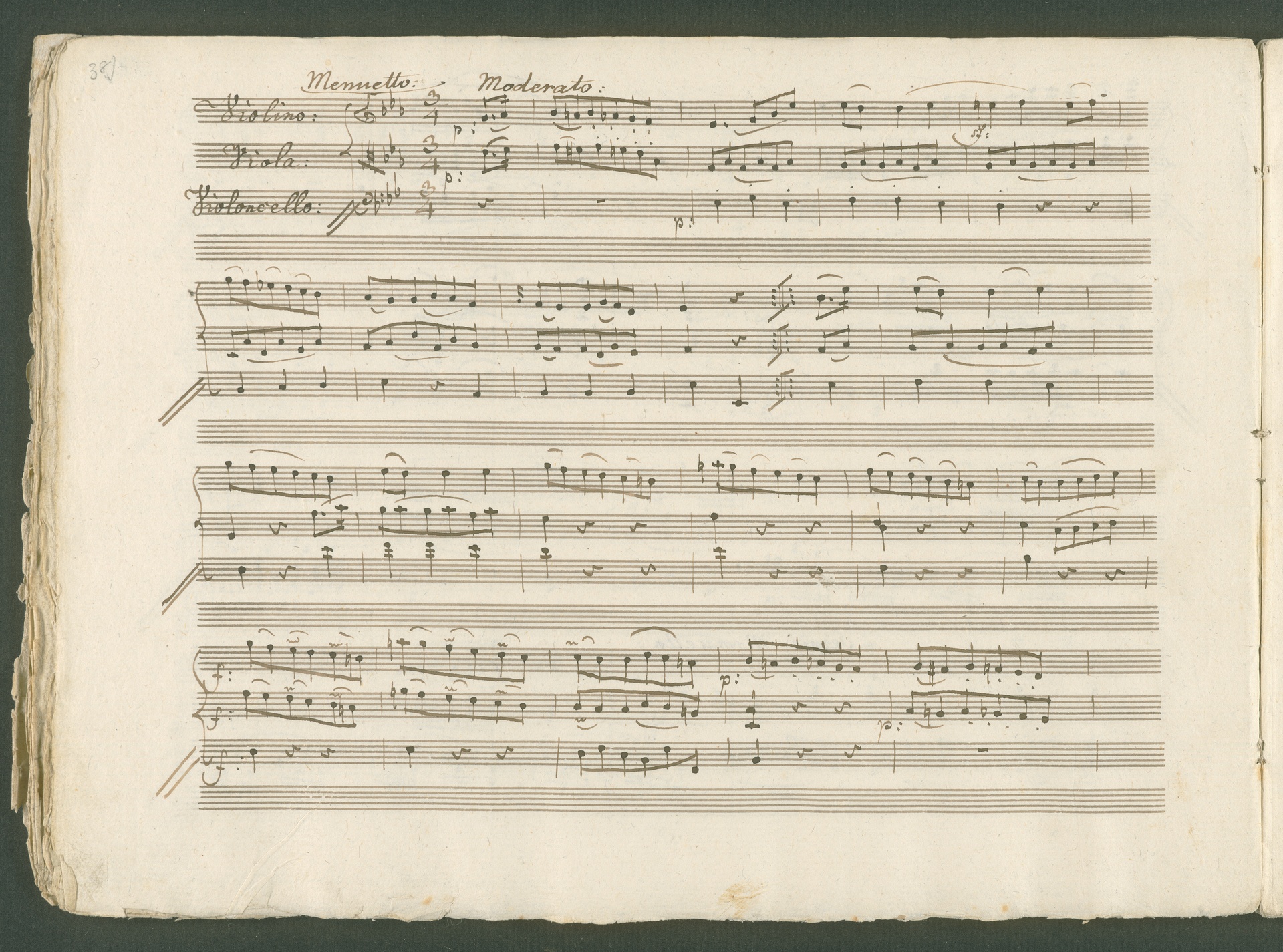 Here you can see a corrected copy of the String Trio op. 3. However, Beethoven's remarks can only be found up to page 19 - all subsequent pages do not contain any corrections or comments in the composer's hand. The copyist had notated the three stringed instruments in the score and joined them together using an accolade, leaving a stave free underneath each accolade. Beethoven made use of these free lines in the first movement and the first 44 bars of the second movement for his comments. The background to these corrections has not been explained up to now. In the first bar Beethoven writes: "Der Herr Violoncellist ist gebeten diesen Takt zu pausiren" (The cellist is asked to rest in this bar), he frequently adds the word "Cembalo" (harpsichord) or the abbreviation "Cemb" to his comments. It was this combination of corrections for the cello part as well as the introduction of the harpsichord (i.e. a keyboard instrument) that surprised scholars, causing them to speculate why. In 1920 Wilhelm Altmann presumed that Beethoven had wanted to rework the string trio for piano trio. It was for this reason that he notated a new cello part (in the fourth stave) and reworked the previous cello part as the left-hand part for a keyboard instrument. The right-hand harpsichord part would then have been the viola part. The viola, as an instrument in its own right, would no longer have had a part to play in this version, and the violin part would have remained unchanged. Another possibility was also considered: even the retention of all the strings would be possible. With an additional harpsichord or piano part, which Beethoven later sketched into the free staves, the copy could be a draft for piano quartet. Beethoven's real intentions remain unknown. There are both pros and cons for both models. Beethoven obviously discarded the arrangement himself, as we would otherwise have an authentic arrangement of the string trio (the arrangement for piano and cello op. 64 is not by Beethoven!) and the markings would not cease after the first two pages of the second movement. (J.R.)