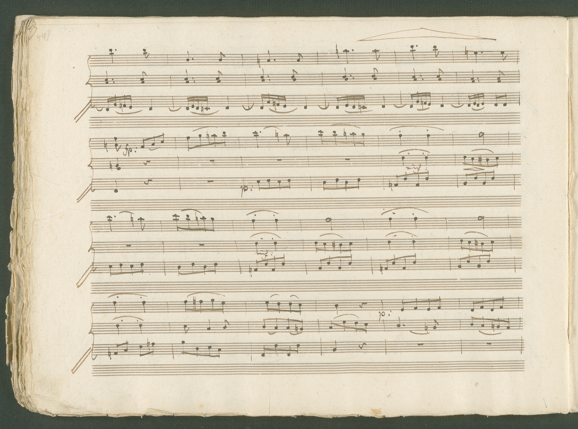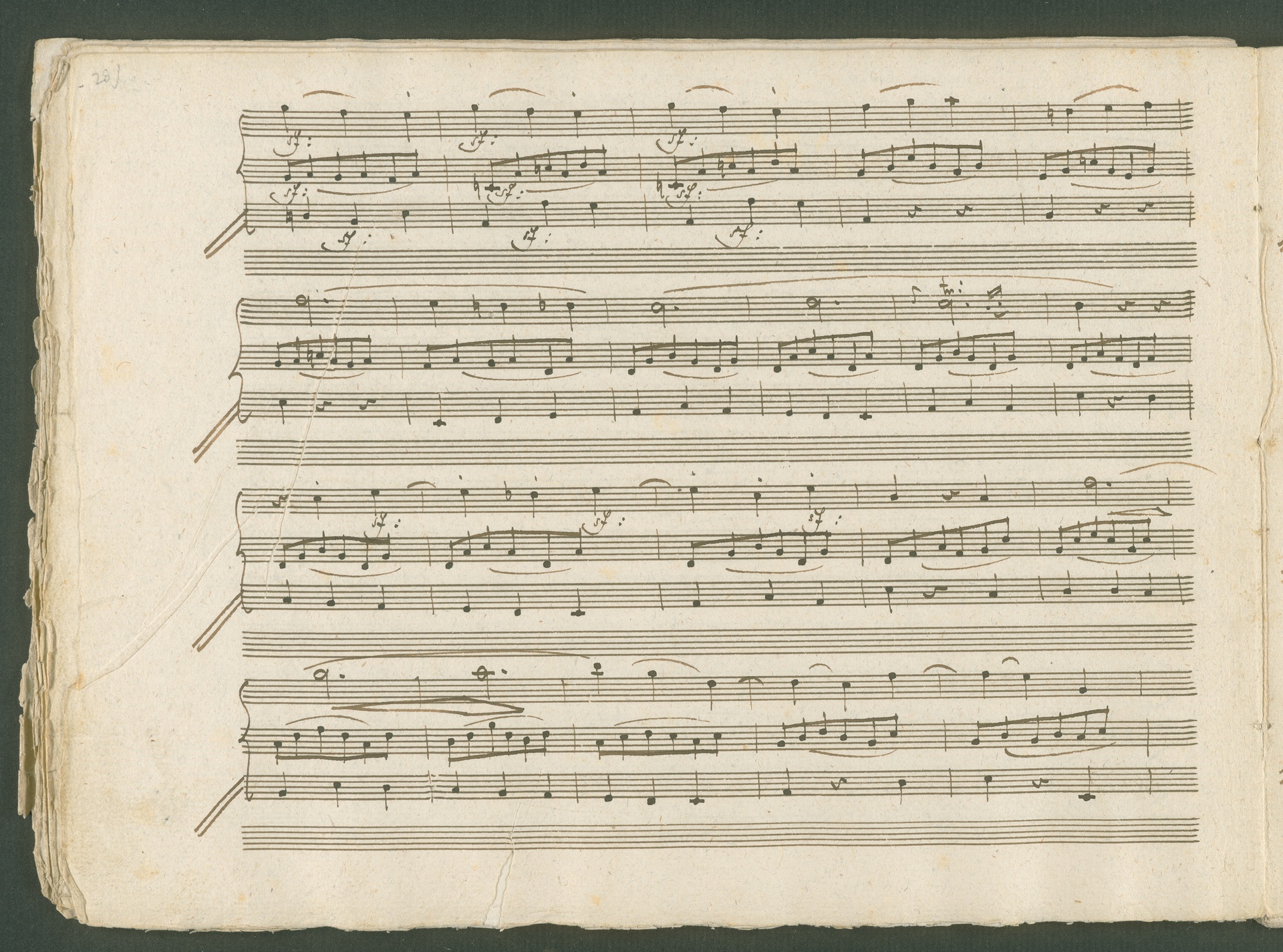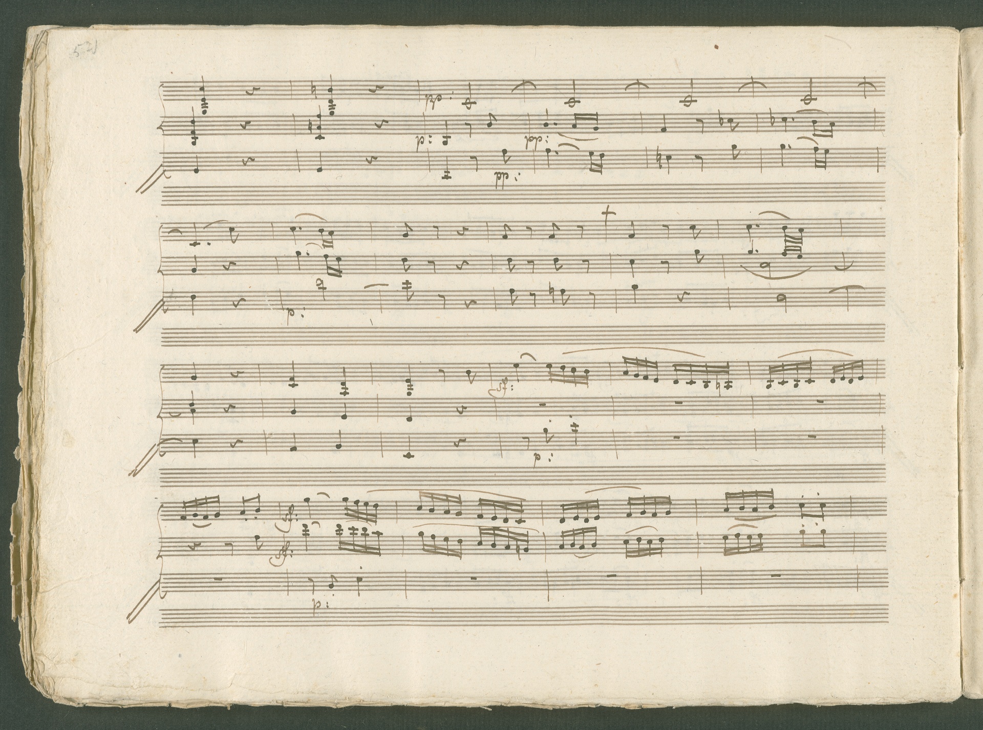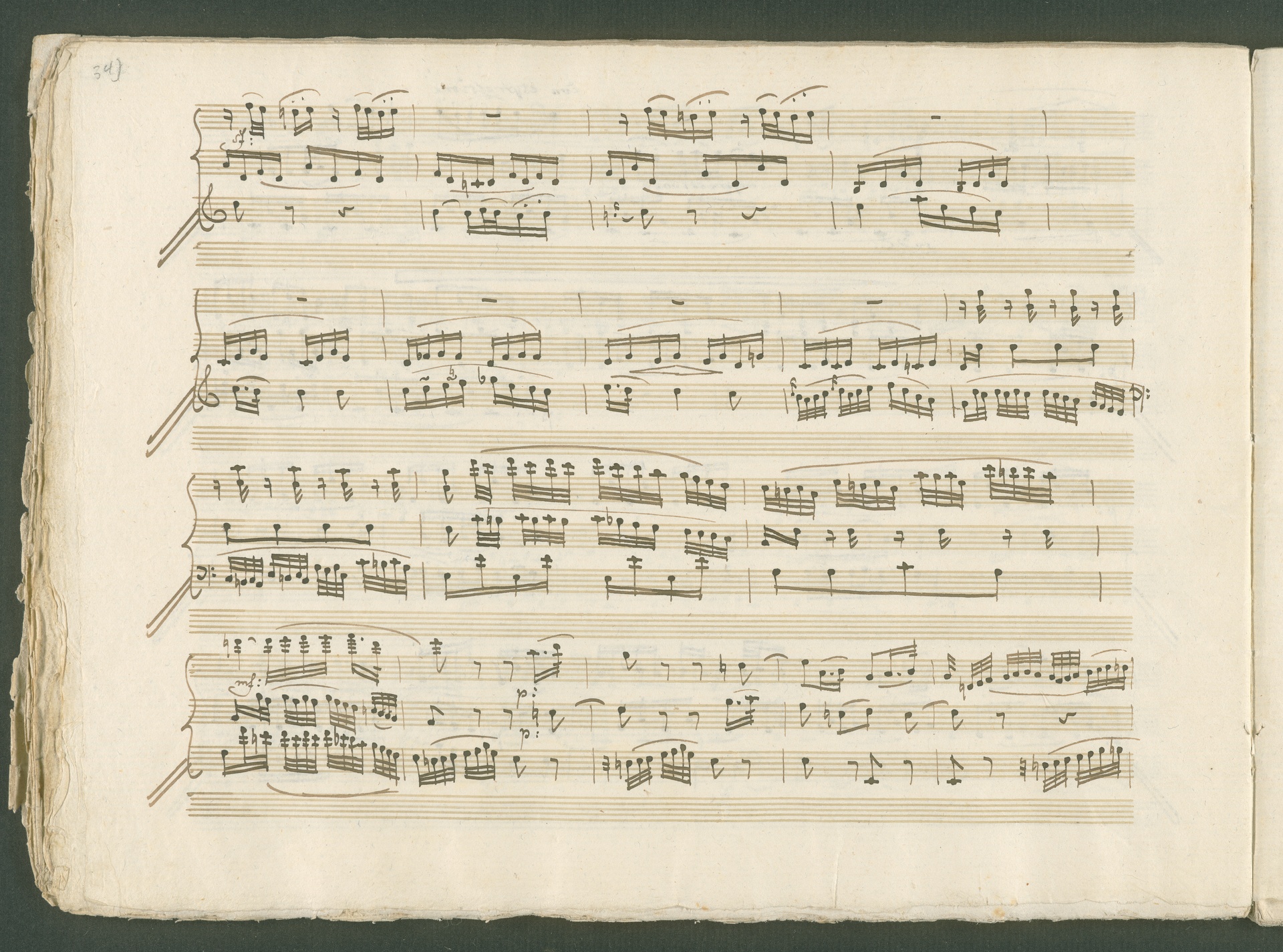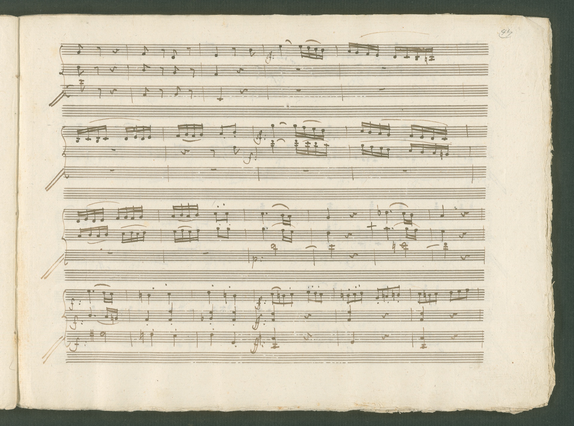 Here you can see a corrected copy of the String Trio op. 3. However, Beethoven's remarks can only be found up to page 19 - all subsequent pages do not contain any corrections or comments in the composer's hand. The copyist had notated the three stringed instruments in the score and joined them together using an accolade, leaving a stave free underneath each accolade. Beethoven made use of these free lines in the first movement and the first 44 bars of the second movement for his comments. The background to these corrections has not been explained up to now. In the first bar Beethoven writes: "Der Herr Violoncellist ist gebeten diesen Takt zu pausiren" (The cellist is asked to rest in this bar), he frequently adds the word "Cembalo" (harpsichord) or the abbreviation "Cemb" to his comments. It was this combination of corrections for the cello part as well as the introduction of the harpsichord (i.e. a keyboard instrument) that surprised scholars, causing them to speculate why. In 1920 Wilhelm Altmann presumed that Beethoven had wanted to rework the string trio for piano trio. It was for this reason that he notated a new cello part (in the fourth stave) and reworked the previous cello part as the left-hand part for a keyboard instrument. The right-hand harpsichord part would then have been the viola part. The viola, as an instrument in its own right, would no longer have had a part to play in this version, and the violin part would have remained unchanged. Another possibility was also considered: even the retention of all the strings would be possible. With an additional harpsichord or piano part, which Beethoven later sketched into the free staves, the copy could be a draft for piano quartet. Beethoven's real intentions remain unknown. There are both pros and cons for both models. Beethoven obviously discarded the arrangement himself, as we would otherwise have an authentic arrangement of the string trio (the arrangement for piano and cello op. 64 is not by Beethoven!) and the markings would not cease after the first two pages of the second movement. (J.R.)