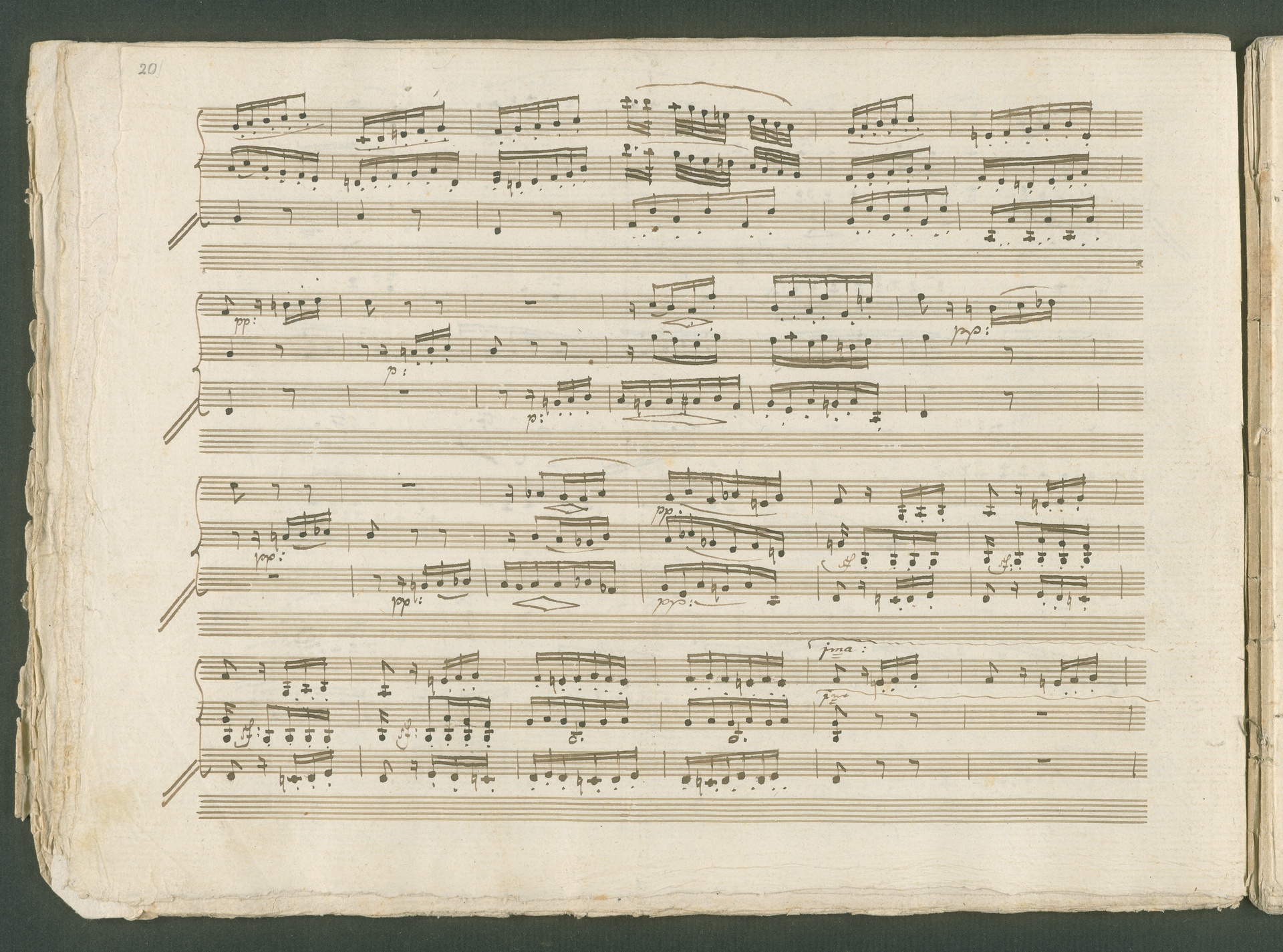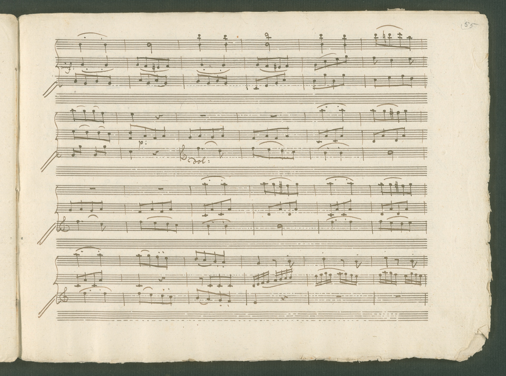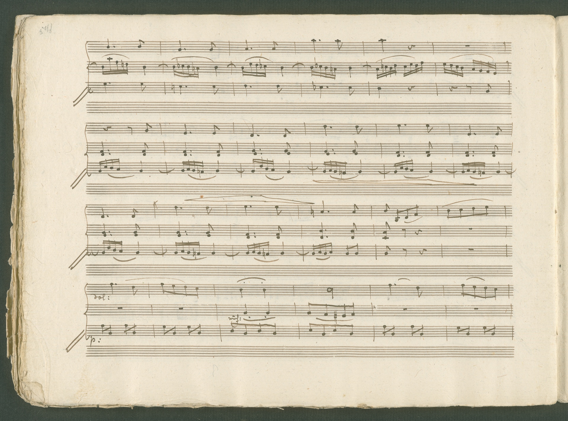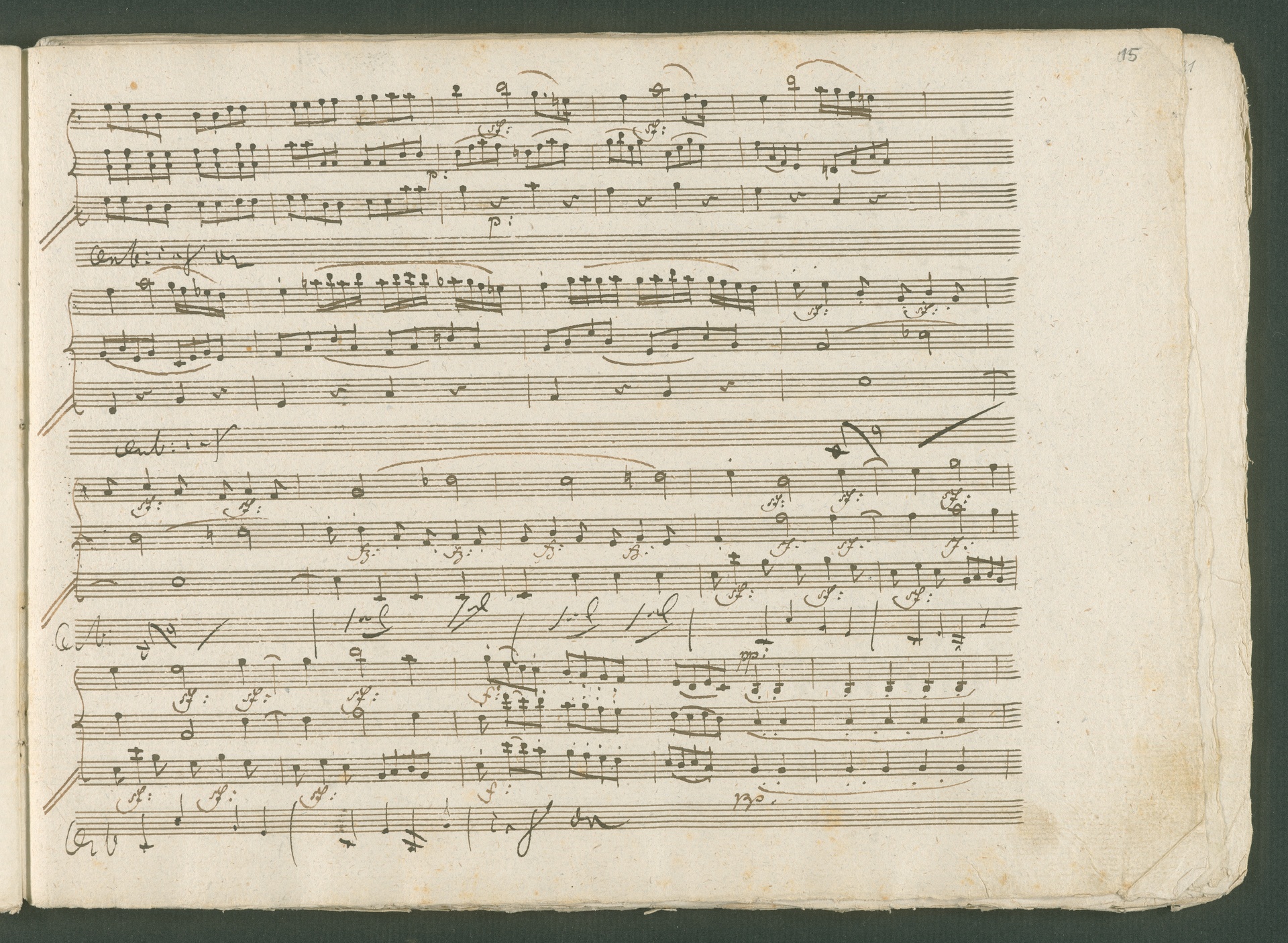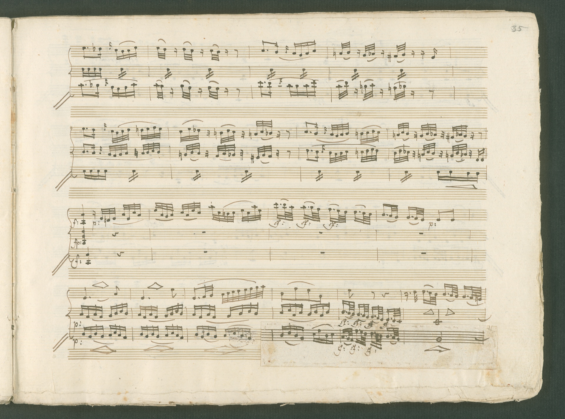 Here you can see a corrected copy of the String Trio op. 3. However, Beethoven's remarks can only be found up to page 19 - all subsequent pages do not contain any corrections or comments in the composer's hand. The copyist had notated the three stringed instruments in the score and joined them together using an accolade, leaving a stave free underneath each accolade. Beethoven made use of these free lines in the first movement and the first 44 bars of the second movement for his comments. The background to these corrections has not been explained up to now. In the first bar Beethoven writes: "Der Herr Violoncellist ist gebeten diesen Takt zu pausiren" (The cellist is asked to rest in this bar), he frequently adds the word "Cembalo" (harpsichord) or the abbreviation "Cemb" to his comments. It was this combination of corrections for the cello part as well as the introduction of the harpsichord (i.e. a keyboard instrument) that surprised scholars, causing them to speculate why. In 1920 Wilhelm Altmann presumed that Beethoven had wanted to rework the string trio for piano trio. It was for this reason that he notated a new cello part (in the fourth stave) and reworked the previous cello part as the left-hand part for a keyboard instrument. The right-hand harpsichord part would then have been the viola part. The viola, as an instrument in its own right, would no longer have had a part to play in this version, and the violin part would have remained unchanged. Another possibility was also considered: even the retention of all the strings would be possible. With an additional harpsichord or piano part, which Beethoven later sketched into the free staves, the copy could be a draft for piano quartet. Beethoven's real intentions remain unknown. There are both pros and cons for both models. Beethoven obviously discarded the arrangement himself, as we would otherwise have an authentic arrangement of the string trio (the arrangement for piano and cello op. 64 is not by Beethoven!) and the markings would not cease after the first two pages of the second movement. (J.R.)