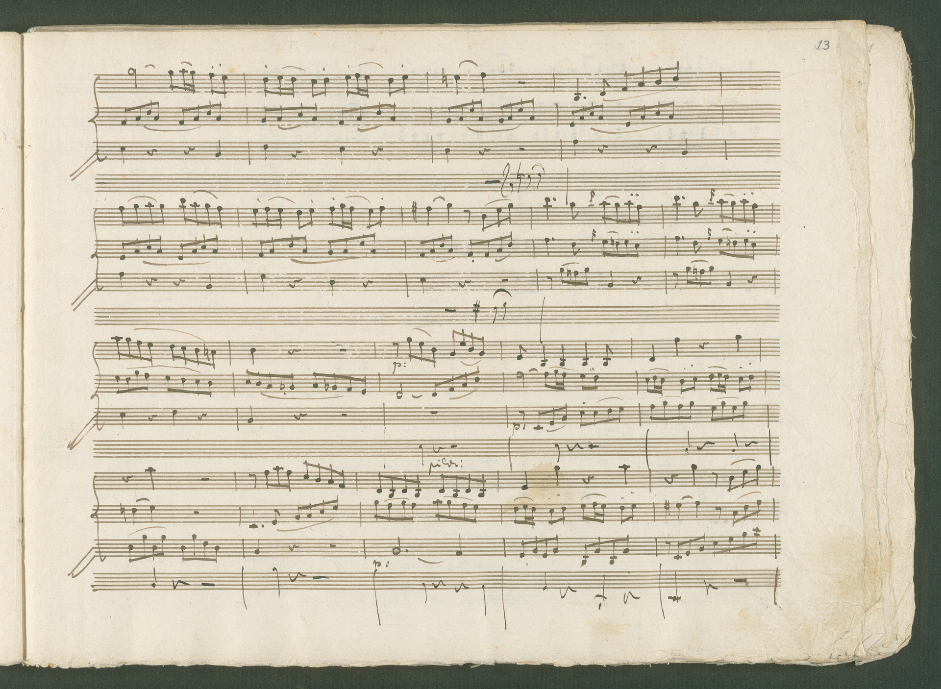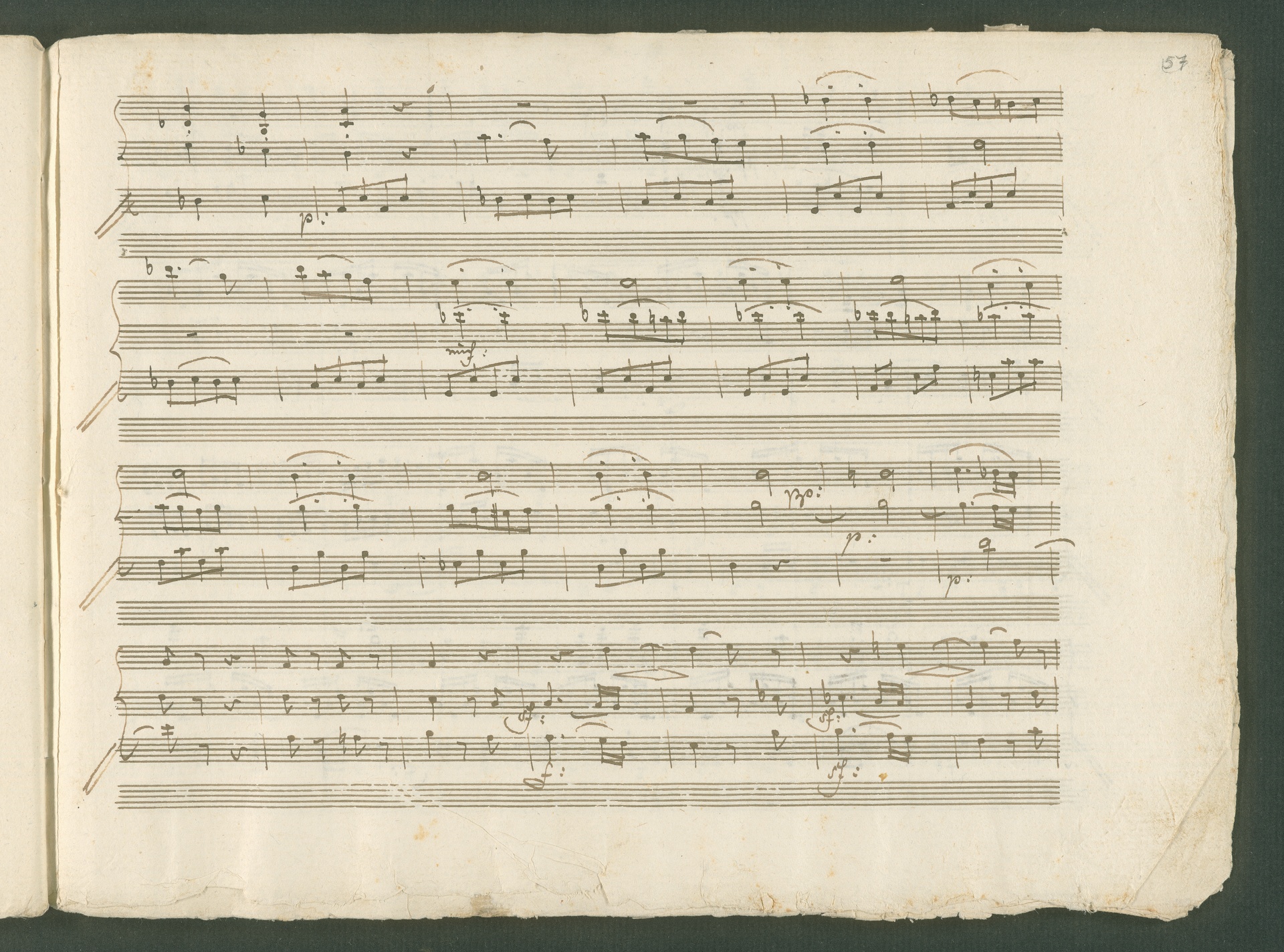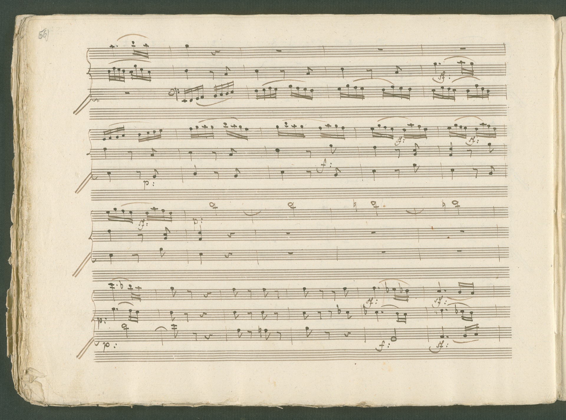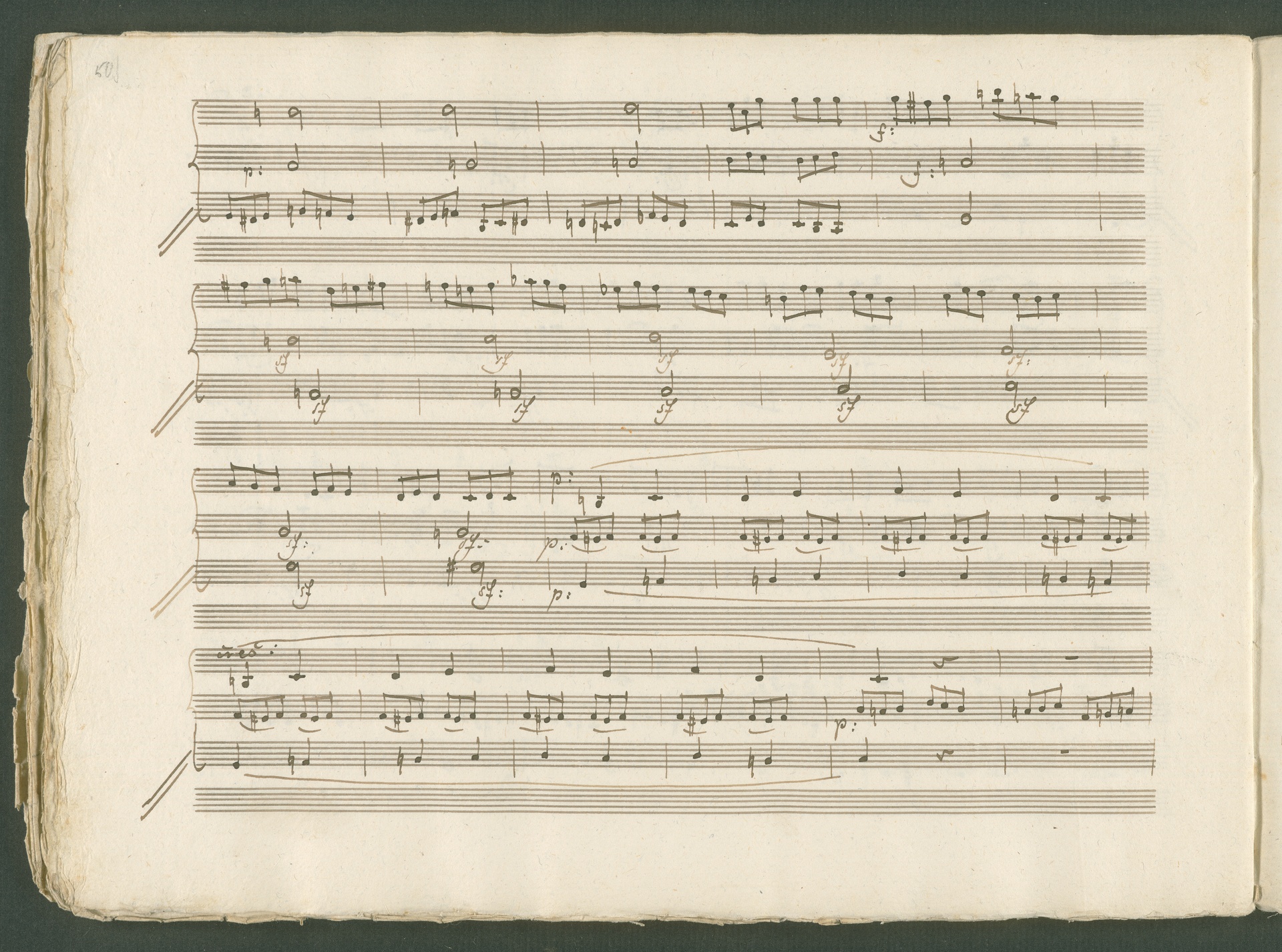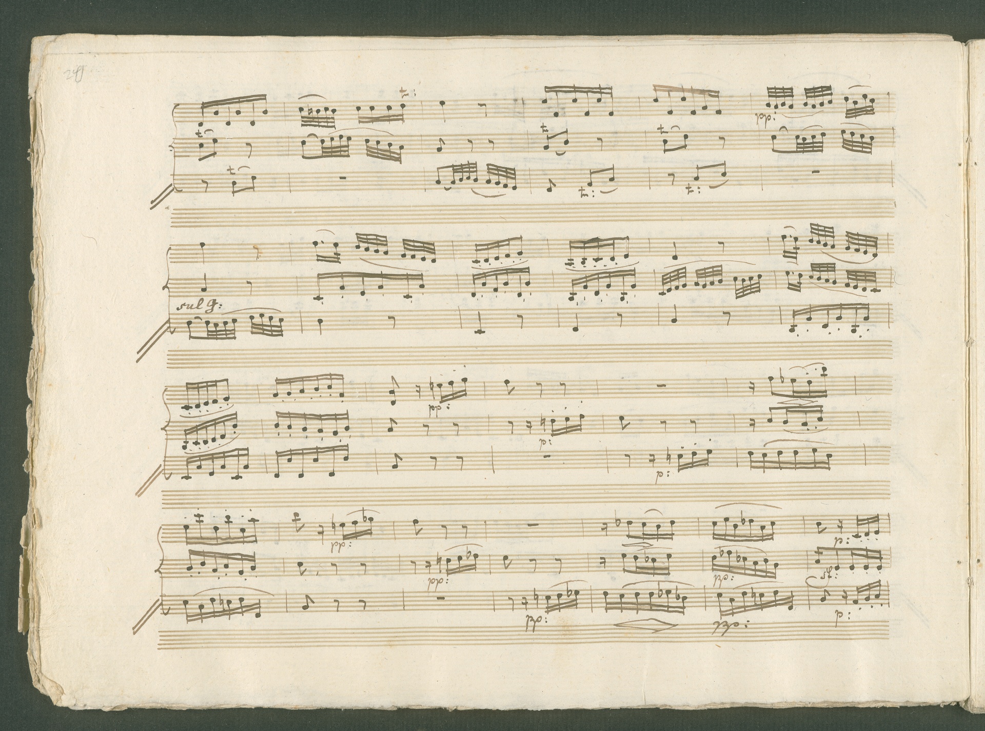 Here you can see a corrected copy of the String Trio op. 3. However, Beethoven's remarks can only be found up to page 19 - all subsequent pages do not contain any corrections or comments in the composer's hand. The copyist had notated the three stringed instruments in the score and joined them together using an accolade, leaving a stave free underneath each accolade. Beethoven made use of these free lines in the first movement and the first 44 bars of the second movement for his comments. The background to these corrections has not been explained up to now. In the first bar Beethoven writes: "Der Herr Violoncellist ist gebeten diesen Takt zu pausiren" (The cellist is asked to rest in this bar), he frequently adds the word "Cembalo" (harpsichord) or the abbreviation "Cemb" to his comments. It was this combination of corrections for the cello part as well as the introduction of the harpsichord (i.e. a keyboard instrument) that surprised scholars, causing them to speculate why. In 1920 Wilhelm Altmann presumed that Beethoven had wanted to rework the string trio for piano trio. It was for this reason that he notated a new cello part (in the fourth stave) and reworked the previous cello part as the left-hand part for a keyboard instrument. The right-hand harpsichord part would then have been the viola part. The viola, as an instrument in its own right, would no longer have had a part to play in this version, and the violin part would have remained unchanged. Another possibility was also considered: even the retention of all the strings would be possible. With an additional harpsichord or piano part, which Beethoven later sketched into the free staves, the copy could be a draft for piano quartet. Beethoven's real intentions remain unknown. There are both pros and cons for both models. Beethoven obviously discarded the arrangement himself, as we would otherwise have an authentic arrangement of the string trio (the arrangement for piano and cello op. 64 is not by Beethoven!) and the markings would not cease after the first two pages of the second movement. (J.R.)