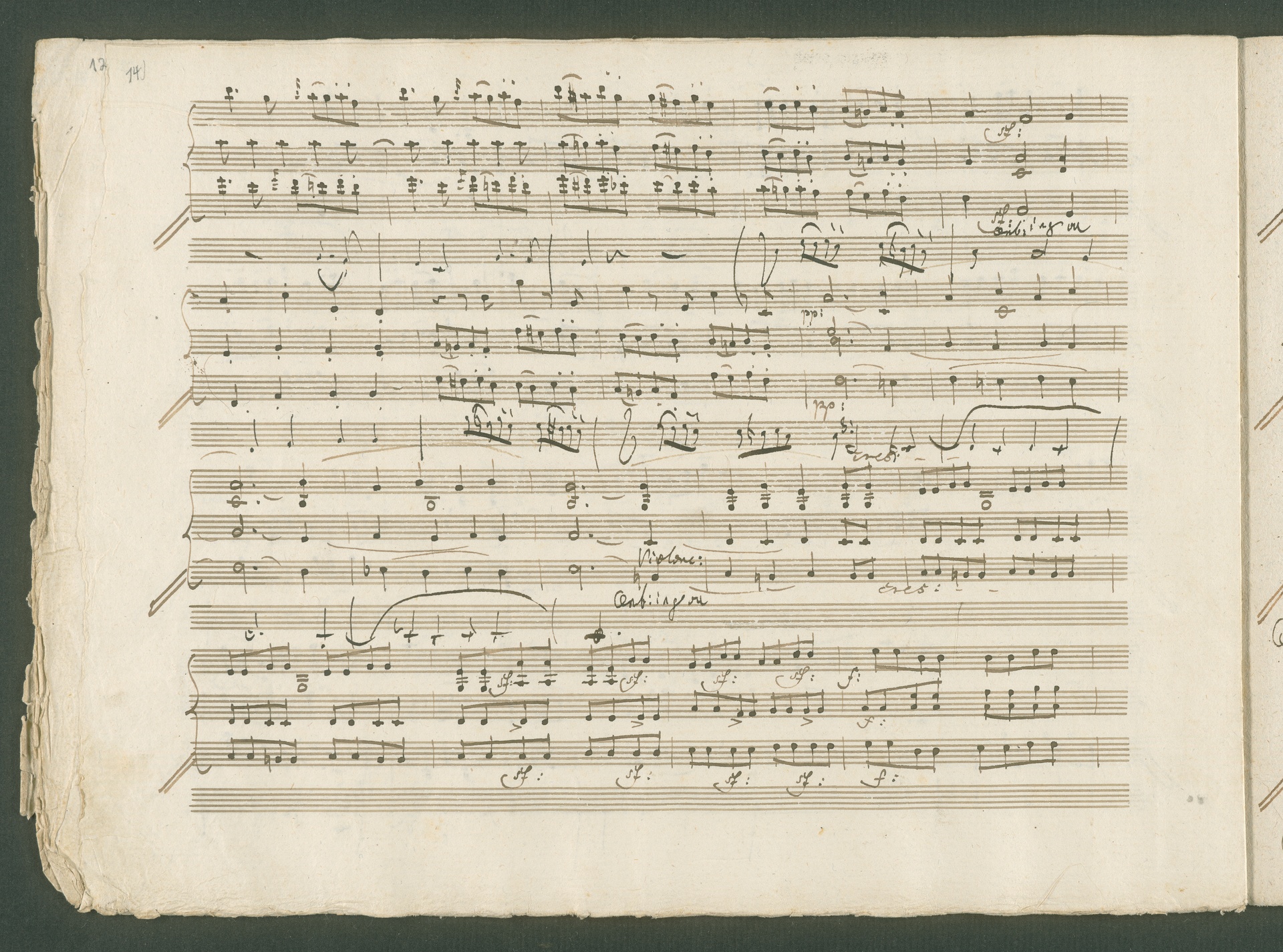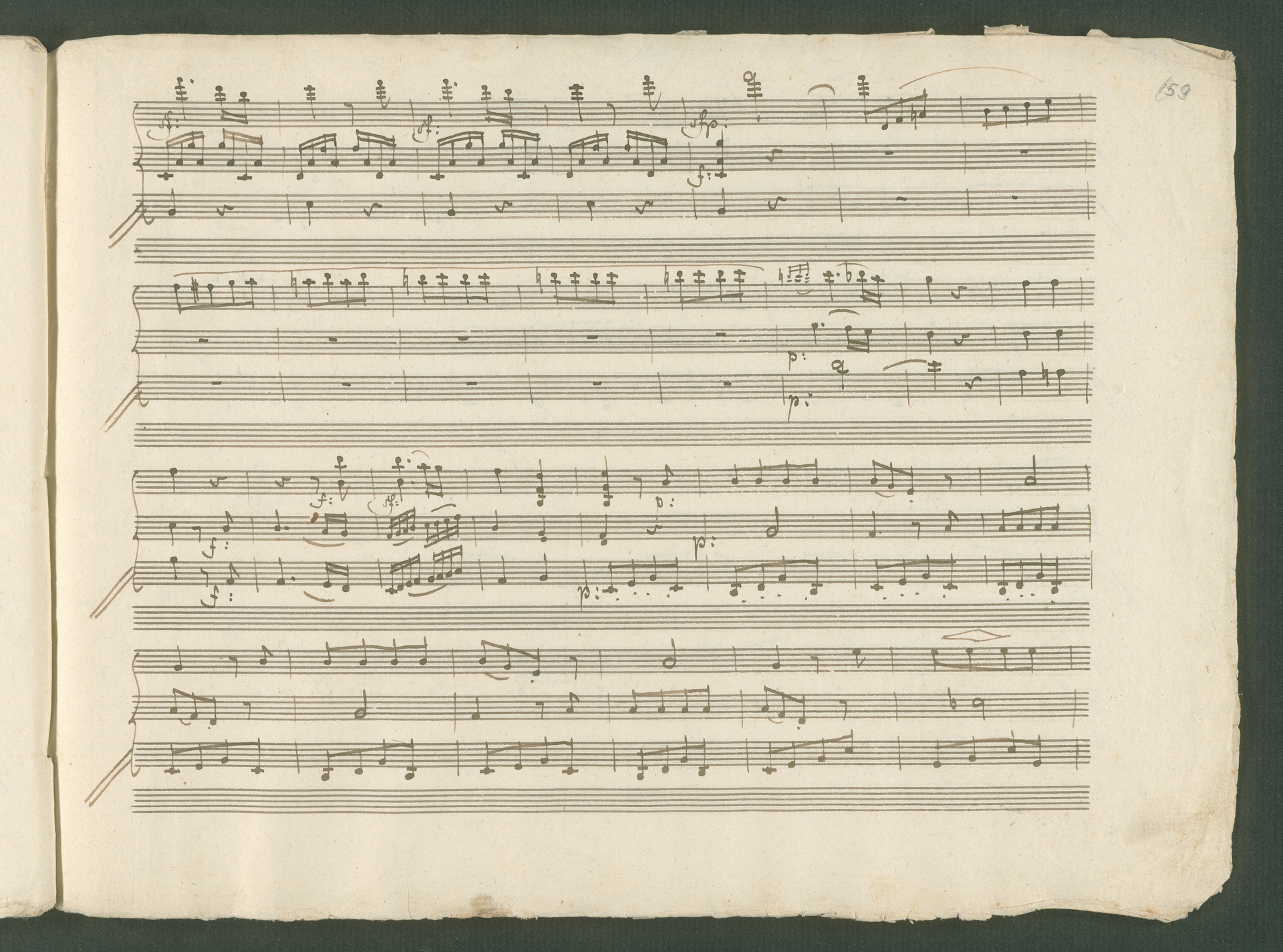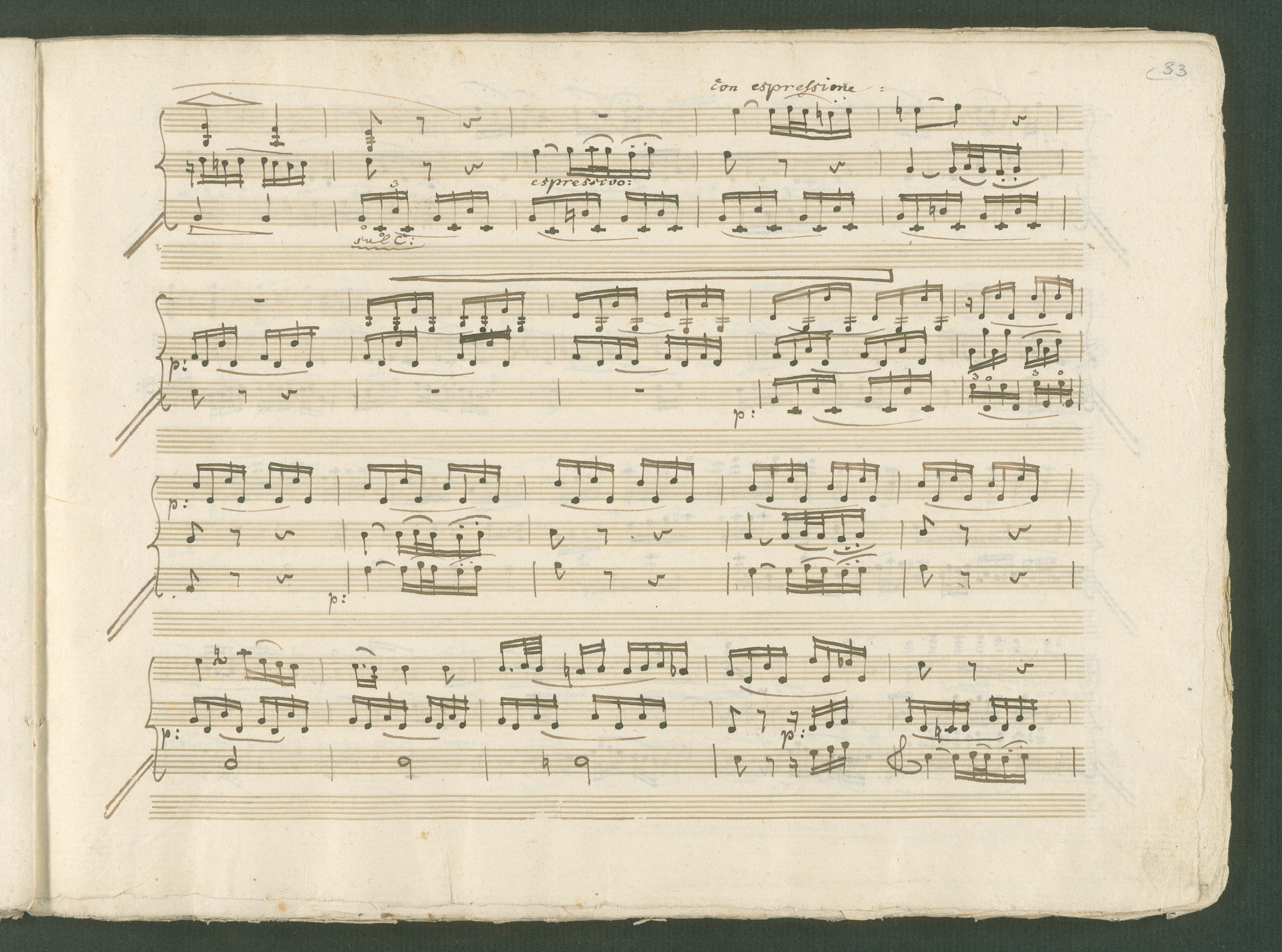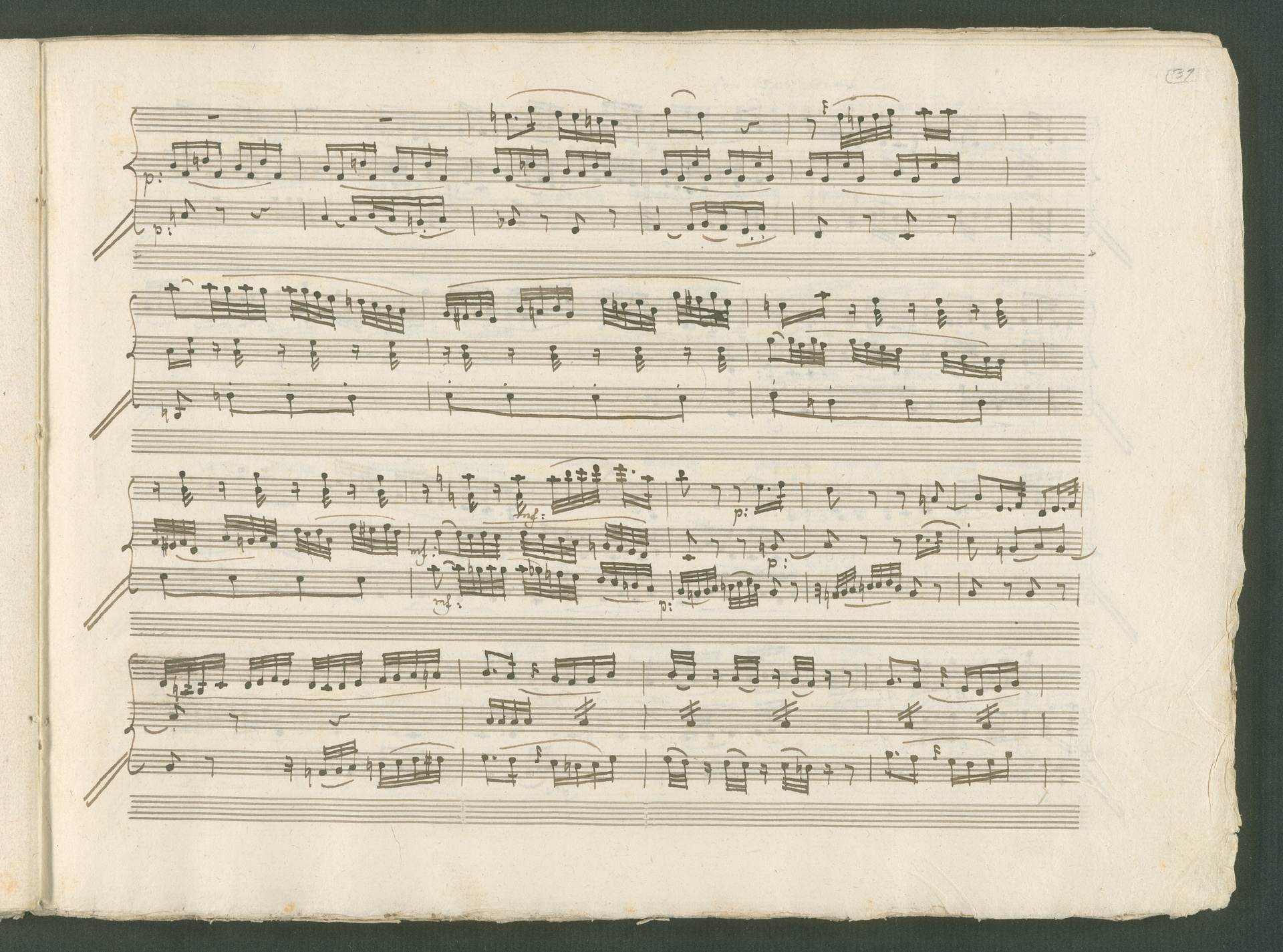Here you can see a corrected copy of the String Trio op. 3. However, Beethoven's remarks can only be found up to page 19 - all subsequent pages do not contain any corrections or comments in the composer's hand. The copyist had notated the three stringed instruments in the score and joined them together using an accolade, leaving a stave free underneath each accolade. Beethoven made use of these free lines in the first movement and the first 44 bars of the second movement for his comments. The background to these corrections has not been explained up to now. In the first bar Beethoven writes: "Der Herr Violoncellist ist gebeten diesen Takt zu pausiren" (The cellist is asked to rest in this bar), he frequently adds the word "Cembalo" (harpsichord) or the abbreviation "Cemb" to his comments. It was this combination of corrections for the cello part as well as the introduction of the harpsichord (i.e. a keyboard instrument) that surprised scholars, causing them to speculate why. In 1920 Wilhelm Altmann presumed that Beethoven had wanted to rework the string trio for piano trio. It was for this reason that he notated a new cello part (in the fourth stave) and reworked the previous cello part as the left-hand part for a keyboard instrument. The right-hand harpsichord part would then have been the viola part. The viola, as an instrument in its own right, would no longer have had a part to play in this version, and the violin part would have remained unchanged. Another possibility was also considered: even the retention of all the strings would be possible. With an additional harpsichord or piano part, which Beethoven later sketched into the free staves, the copy could be a draft for piano quartet. Beethoven's real intentions remain unknown. There are both pros and cons for both models. Beethoven obviously discarded the arrangement himself, as we would otherwise have an authentic arrangement of the string trio (the arrangement for piano and cello op. 64 is not by Beethoven!) and the markings would not cease after the first two pages of the second movement. (J.R.)
