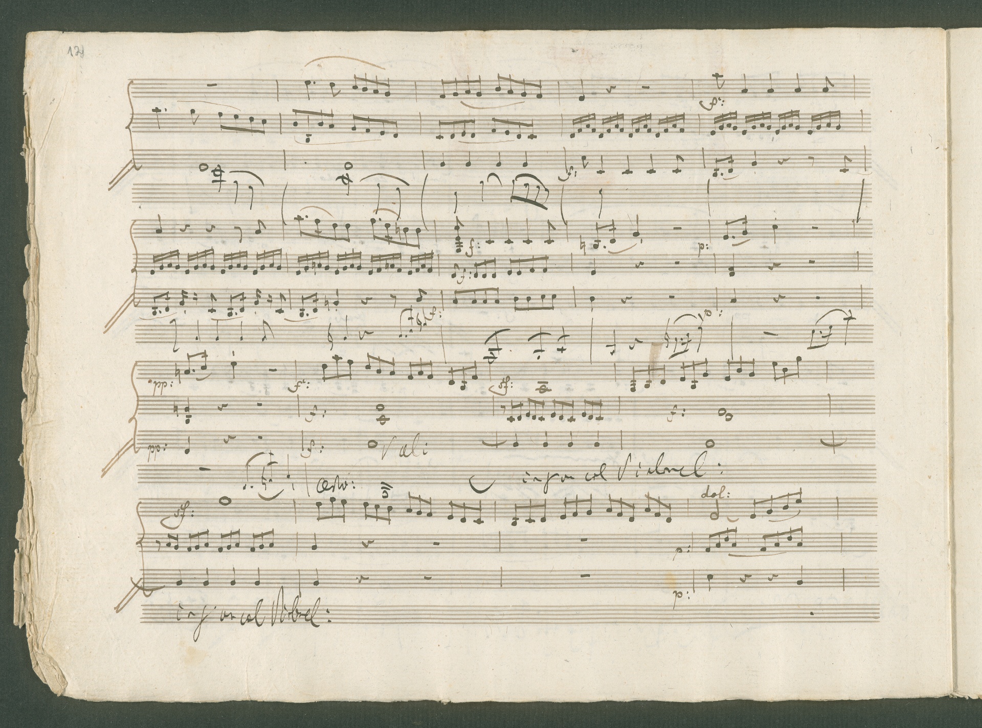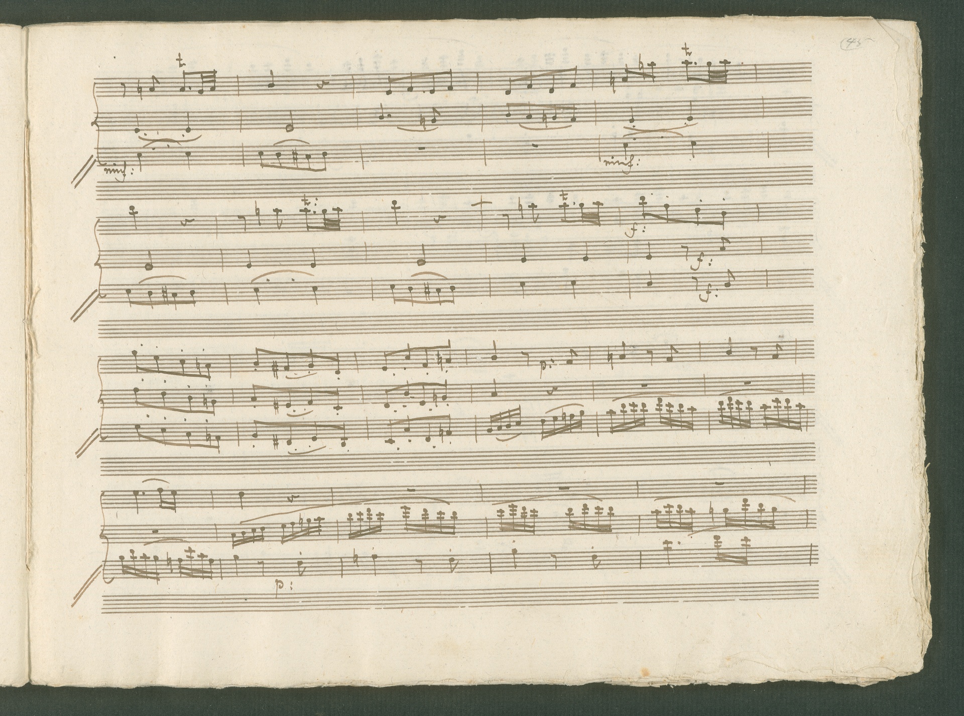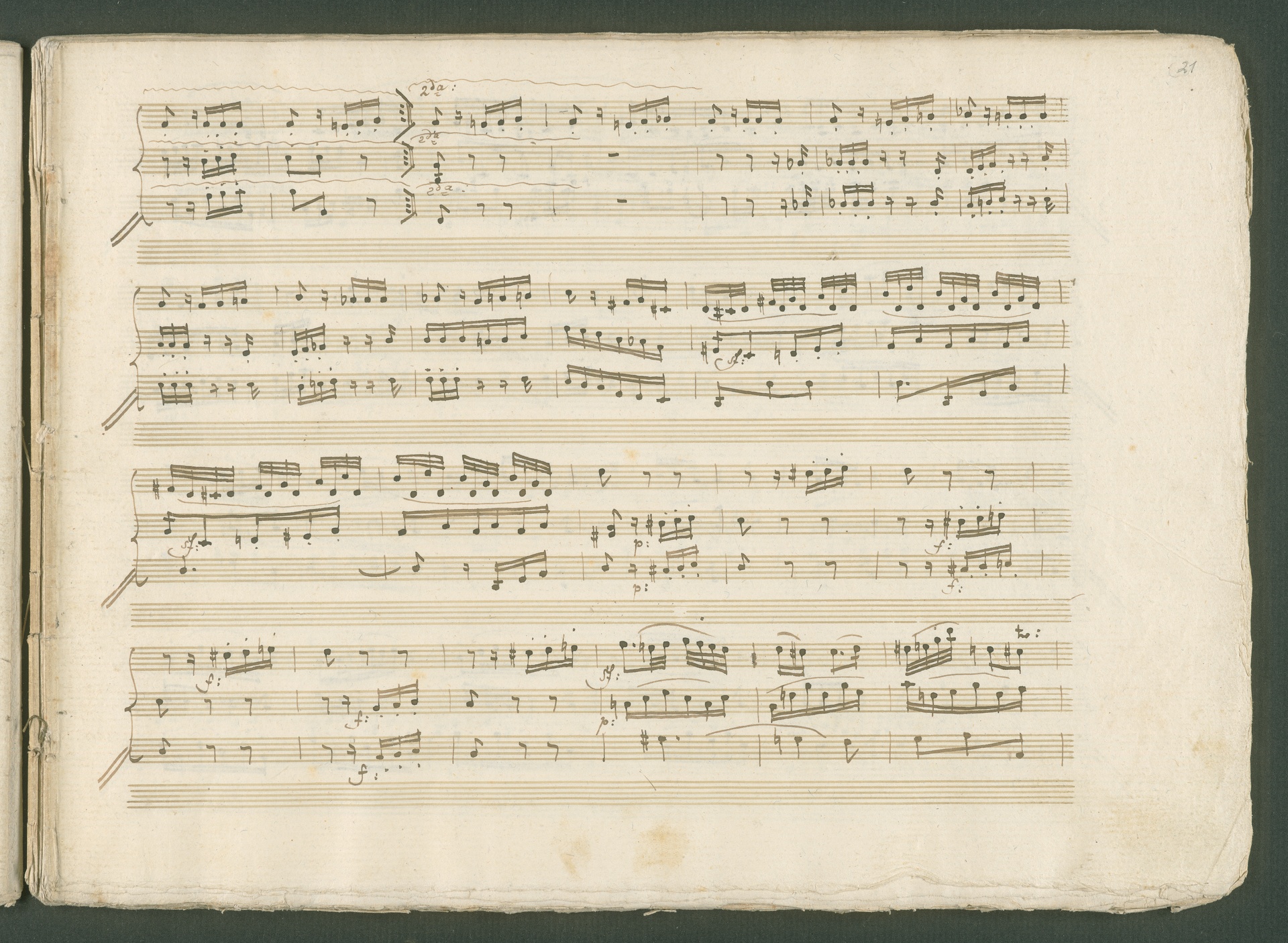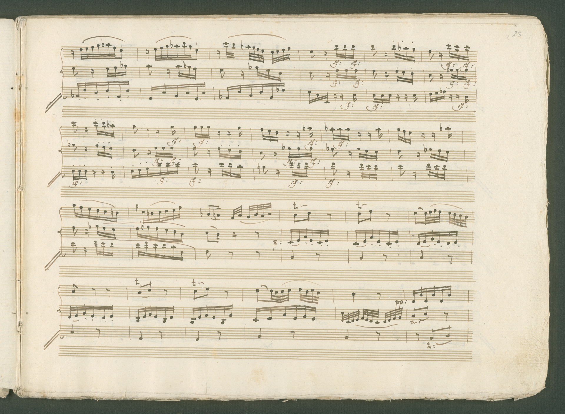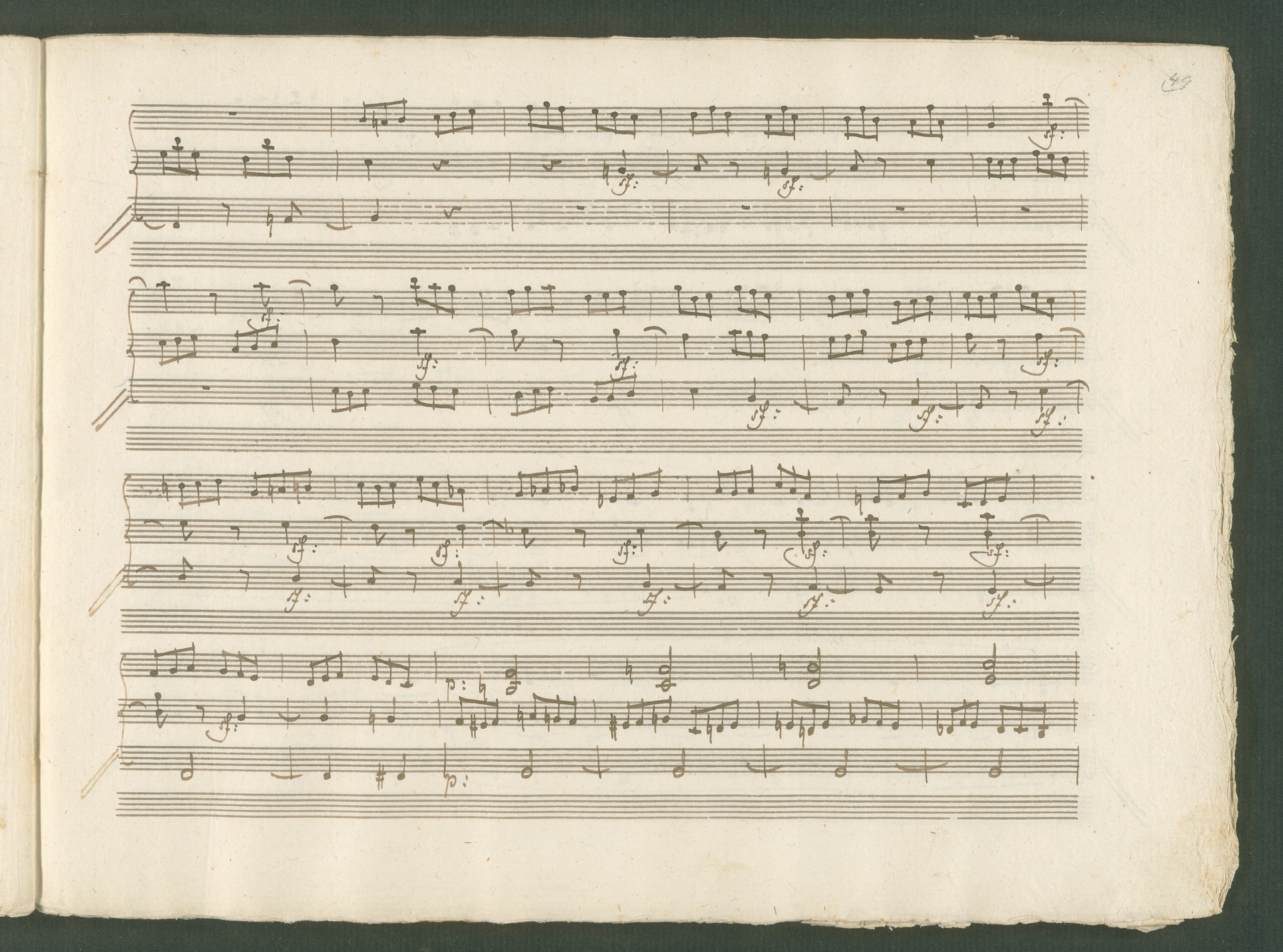 Here you can see a corrected copy of the String Trio op. 3. However, Beethoven's remarks can only be found up to page 19 - all subsequent pages do not contain any corrections or comments in the composer's hand. The copyist had notated the three stringed instruments in the score and joined them together using an accolade, leaving a stave free underneath each accolade. Beethoven made use of these free lines in the first movement and the first 44 bars of the second movement for his comments. The background to these corrections has not been explained up to now. In the first bar Beethoven writes: "Der Herr Violoncellist ist gebeten diesen Takt zu pausiren" (The cellist is asked to rest in this bar), he frequently adds the word "Cembalo" (harpsichord) or the abbreviation "Cemb" to his comments. It was this combination of corrections for the cello part as well as the introduction of the harpsichord (i.e. a keyboard instrument) that surprised scholars, causing them to speculate why. In 1920 Wilhelm Altmann presumed that Beethoven had wanted to rework the string trio for piano trio. It was for this reason that he notated a new cello part (in the fourth stave) and reworked the previous cello part as the left-hand part for a keyboard instrument. The right-hand harpsichord part would then have been the viola part. The viola, as an instrument in its own right, would no longer have had a part to play in this version, and the violin part would have remained unchanged. Another possibility was also considered: even the retention of all the strings would be possible. With an additional harpsichord or piano part, which Beethoven later sketched into the free staves, the copy could be a draft for piano quartet. Beethoven's real intentions remain unknown. There are both pros and cons for both models. Beethoven obviously discarded the arrangement himself, as we would otherwise have an authentic arrangement of the string trio (the arrangement for piano and cello op. 64 is not by Beethoven!) and the markings would not cease after the first two pages of the second movement. (J.R.)