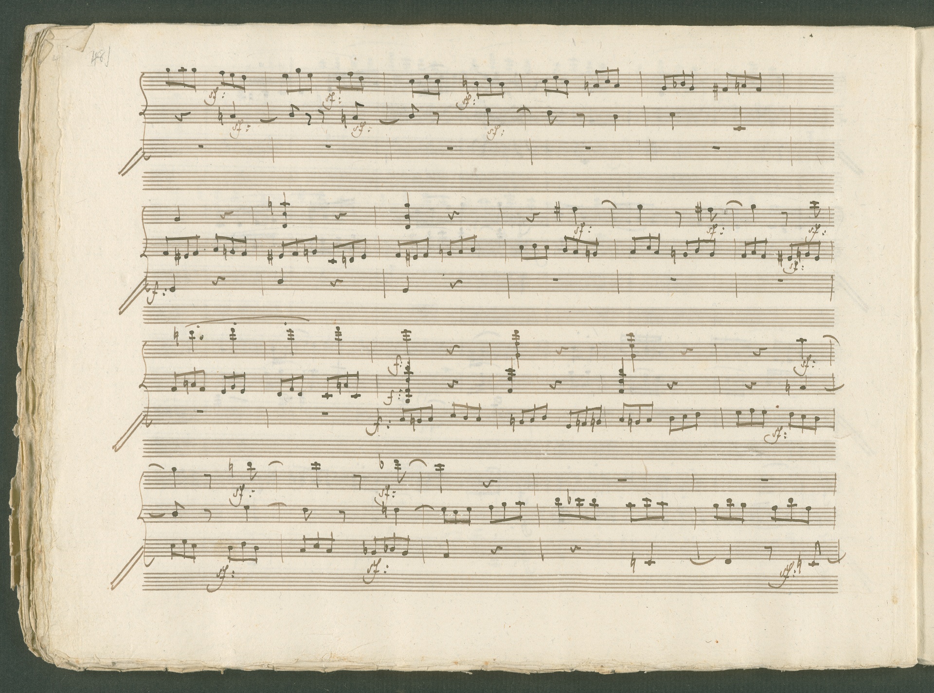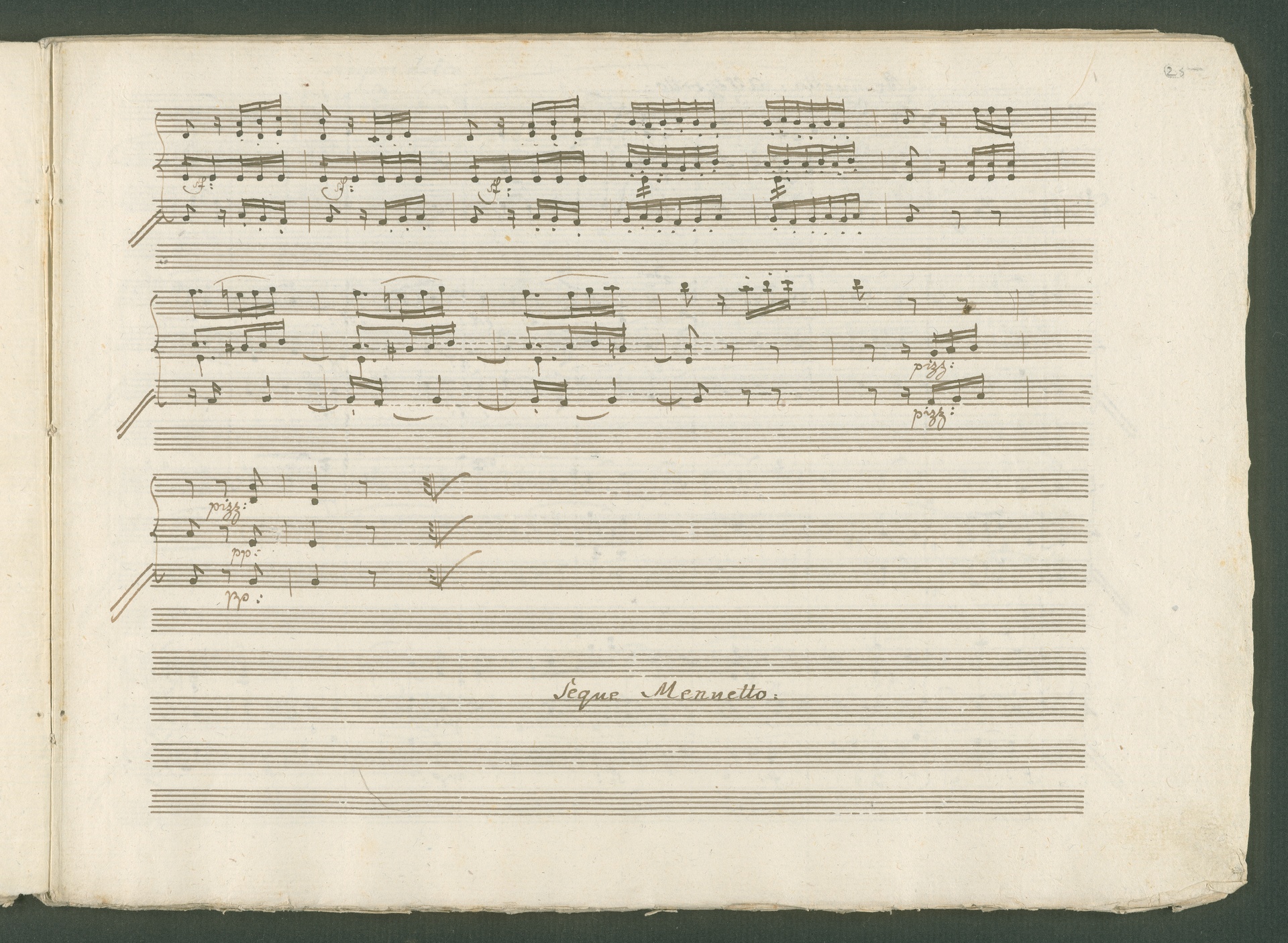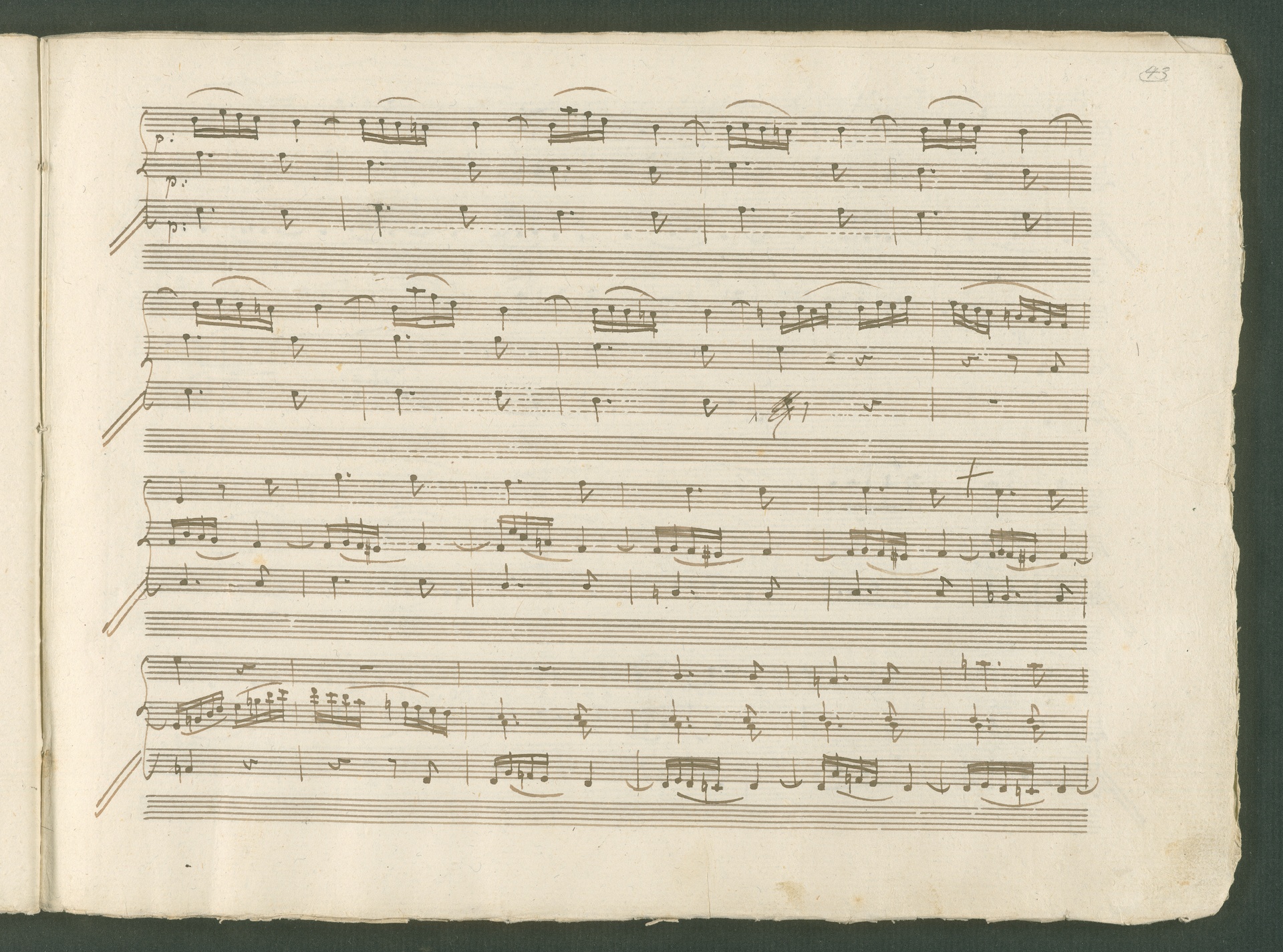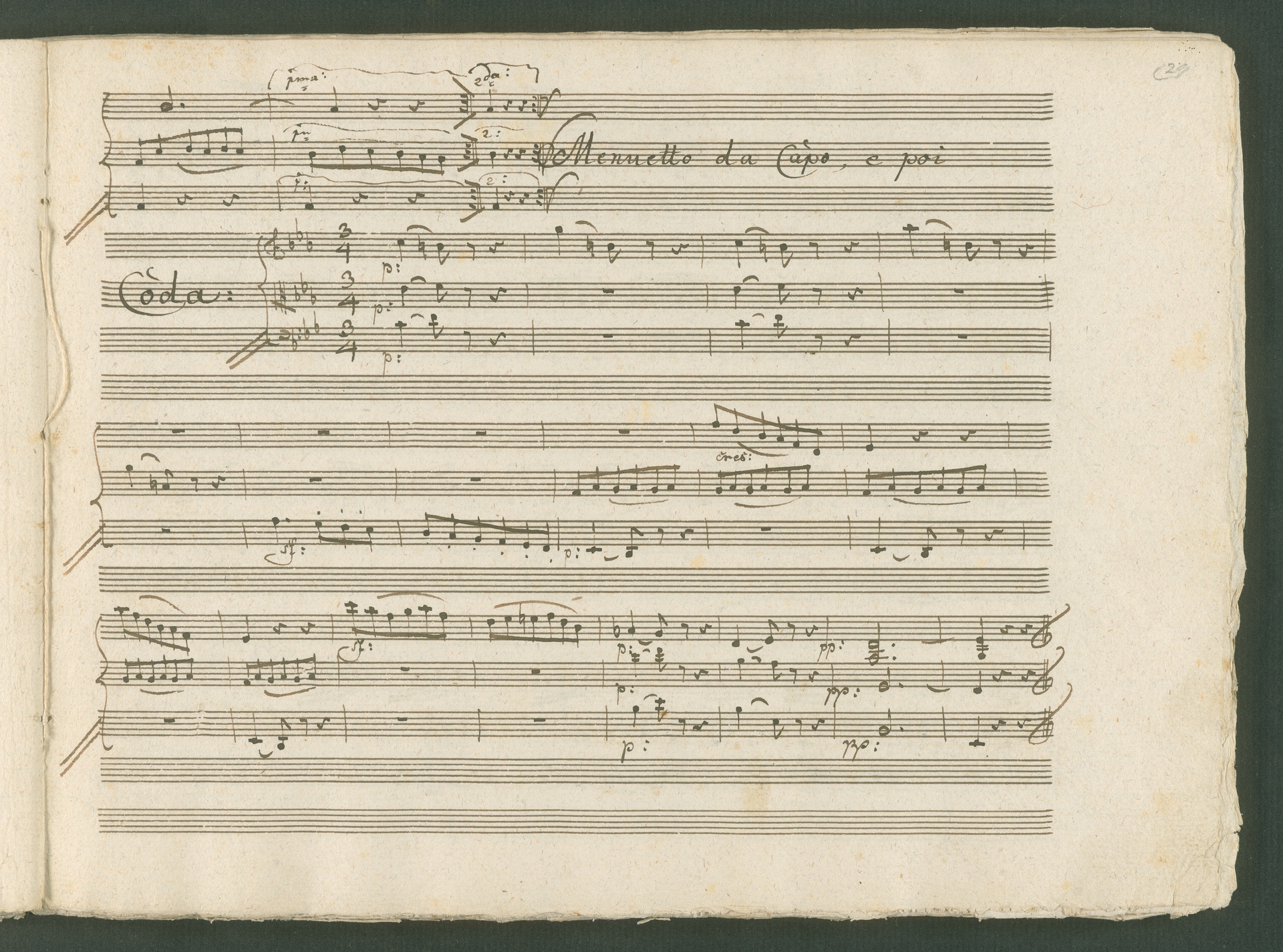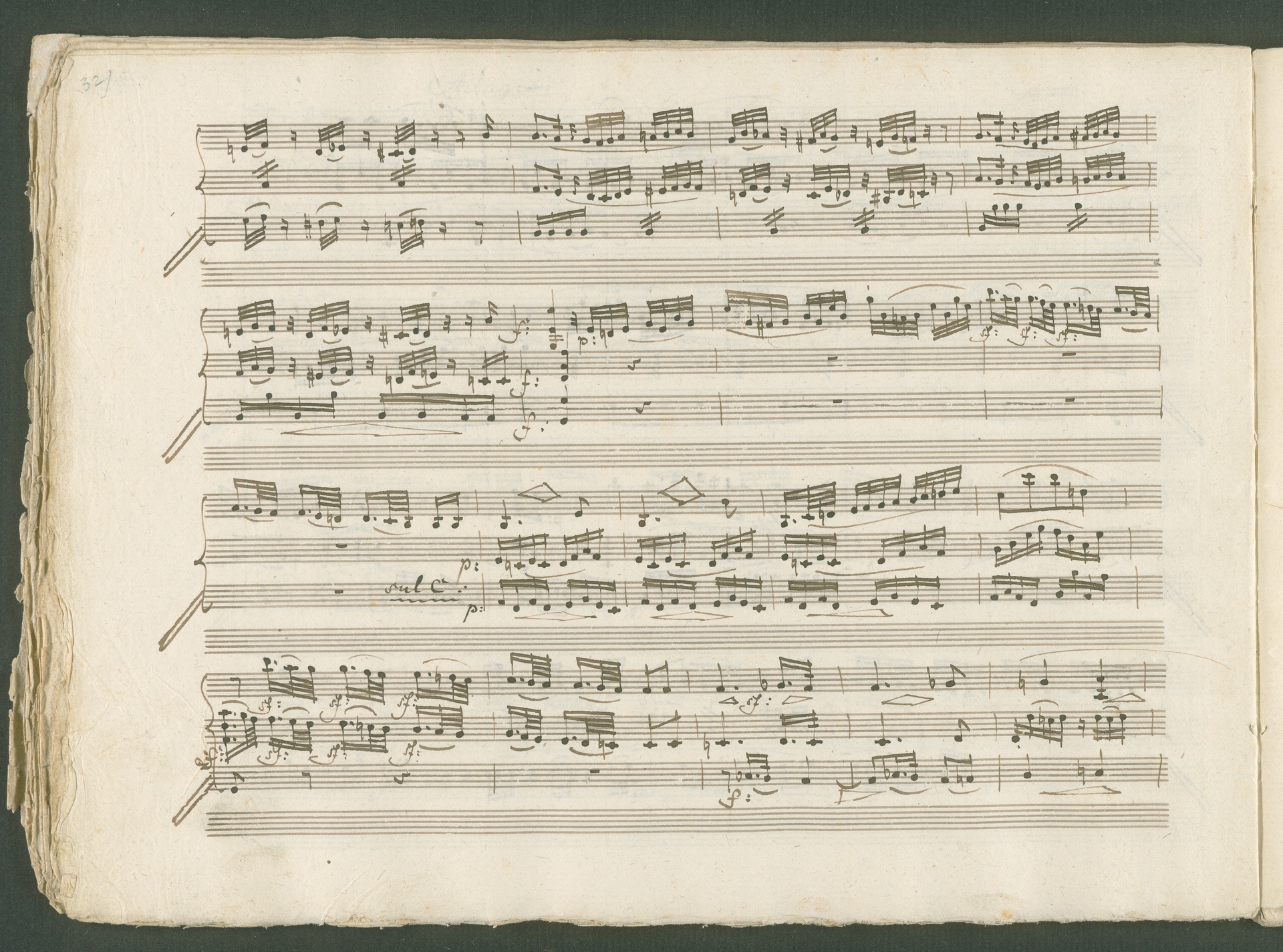 Here you can see a corrected copy of the String Trio op. 3. However, Beethoven's remarks can only be found up to page 19 - all subsequent pages do not contain any corrections or comments in the composer's hand. The copyist had notated the three stringed instruments in the score and joined them together using an accolade, leaving a stave free underneath each accolade. Beethoven made use of these free lines in the first movement and the first 44 bars of the second movement for his comments. The background to these corrections has not been explained up to now. In the first bar Beethoven writes: "Der Herr Violoncellist ist gebeten diesen Takt zu pausiren" (The cellist is asked to rest in this bar), he frequently adds the word "Cembalo" (harpsichord) or the abbreviation "Cemb" to his comments. It was this combination of corrections for the cello part as well as the introduction of the harpsichord (i.e. a keyboard instrument) that surprised scholars, causing them to speculate why. In 1920 Wilhelm Altmann presumed that Beethoven had wanted to rework the string trio for piano trio. It was for this reason that he notated a new cello part (in the fourth stave) and reworked the previous cello part as the left-hand part for a keyboard instrument. The right-hand harpsichord part would then have been the viola part. The viola, as an instrument in its own right, would no longer have had a part to play in this version, and the violin part would have remained unchanged. Another possibility was also considered: even the retention of all the strings would be possible. With an additional harpsichord or piano part, which Beethoven later sketched into the free staves, the copy could be a draft for piano quartet. Beethoven's real intentions remain unknown. There are both pros and cons for both models. Beethoven obviously discarded the arrangement himself, as we would otherwise have an authentic arrangement of the string trio (the arrangement for piano and cello op. 64 is not by Beethoven!) and the markings would not cease after the first two pages of the second movement. (J.R.)