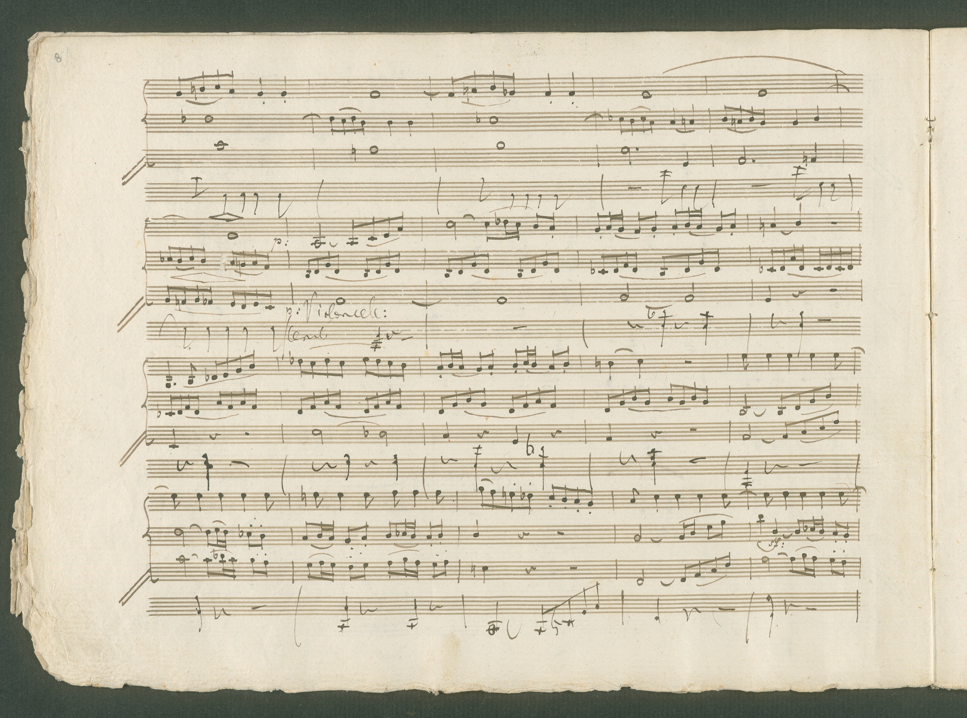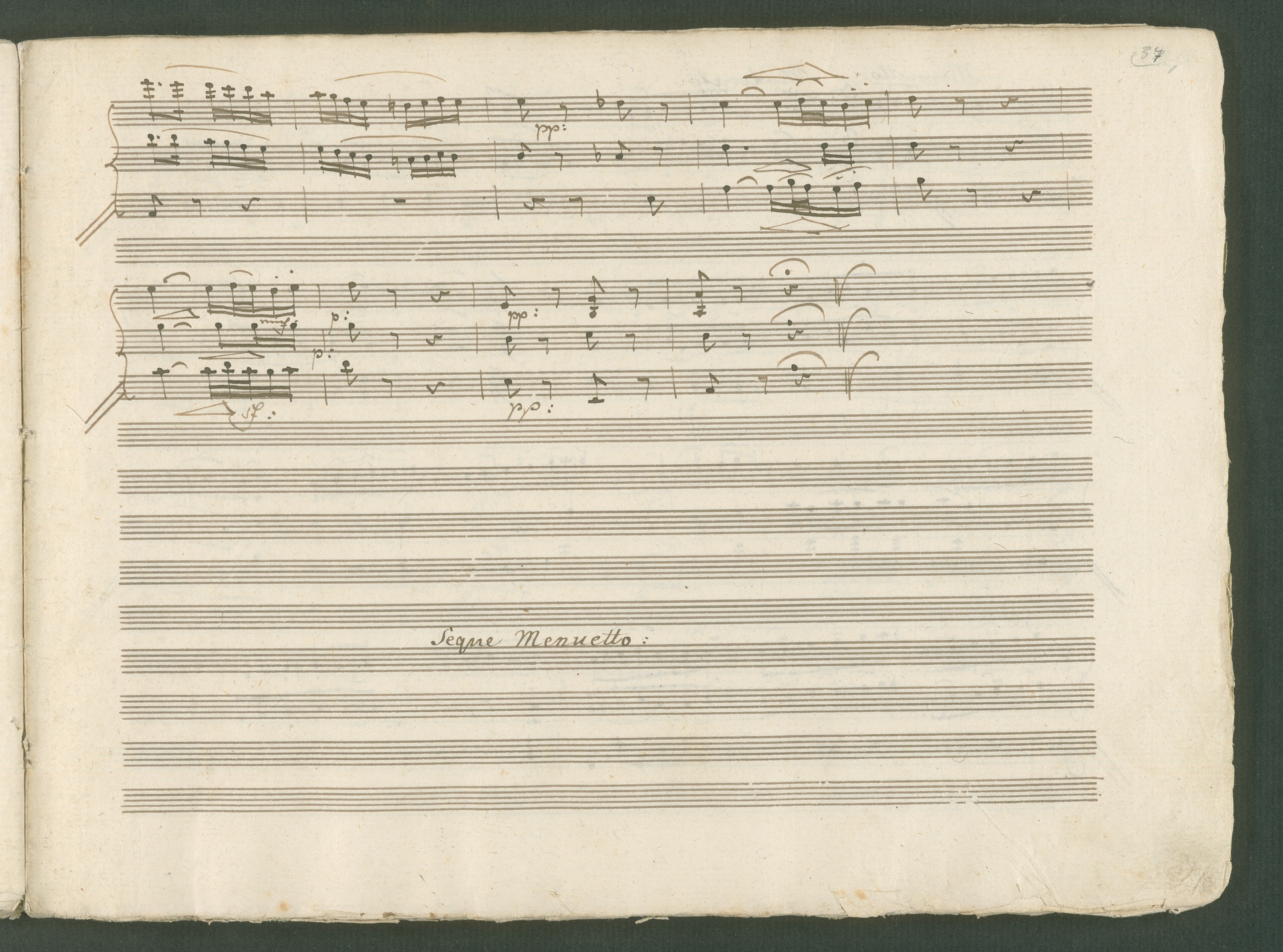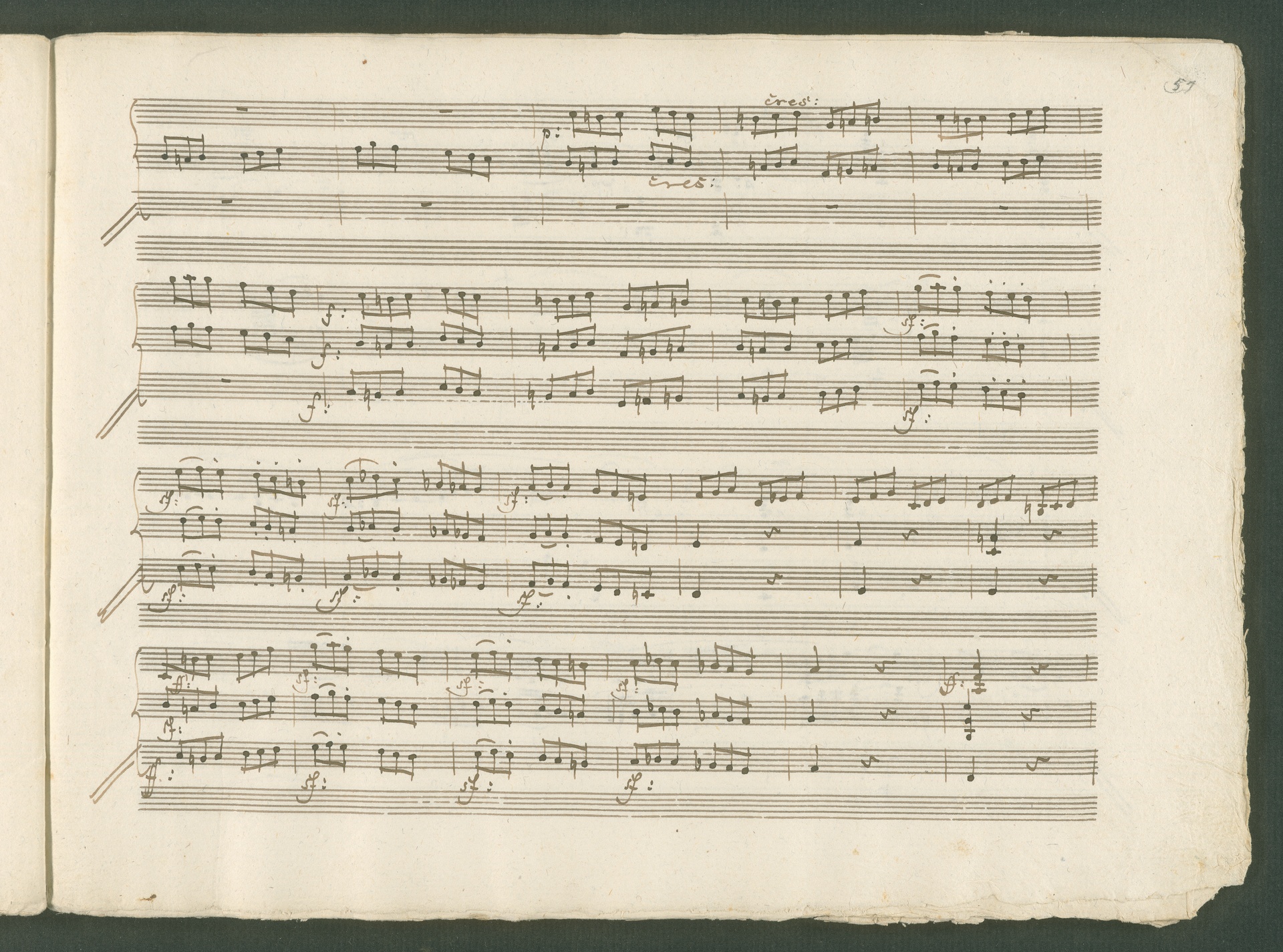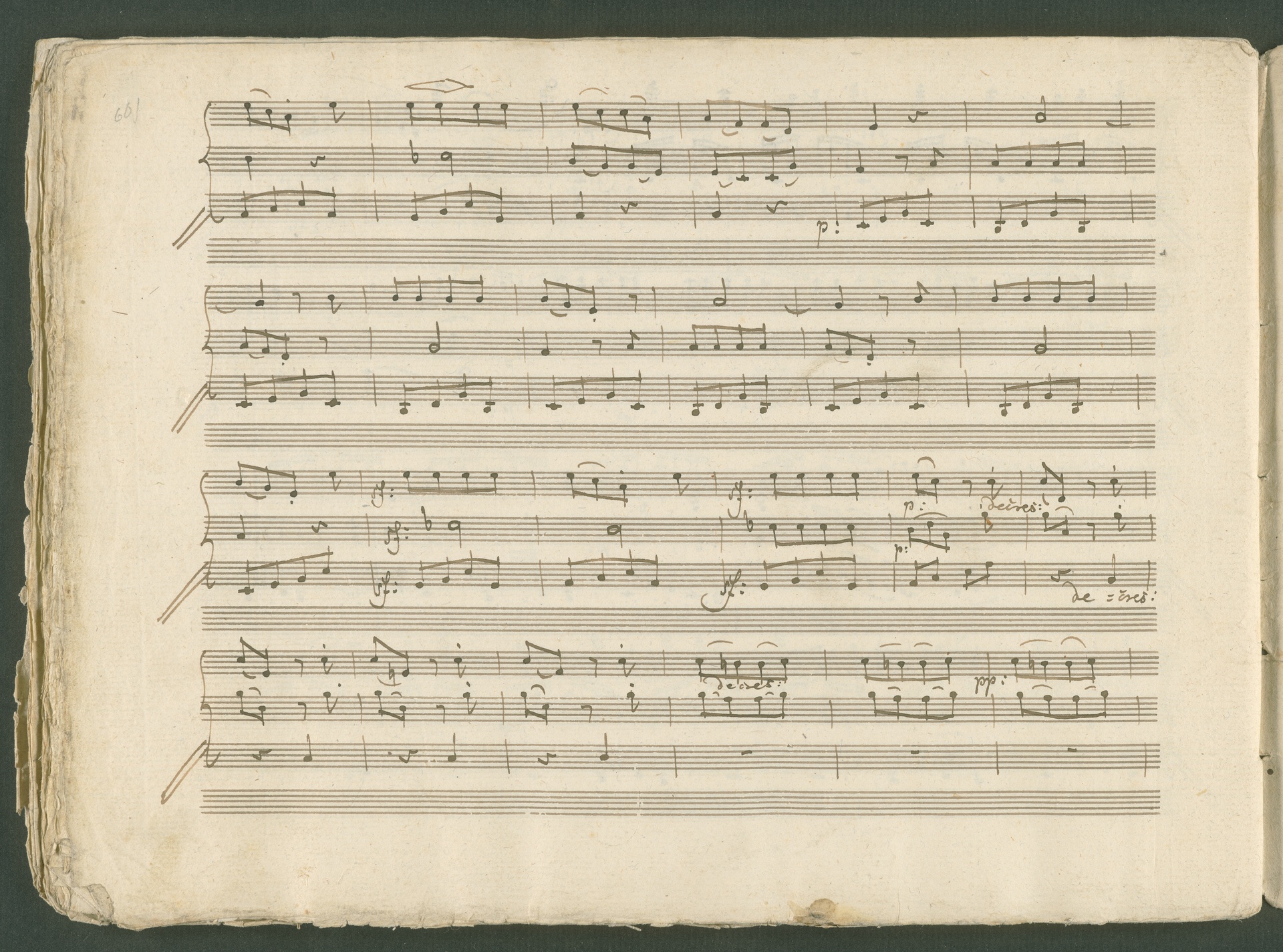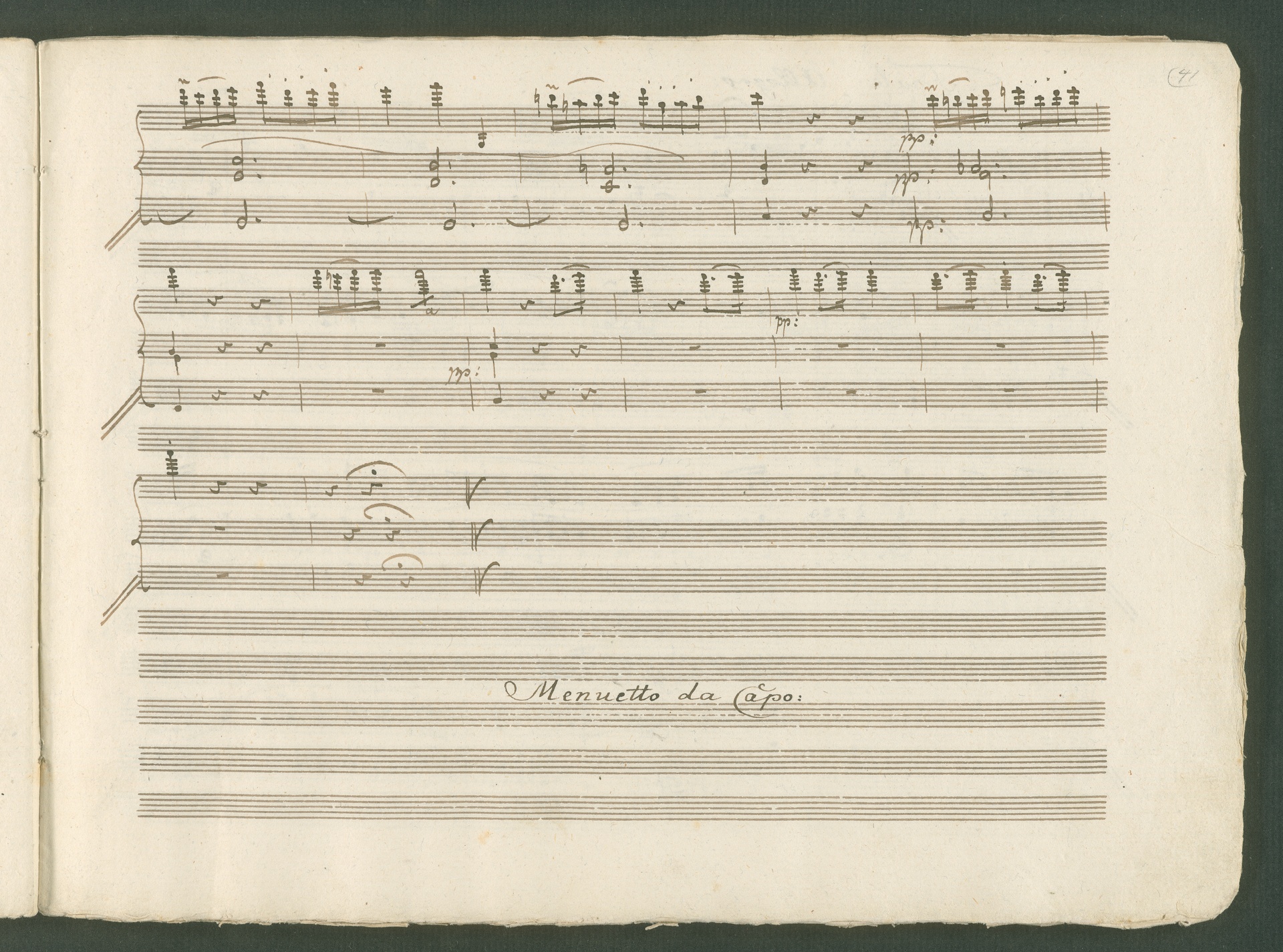 Here you can see a corrected copy of the String Trio op. 3. However, Beethoven's remarks can only be found up to page 19 - all subsequent pages do not contain any corrections or comments in the composer's hand. The copyist had notated the three stringed instruments in the score and joined them together using an accolade, leaving a stave free underneath each accolade. Beethoven made use of these free lines in the first movement and the first 44 bars of the second movement for his comments. The background to these corrections has not been explained up to now. In the first bar Beethoven writes: "Der Herr Violoncellist ist gebeten diesen Takt zu pausiren" (The cellist is asked to rest in this bar), he frequently adds the word "Cembalo" (harpsichord) or the abbreviation "Cemb" to his comments. It was this combination of corrections for the cello part as well as the introduction of the harpsichord (i.e. a keyboard instrument) that surprised scholars, causing them to speculate why. In 1920 Wilhelm Altmann presumed that Beethoven had wanted to rework the string trio for piano trio. It was for this reason that he notated a new cello part (in the fourth stave) and reworked the previous cello part as the left-hand part for a keyboard instrument. The right-hand harpsichord part would then have been the viola part. The viola, as an instrument in its own right, would no longer have had a part to play in this version, and the violin part would have remained unchanged. Another possibility was also considered: even the retention of all the strings would be possible. With an additional harpsichord or piano part, which Beethoven later sketched into the free staves, the copy could be a draft for piano quartet. Beethoven's real intentions remain unknown. There are both pros and cons for both models. Beethoven obviously discarded the arrangement himself, as we would otherwise have an authentic arrangement of the string trio (the arrangement for piano and cello op. 64 is not by Beethoven!) and the markings would not cease after the first two pages of the second movement. (J.R.)