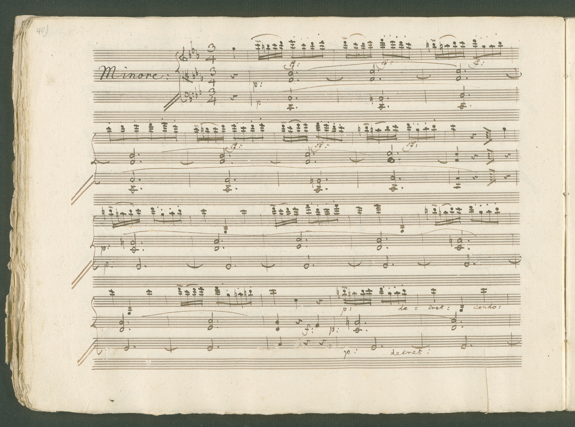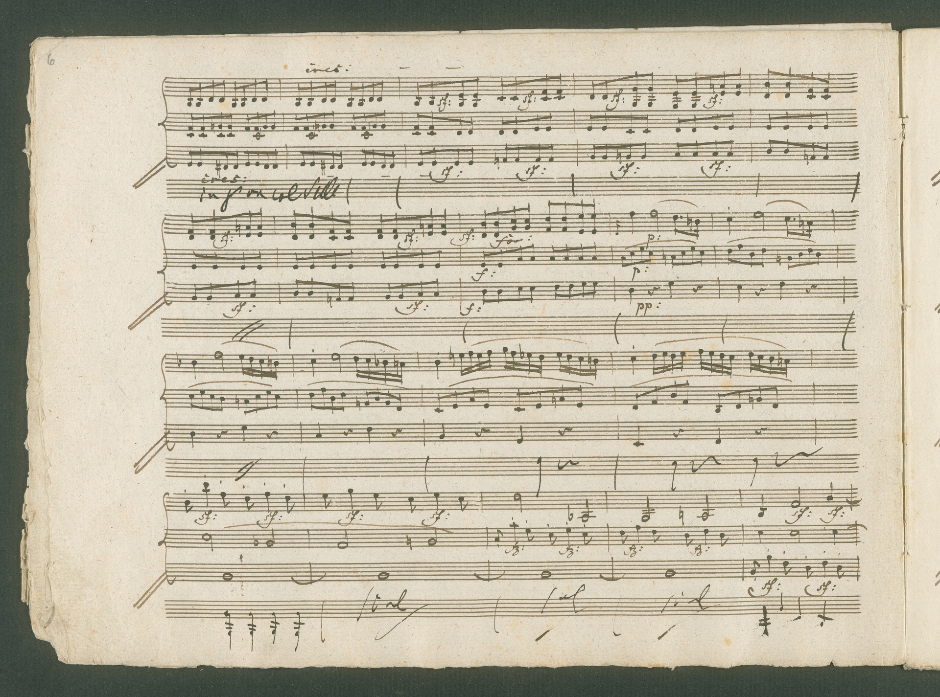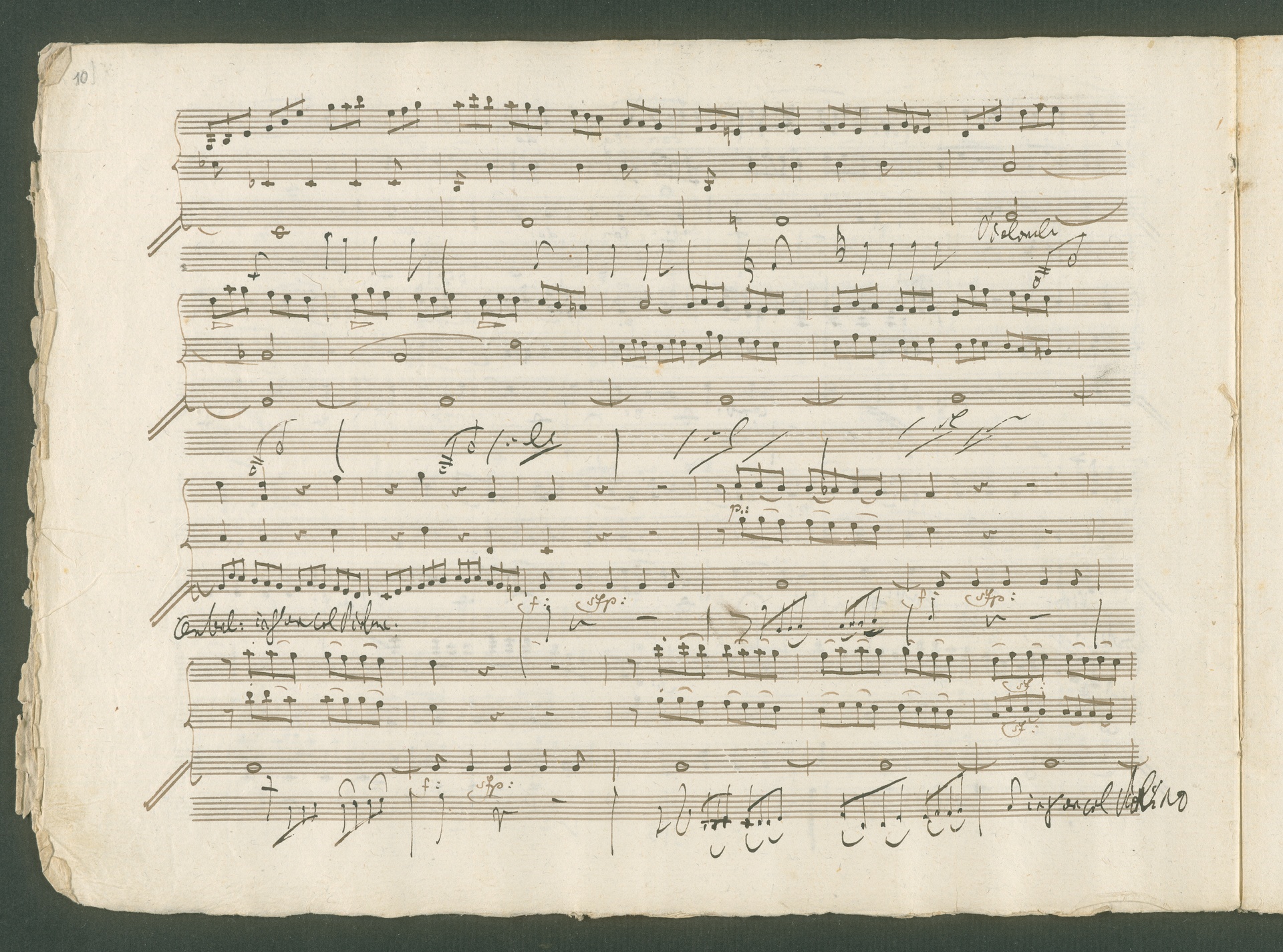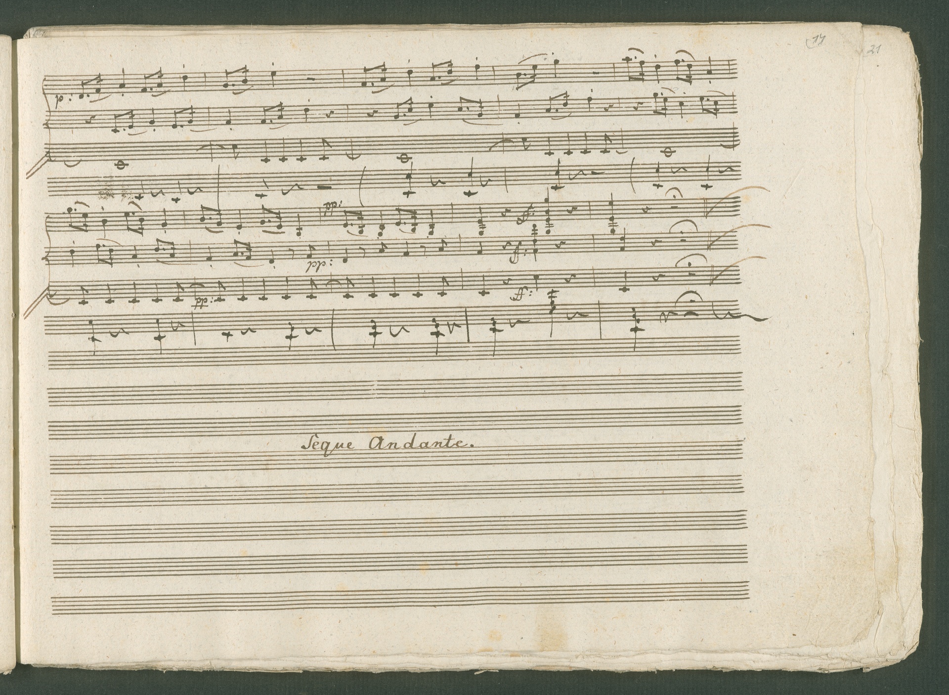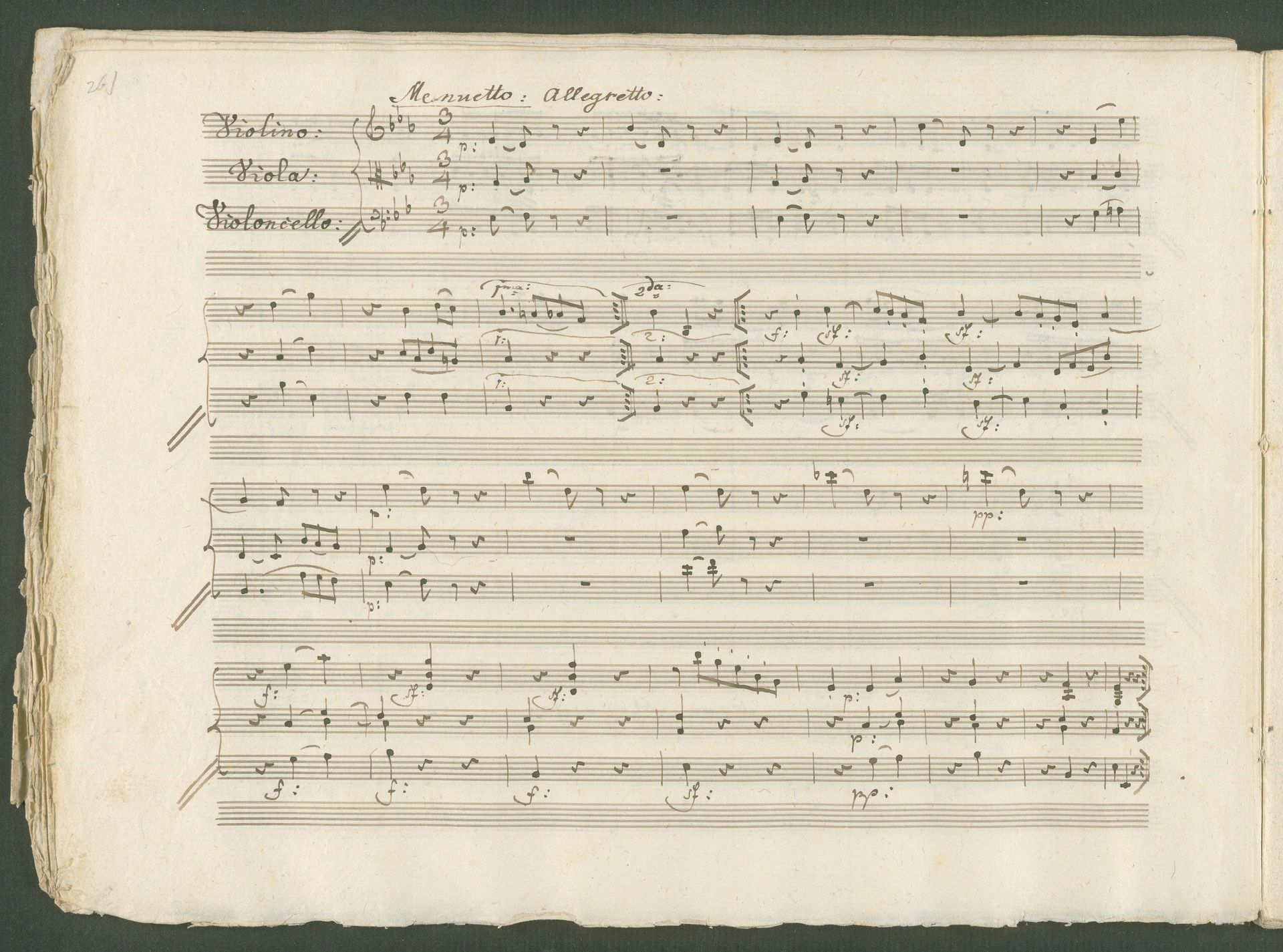 Here you can see a corrected copy of the String Trio op. 3. However, Beethoven's remarks can only be found up to page 19 - all subsequent pages do not contain any corrections or comments in the composer's hand. The copyist had notated the three stringed instruments in the score and joined them together using an accolade, leaving a stave free underneath each accolade. Beethoven made use of these free lines in the first movement and the first 44 bars of the second movement for his comments. The background to these corrections has not been explained up to now. In the first bar Beethoven writes: "Der Herr Violoncellist ist gebeten diesen Takt zu pausiren" (The cellist is asked to rest in this bar), he frequently adds the word "Cembalo" (harpsichord) or the abbreviation "Cemb" to his comments. It was this combination of corrections for the cello part as well as the introduction of the harpsichord (i.e. a keyboard instrument) that surprised scholars, causing them to speculate why. In 1920 Wilhelm Altmann presumed that Beethoven had wanted to rework the string trio for piano trio. It was for this reason that he notated a new cello part (in the fourth stave) and reworked the previous cello part as the left-hand part for a keyboard instrument. The right-hand harpsichord part would then have been the viola part. The viola, as an instrument in its own right, would no longer have had a part to play in this version, and the violin part would have remained unchanged. Another possibility was also considered: even the retention of all the strings would be possible. With an additional harpsichord or piano part, which Beethoven later sketched into the free staves, the copy could be a draft for piano quartet. Beethoven's real intentions remain unknown. There are both pros and cons for both models. Beethoven obviously discarded the arrangement himself, as we would otherwise have an authentic arrangement of the string trio (the arrangement for piano and cello op. 64 is not by Beethoven!) and the markings would not cease after the first two pages of the second movement. (J.R.)