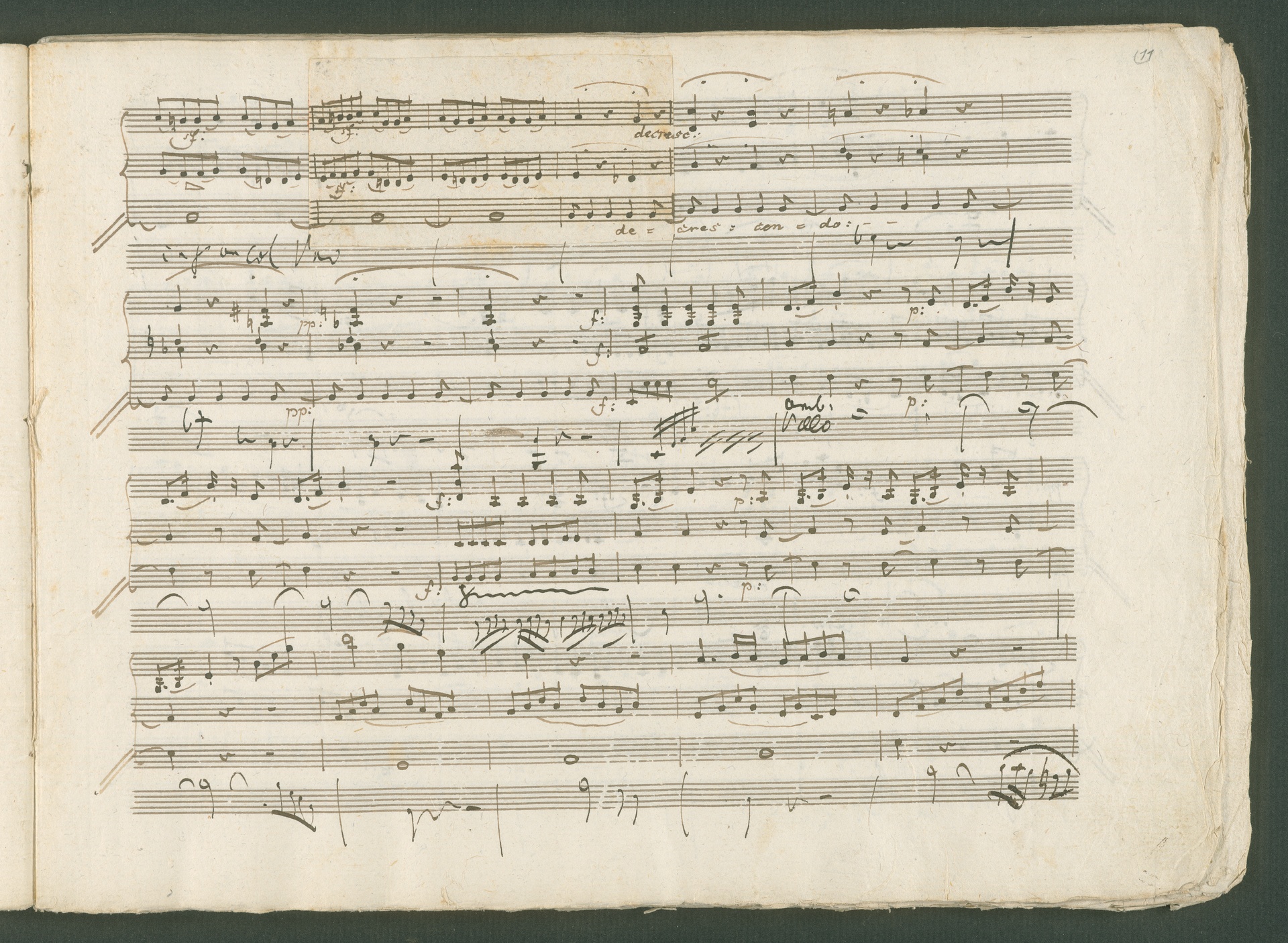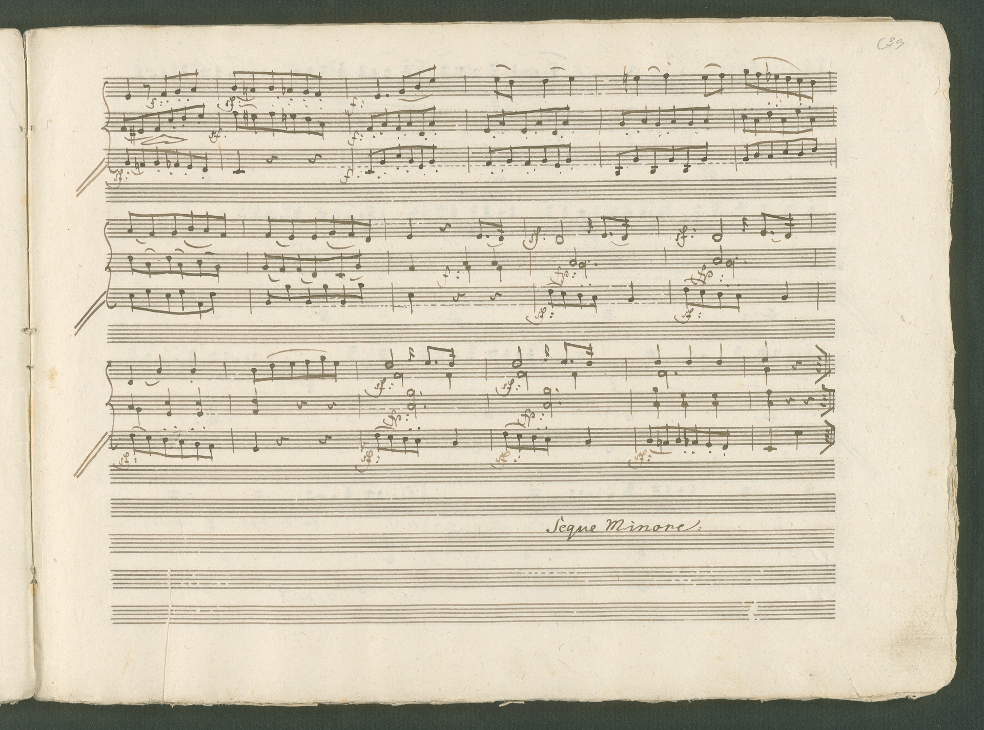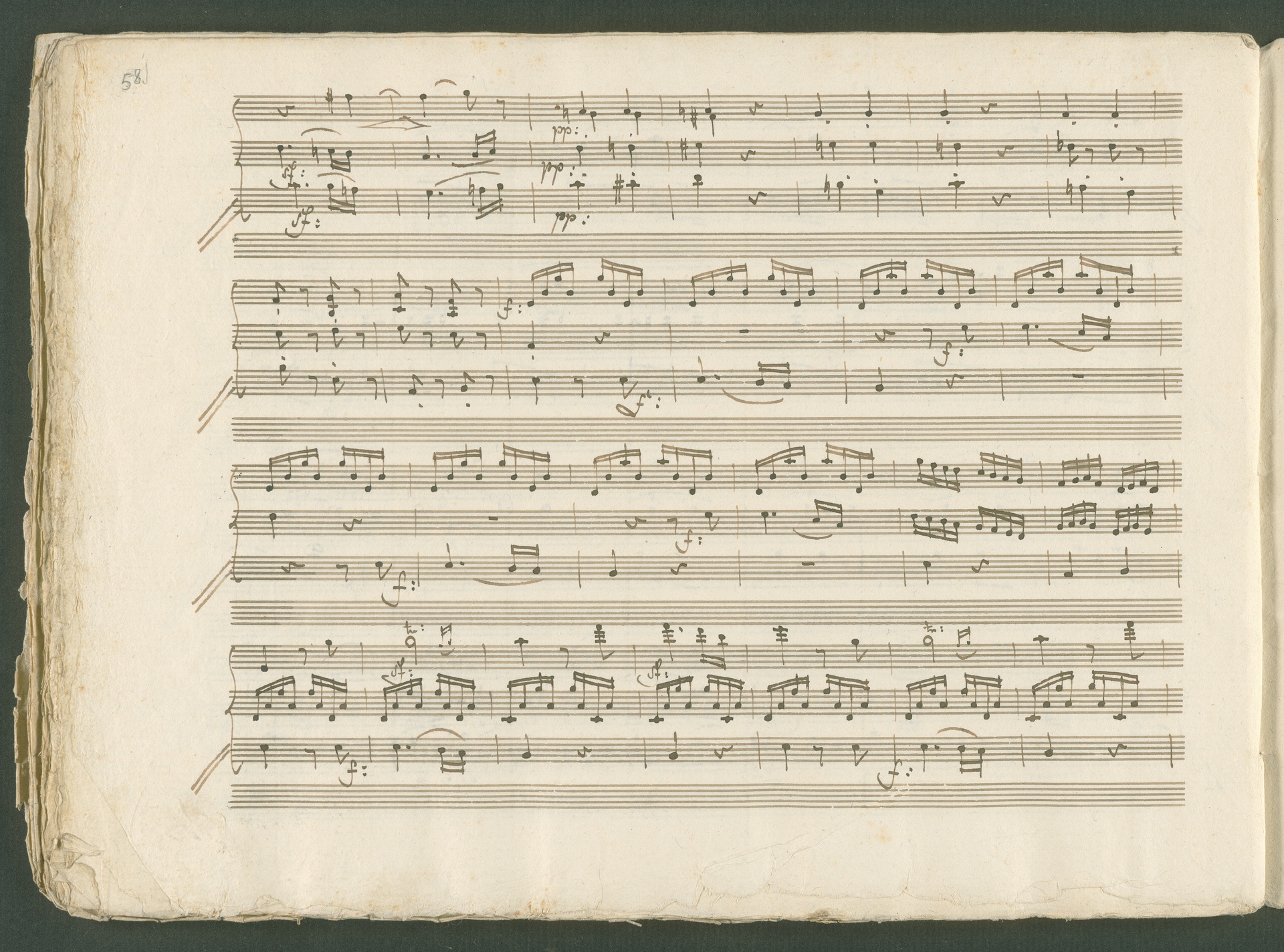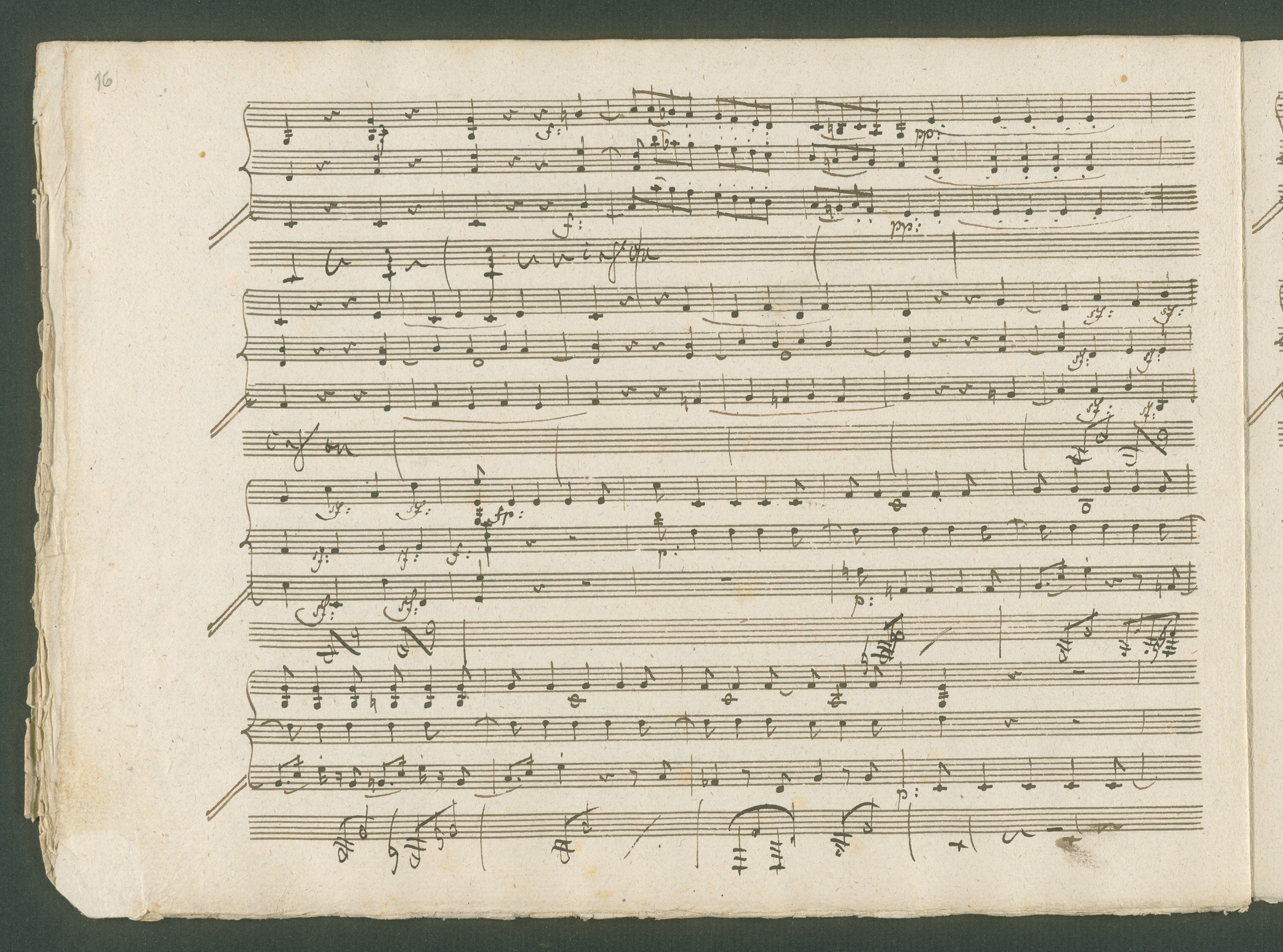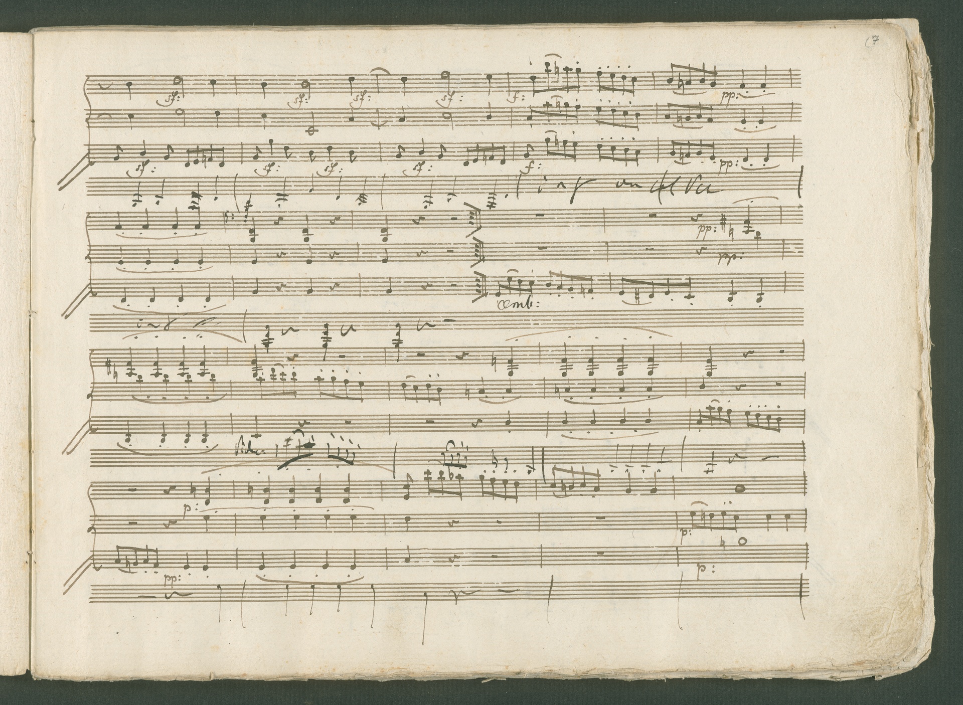 Here you can see a corrected copy of the String Trio op. 3. However, Beethoven's remarks can only be found up to page 19 - all subsequent pages do not contain any corrections or comments in the composer's hand. The copyist had notated the three stringed instruments in the score and joined them together using an accolade, leaving a stave free underneath each accolade. Beethoven made use of these free lines in the first movement and the first 44 bars of the second movement for his comments. The background to these corrections has not been explained up to now. In the first bar Beethoven writes: "Der Herr Violoncellist ist gebeten diesen Takt zu pausiren" (The cellist is asked to rest in this bar), he frequently adds the word "Cembalo" (harpsichord) or the abbreviation "Cemb" to his comments. It was this combination of corrections for the cello part as well as the introduction of the harpsichord (i.e. a keyboard instrument) that surprised scholars, causing them to speculate why. In 1920 Wilhelm Altmann presumed that Beethoven had wanted to rework the string trio for piano trio. It was for this reason that he notated a new cello part (in the fourth stave) and reworked the previous cello part as the left-hand part for a keyboard instrument. The right-hand harpsichord part would then have been the viola part. The viola, as an instrument in its own right, would no longer have had a part to play in this version, and the violin part would have remained unchanged. Another possibility was also considered: even the retention of all the strings would be possible. With an additional harpsichord or piano part, which Beethoven later sketched into the free staves, the copy could be a draft for piano quartet. Beethoven's real intentions remain unknown. There are both pros and cons for both models. Beethoven obviously discarded the arrangement himself, as we would otherwise have an authentic arrangement of the string trio (the arrangement for piano and cello op. 64 is not by Beethoven!) and the markings would not cease after the first two pages of the second movement. (J.R.)