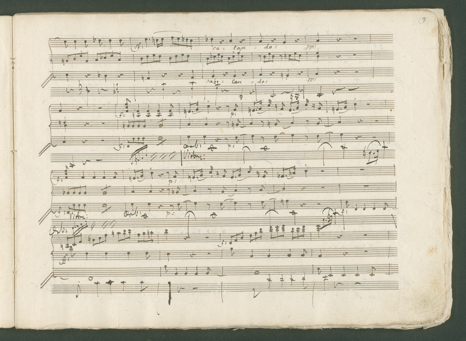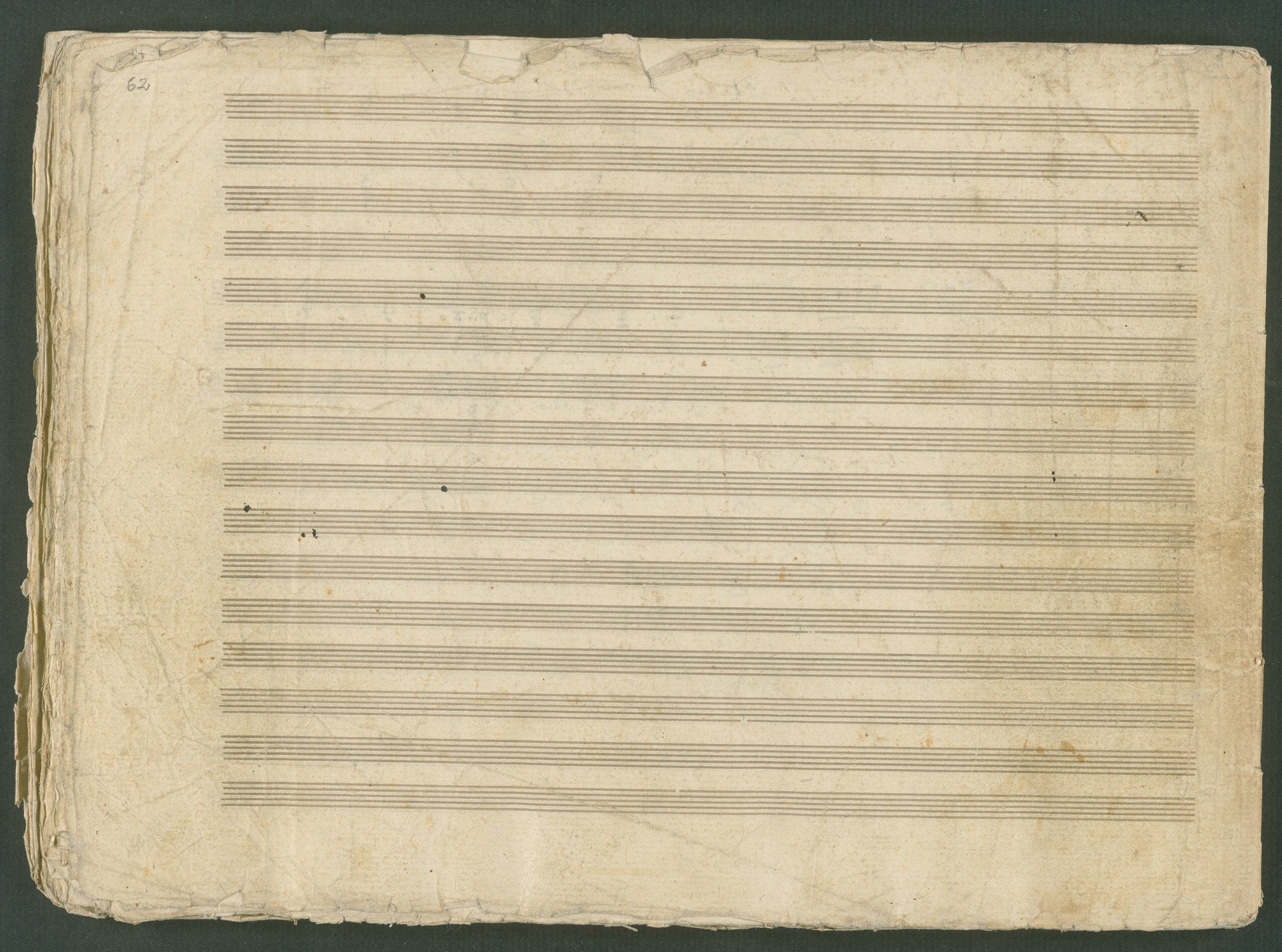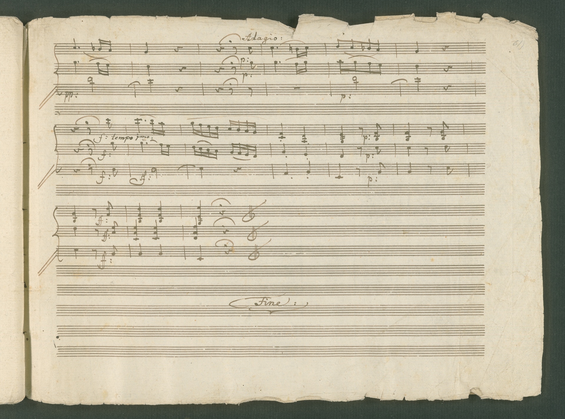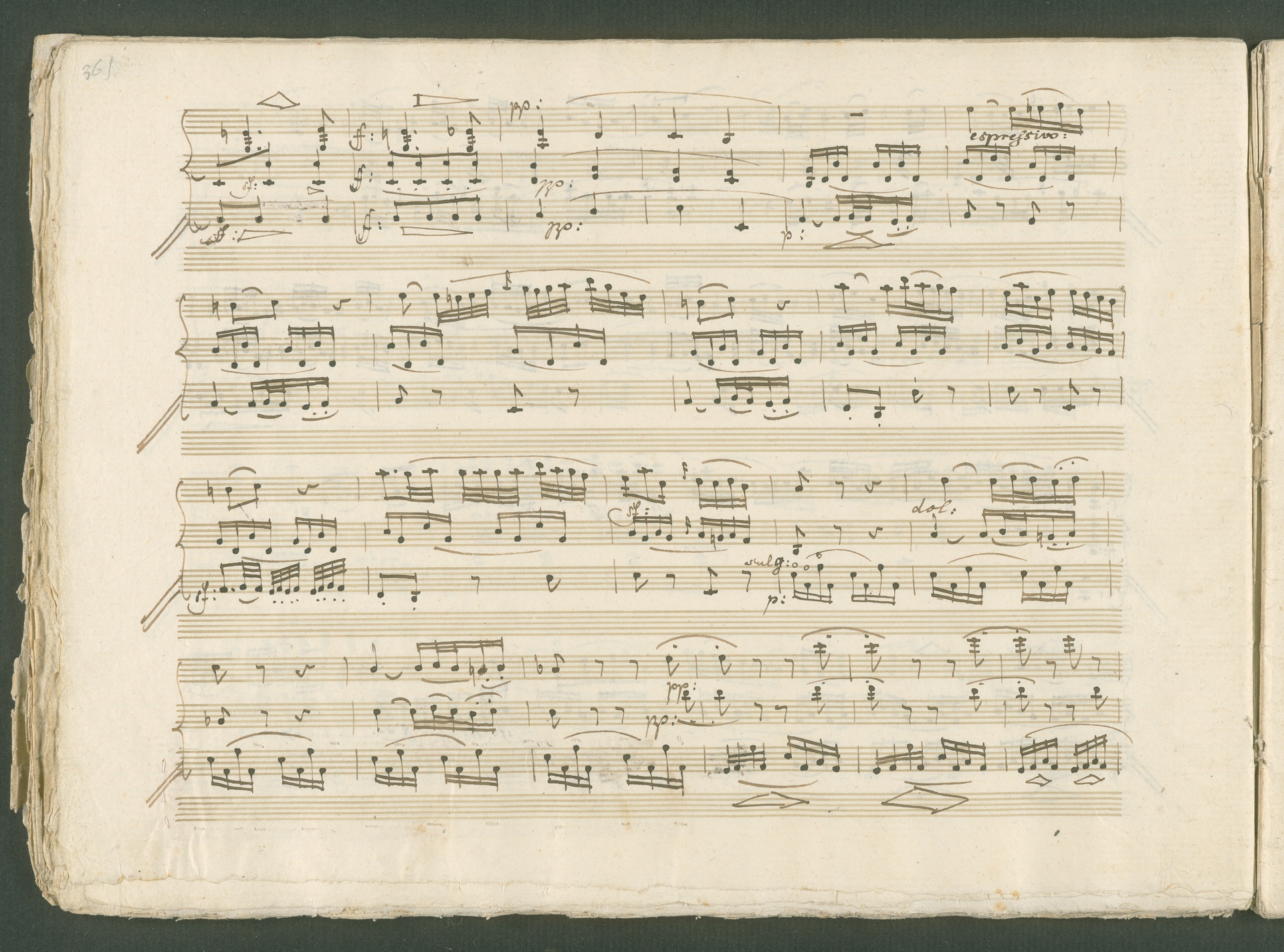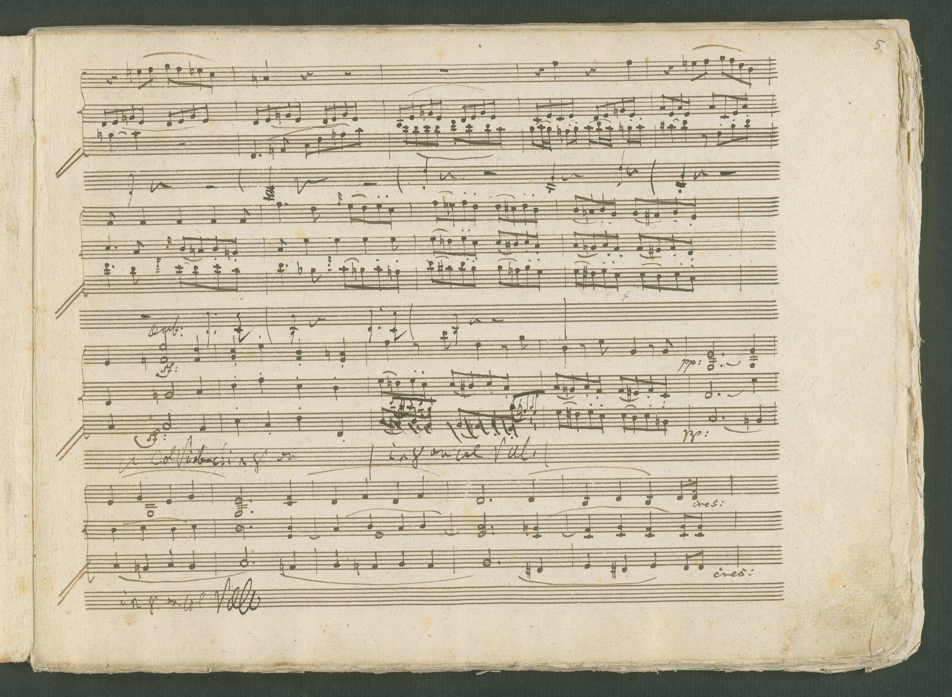 Here you can see a corrected copy of the String Trio op. 3. However, Beethoven's remarks can only be found up to page 19 - all subsequent pages do not contain any corrections or comments in the composer's hand. The copyist had notated the three stringed instruments in the score and joined them together using an accolade, leaving a stave free underneath each accolade. Beethoven made use of these free lines in the first movement and the first 44 bars of the second movement for his comments. The background to these corrections has not been explained up to now. In the first bar Beethoven writes: "Der Herr Violoncellist ist gebeten diesen Takt zu pausiren" (The cellist is asked to rest in this bar), he frequently adds the word "Cembalo" (harpsichord) or the abbreviation "Cemb" to his comments. It was this combination of corrections for the cello part as well as the introduction of the harpsichord (i.e. a keyboard instrument) that surprised scholars, causing them to speculate why. In 1920 Wilhelm Altmann presumed that Beethoven had wanted to rework the string trio for piano trio. It was for this reason that he notated a new cello part (in the fourth stave) and reworked the previous cello part as the left-hand part for a keyboard instrument. The right-hand harpsichord part would then have been the viola part. The viola, as an instrument in its own right, would no longer have had a part to play in this version, and the violin part would have remained unchanged. Another possibility was also considered: even the retention of all the strings would be possible. With an additional harpsichord or piano part, which Beethoven later sketched into the free staves, the copy could be a draft for piano quartet. Beethoven's real intentions remain unknown. There are both pros and cons for both models. Beethoven obviously discarded the arrangement himself, as we would otherwise have an authentic arrangement of the string trio (the arrangement for piano and cello op. 64 is not by Beethoven!) and the markings would not cease after the first two pages of the second movement. (J.R.)