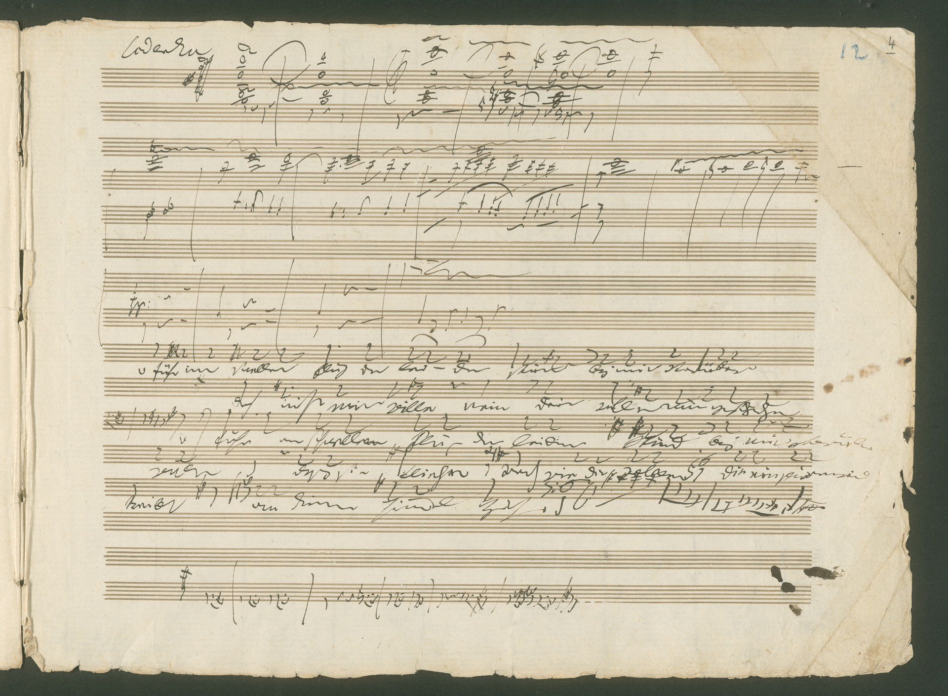 These two bifolia originally formed the last gathering of the so-called Wielhorsky Sketchbook. They still lie in the order of the original gathering, as occurs when a large sheet of paper is folded. The (oblong) sheet is folded in the middle, first horizontally then vertically. The fold on the upper edge of the sheet is cut, the leaves are then joined on the other fold. The leaves mainly contain sketches for Beethoven's Oratorio "Christus am Ölberge" (Christ on the Mount of Olives) op. 85, but also for some other works. On leaf 4r Beethoven wrote down ideas for the cadenza to his third piano concerto. He played this concerto for the first time in the academy in which the oratorio was also given its first performance. The academy took place on 5 April 1803 in the Theater an der Wien for the composer's benefit. (J.R.)