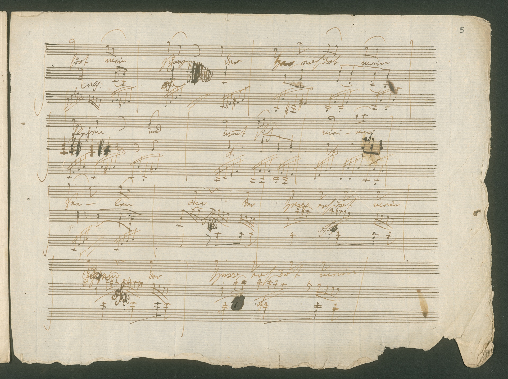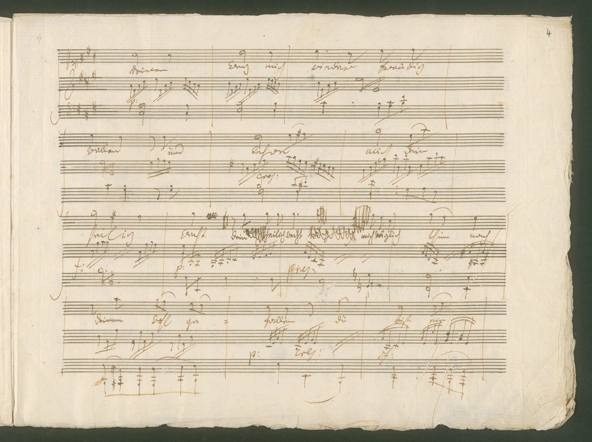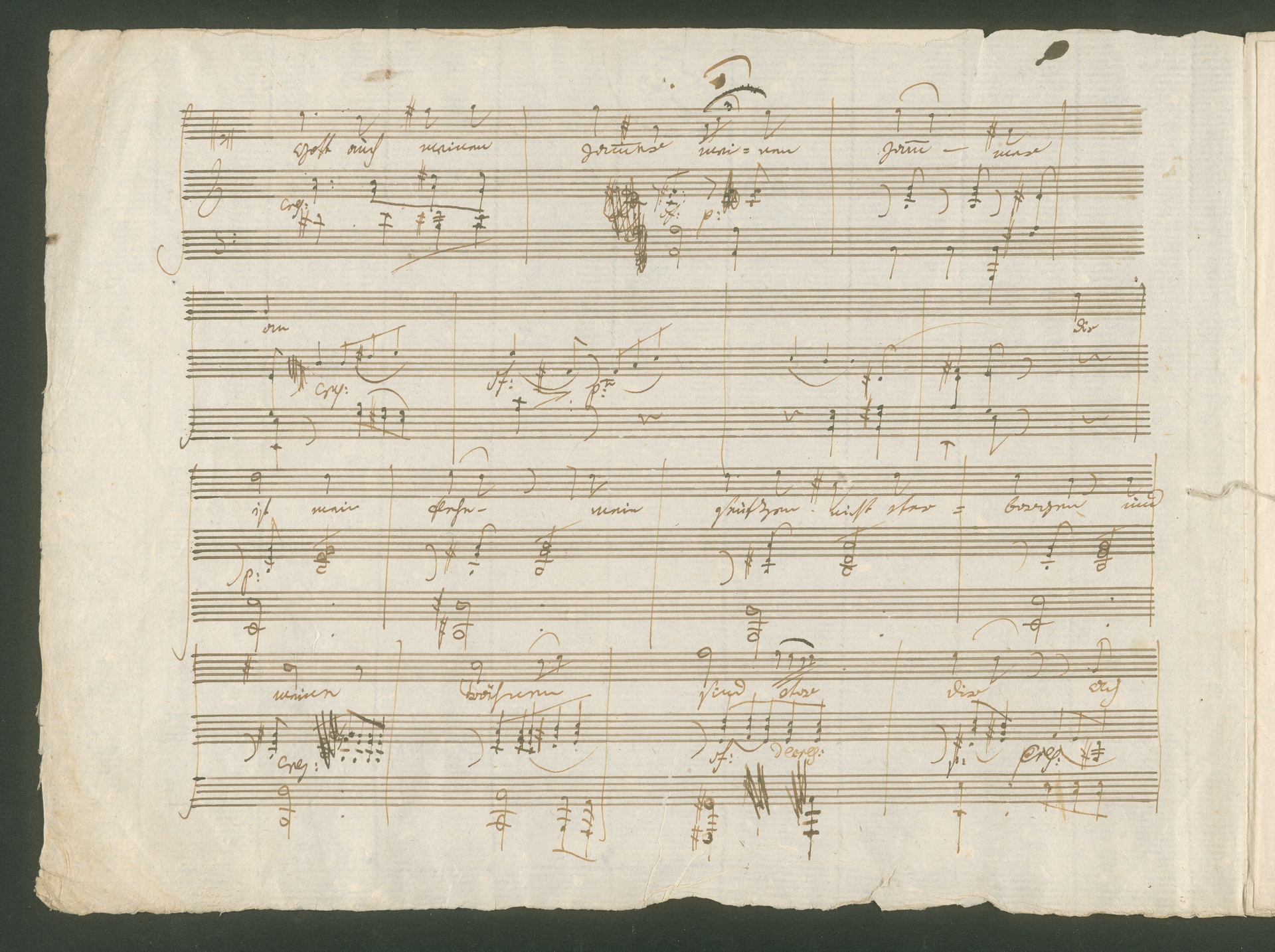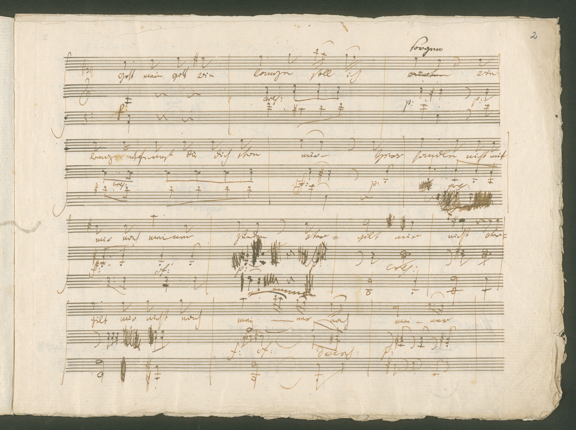 Here you can see the autograph score of the Gellert lied op. 48 no. 6, "Bußlied" ("Penitential hymn"). Along with the autograph score of no. 5 (also at the Beethoven-Haus, call number HCB Mh 31), with which the one shown here was once joined, it is the only surviving manuscript of the songs. Beethoven might have revised the Bußlied and therefore kept the autograph score. Unlike in the original edition published by the Viennese publisher Tranquillo Mollo (in August 1803), in which the Bußlied came at the end, that is as no. 6, Beethoven numbered it "No. 5" in the autograph score shown here. Although the Bußlied is certainly suitable as the conclusion and highlight of a collection on account of its two-part structure, Beethoven had obviously not envisaged a cyclic order. This reflects the way the texts were conceived in the 54 "Religious odes and songs", which the poet Christian Fürchtegott Gellert had also not written as a cycle. Gellert's poems enjoyed great popularity in the second half of the eighteenth century and were set to music around 560 times. (J.R.)