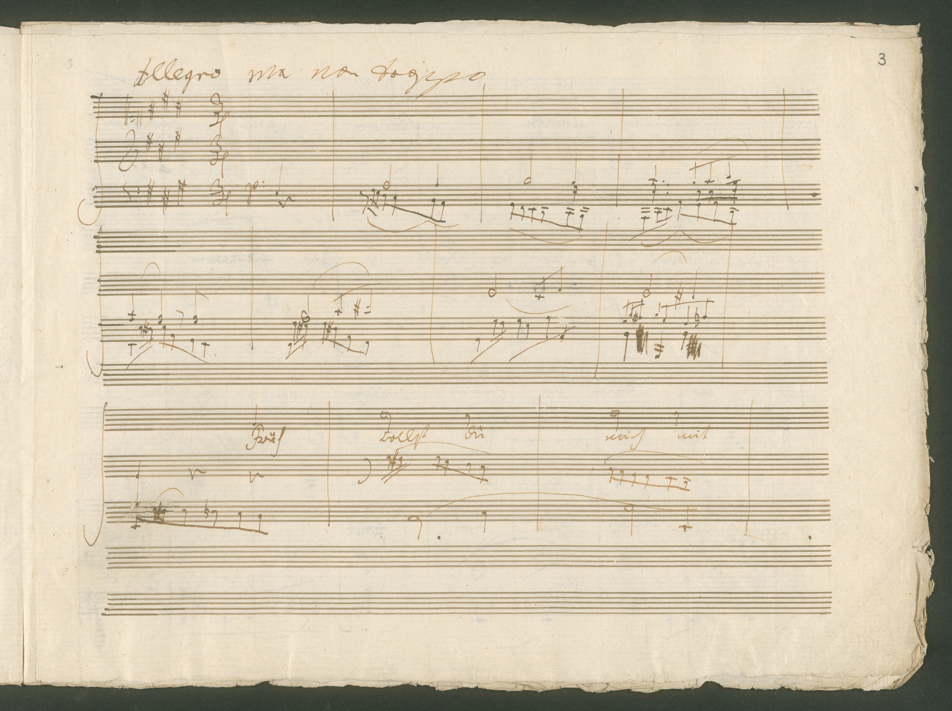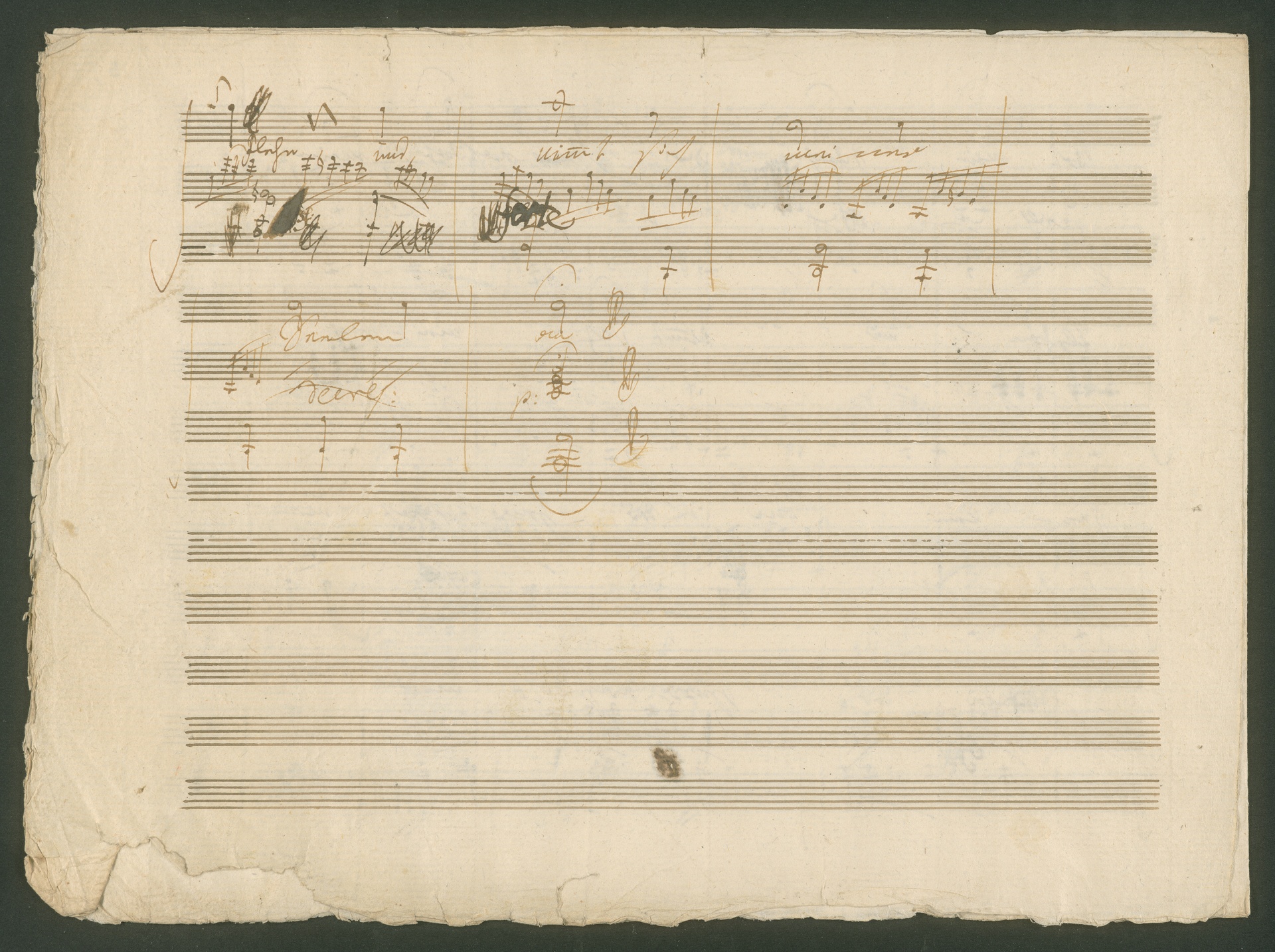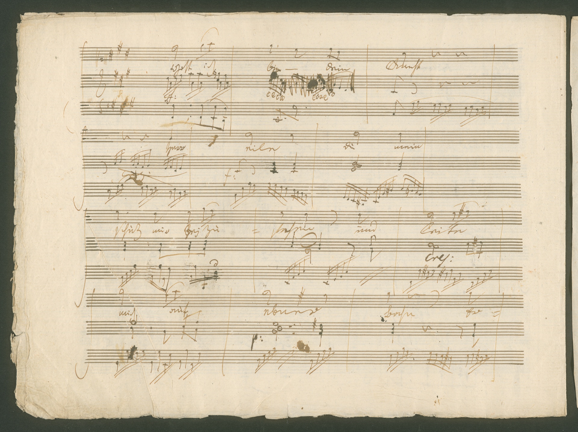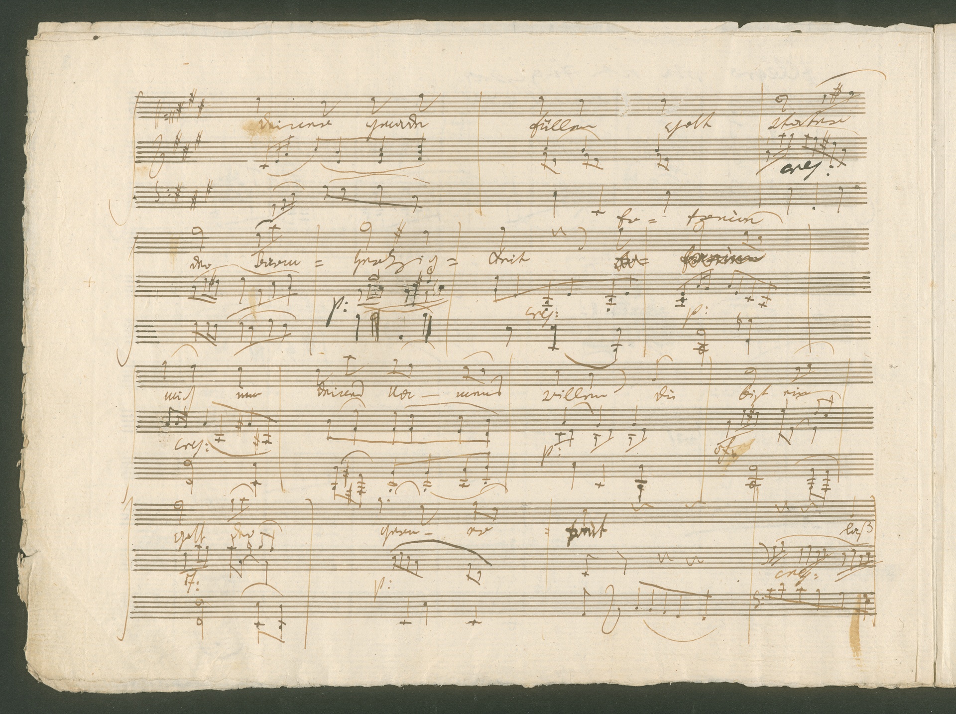 Here you can see the autograph score of the Gellert lied op. 48 no. 6, "Bußlied" ("Penitential hymn"). Along with the autograph score of no. 5 (also at the Beethoven-Haus, call number HCB Mh 31), with which the one shown here was once joined, it is the only surviving manuscript of the songs. Beethoven might have revised the Bußlied and therefore kept the autograph score. Unlike in the original edition published by the Viennese publisher Tranquillo Mollo (in August 1803), in which the Bußlied came at the end, that is as no. 6, Beethoven numbered it "No. 5" in the autograph score shown here. Although the Bußlied is certainly suitable as the conclusion and highlight of a collection on account of its two-part structure, Beethoven had obviously not envisaged a cyclic order. This reflects the way the texts were conceived in the 54 "Religious odes and songs", which the poet Christian Fürchtegott Gellert had also not written as a cycle. Gellert's poems enjoyed great popularity in the second half of the eighteenth century and were set to music around 560 times. (J.R.)