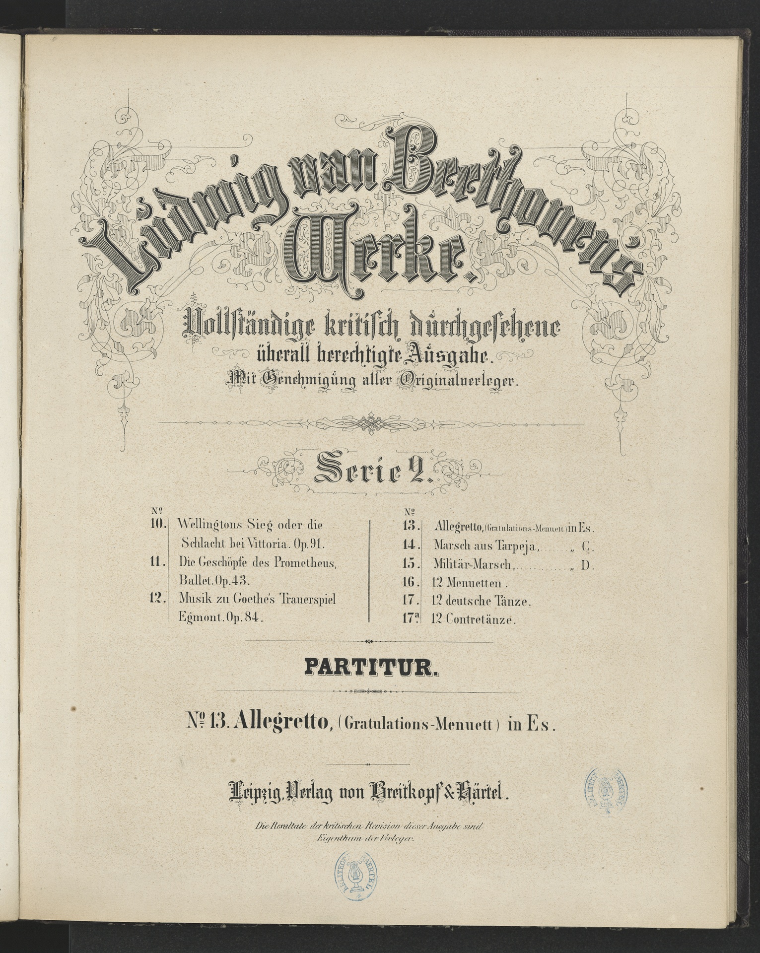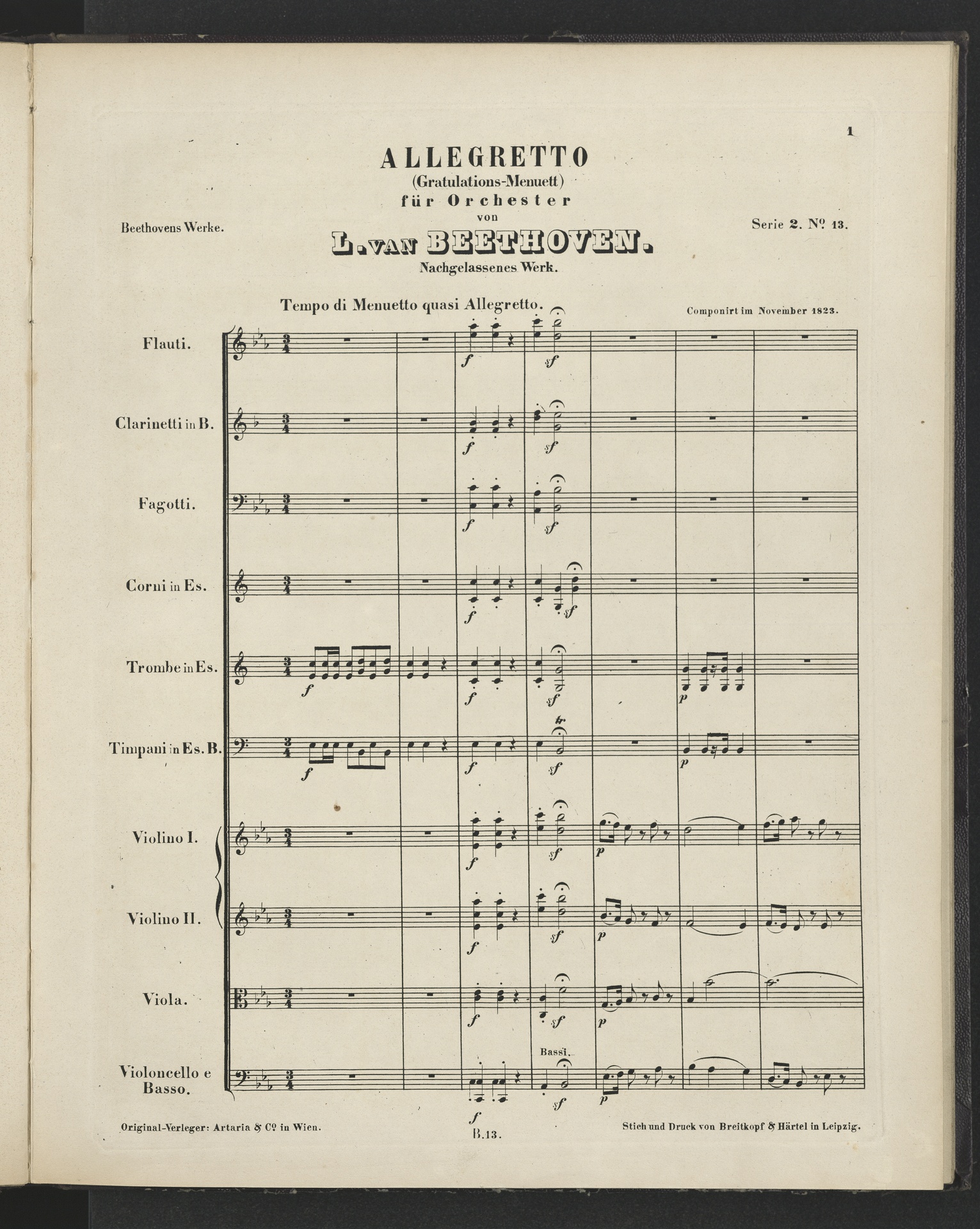 Ludwig van Beethoven, Menuett für Orchester (Es-Dur) WoO 3 (Gratulations-Menuett), Partitur, Breitkopf und Härtel, 13