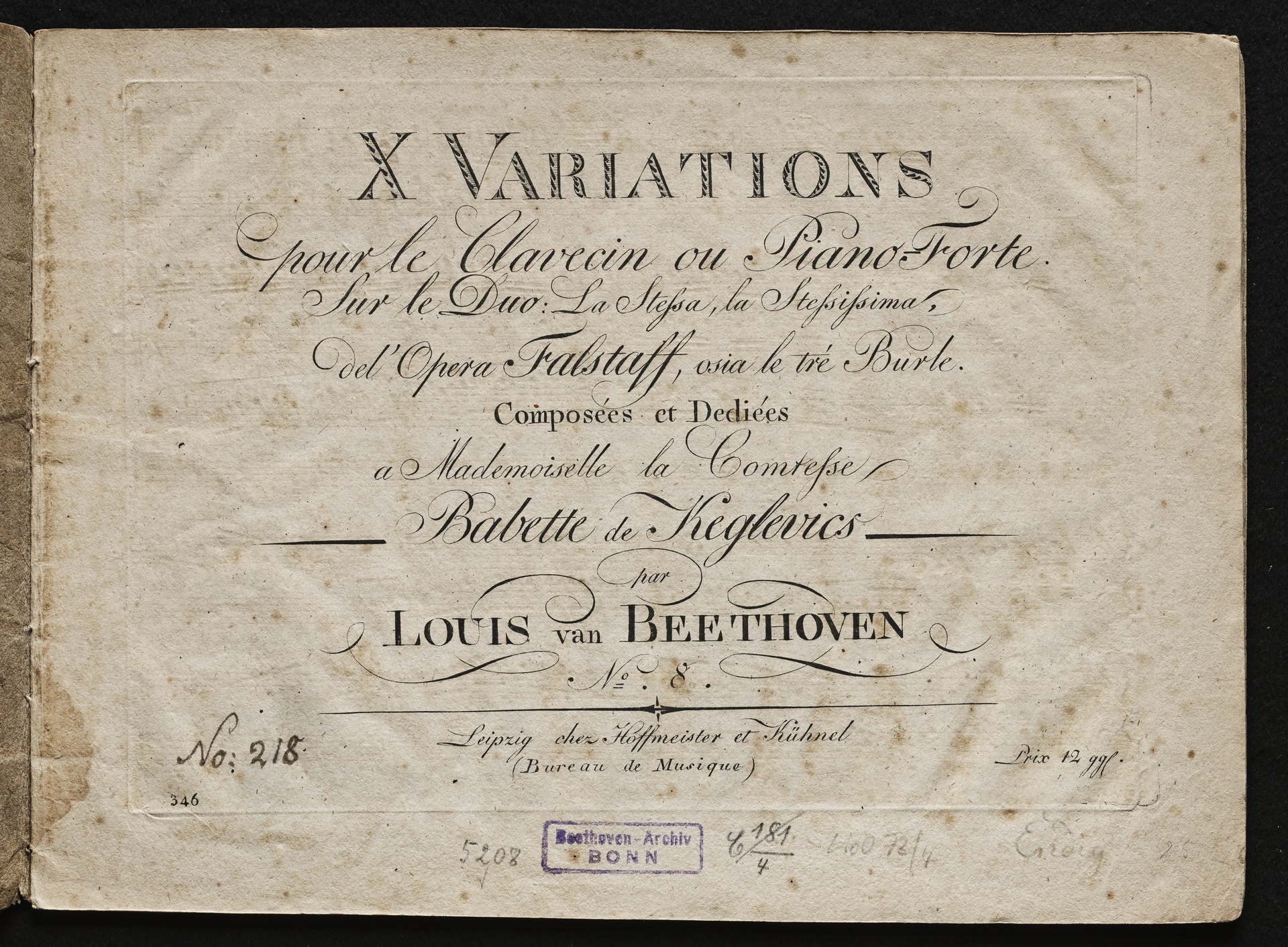 Ludwig van Beethoven, Variationen über das Duett "La stessa, la stessissima" aus Antonio Salieris Oper "Falstaff" für Klavier (B-Dur) WoO 73, Hoffmeister und Kühnel, 346