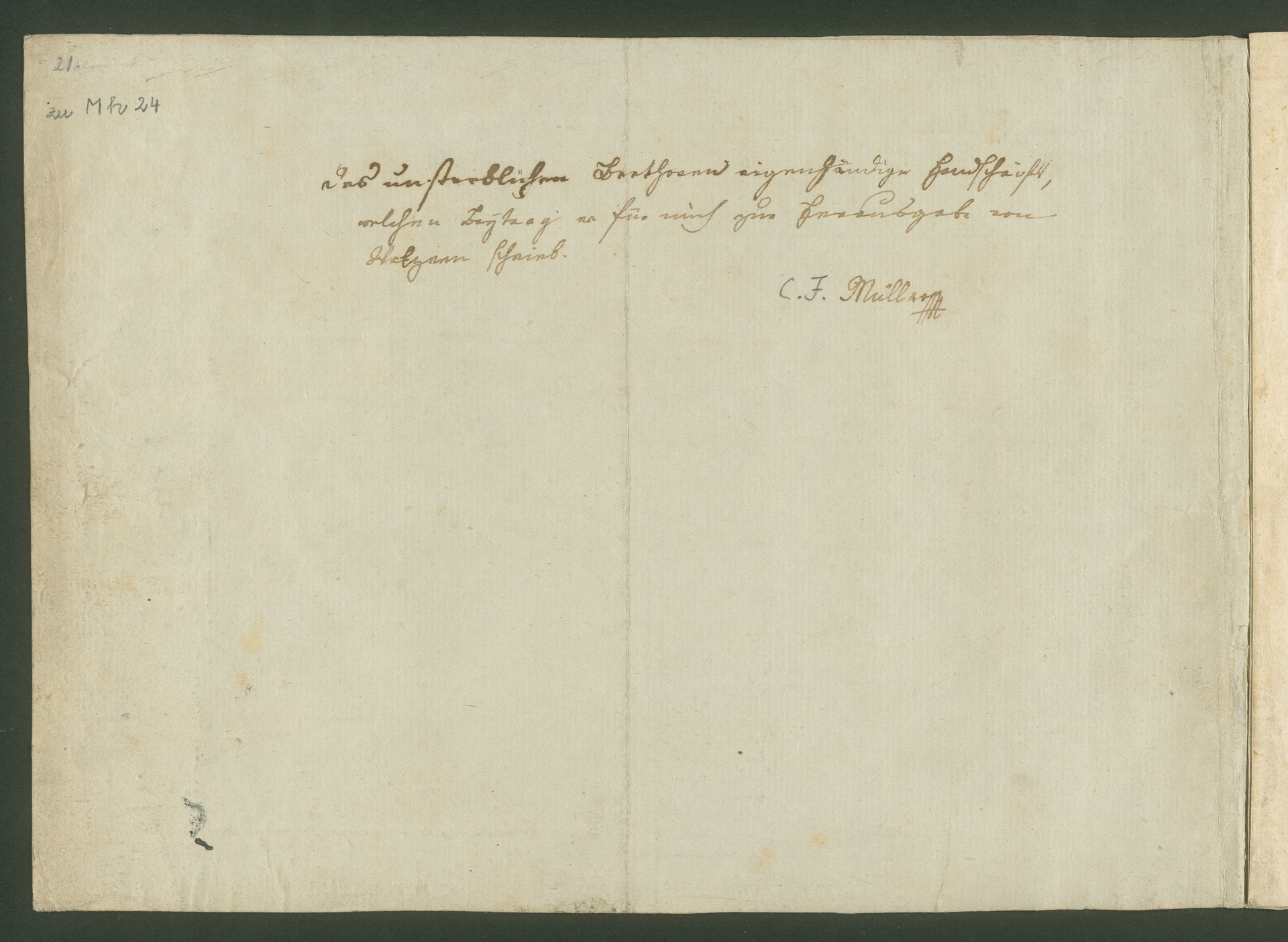 Both in the catalogue of Beethoven's works ("Beethoven-Werkverzeichnis") by Georg Kinsky and Hans Halm and in the edition of his conversation books, the Viennese actor Carl Friedrich Müller, for whom Beethoven wrote the three above-mentioned works, is confused with the Berlin composer and piano teacher Karl Friedrich Müller. Beethoven wrote the latter a friendly letter in 1825/26, replying to a query. They are, however, not the same person. The letter to the Müller in Berlin is also held at the Beethoven-Haus under the call number NE 188. (J.R.)