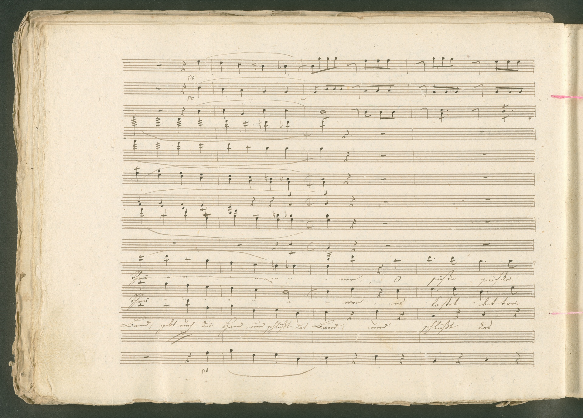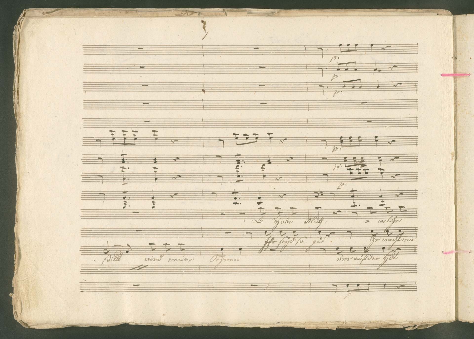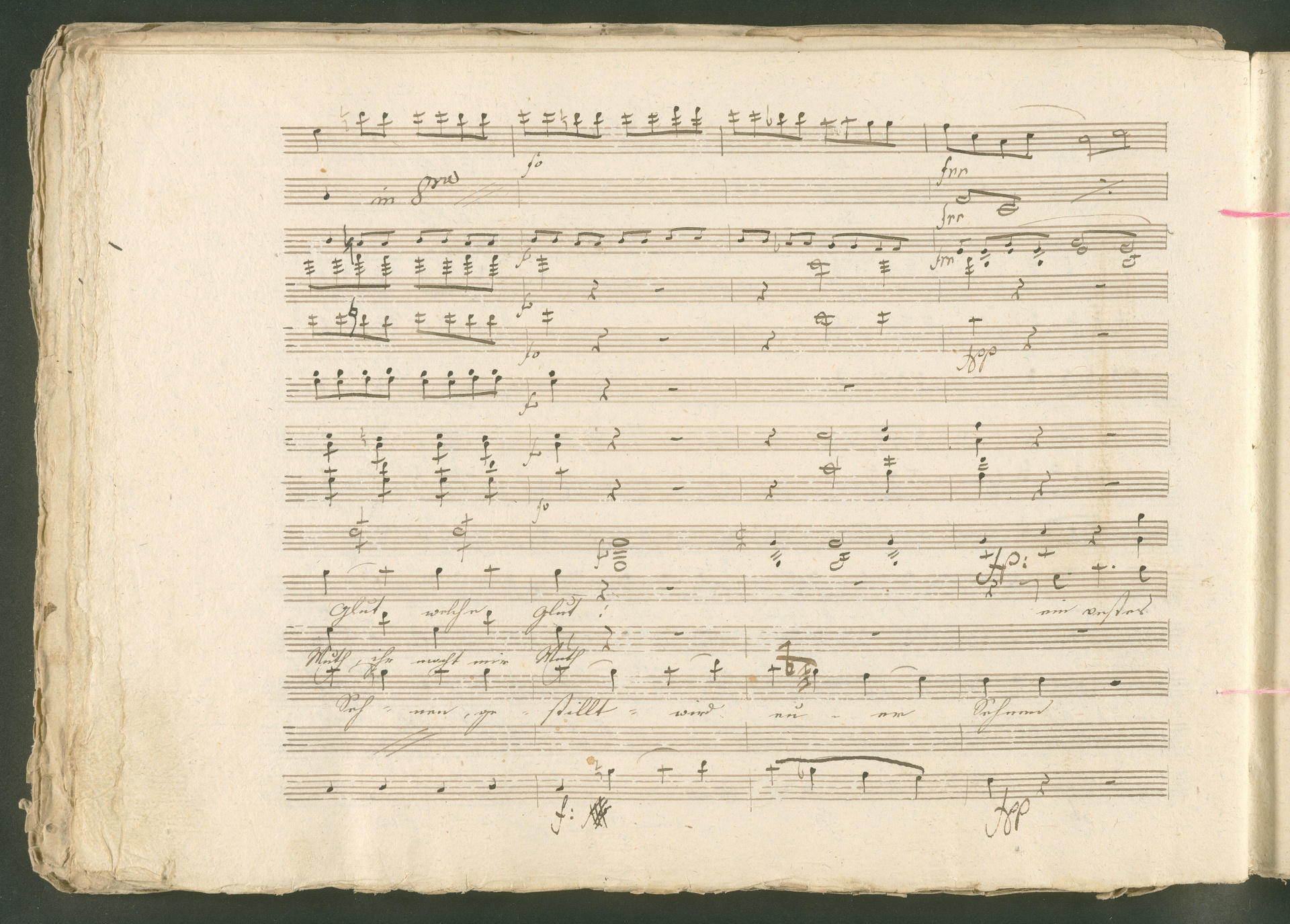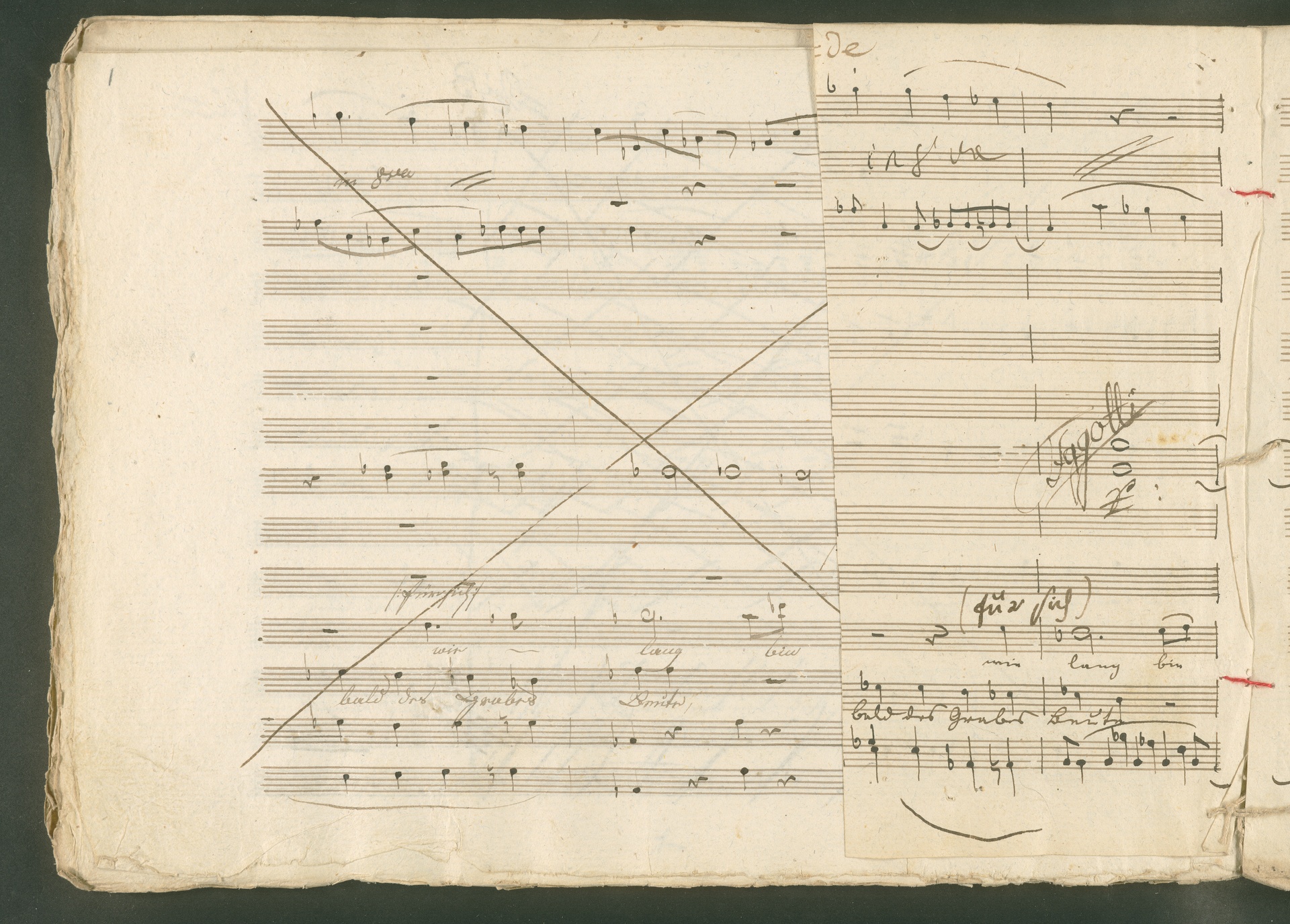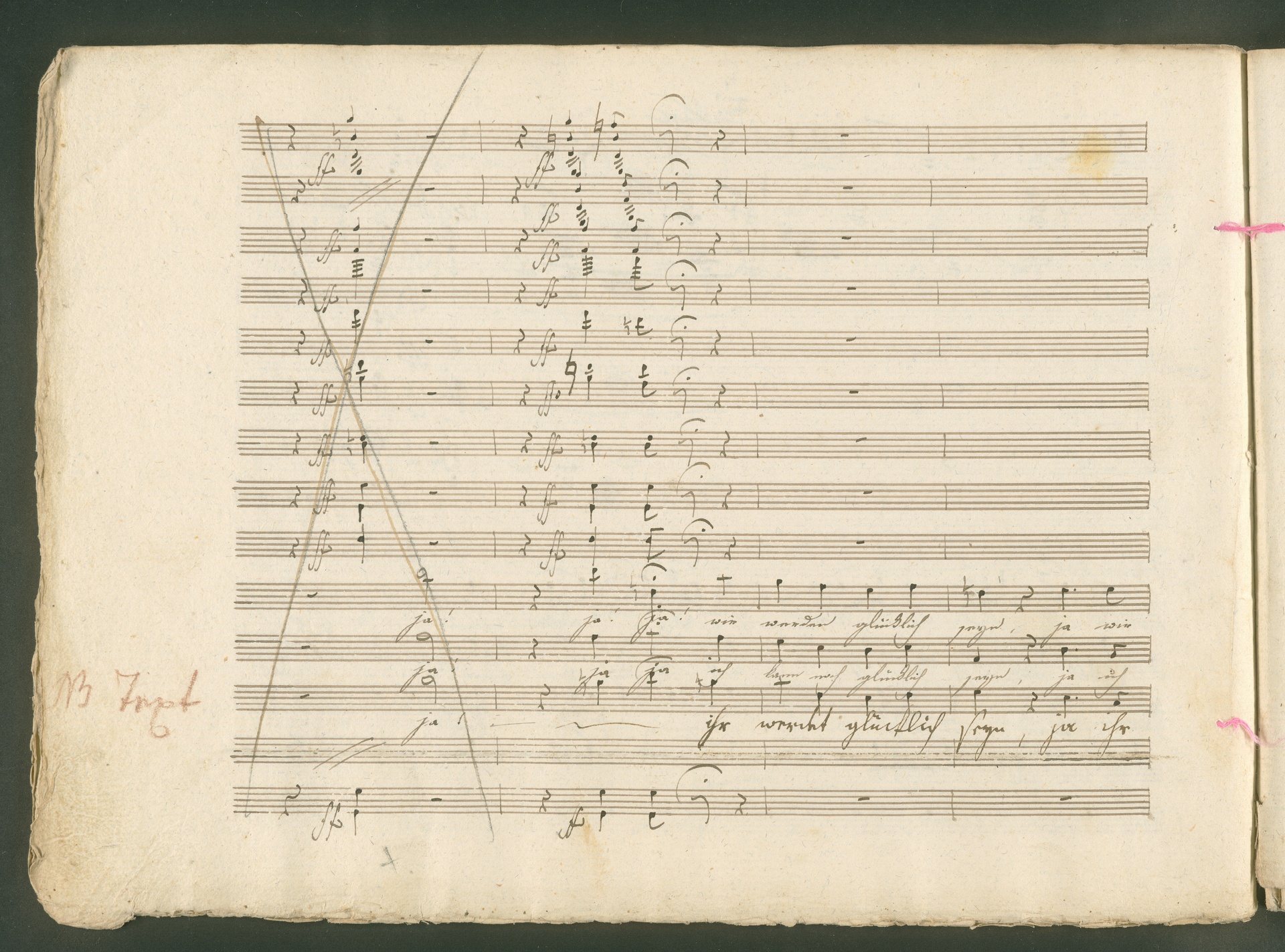 The trio from Beethoven's opera Fidelio "Gut, Söhnchen, gut" ("Well said, my son"), of which we can see a corrected copy for the 1806 version, is the most problematic number in the opera. It is very long (in 1805 it had 232 bars, the version for 1806 211 bars and the 1814 version was shortened to 198 bars) and was originally the end of the exposition. Despite being shortened the trio only received minor revisions. While it still had a place amongst the other lighthearted numbers in 1806, its dramatic role changed in 1814 as the comic-larmoyante plot surrounding Marzelline was greatly reduced. (J.R.)