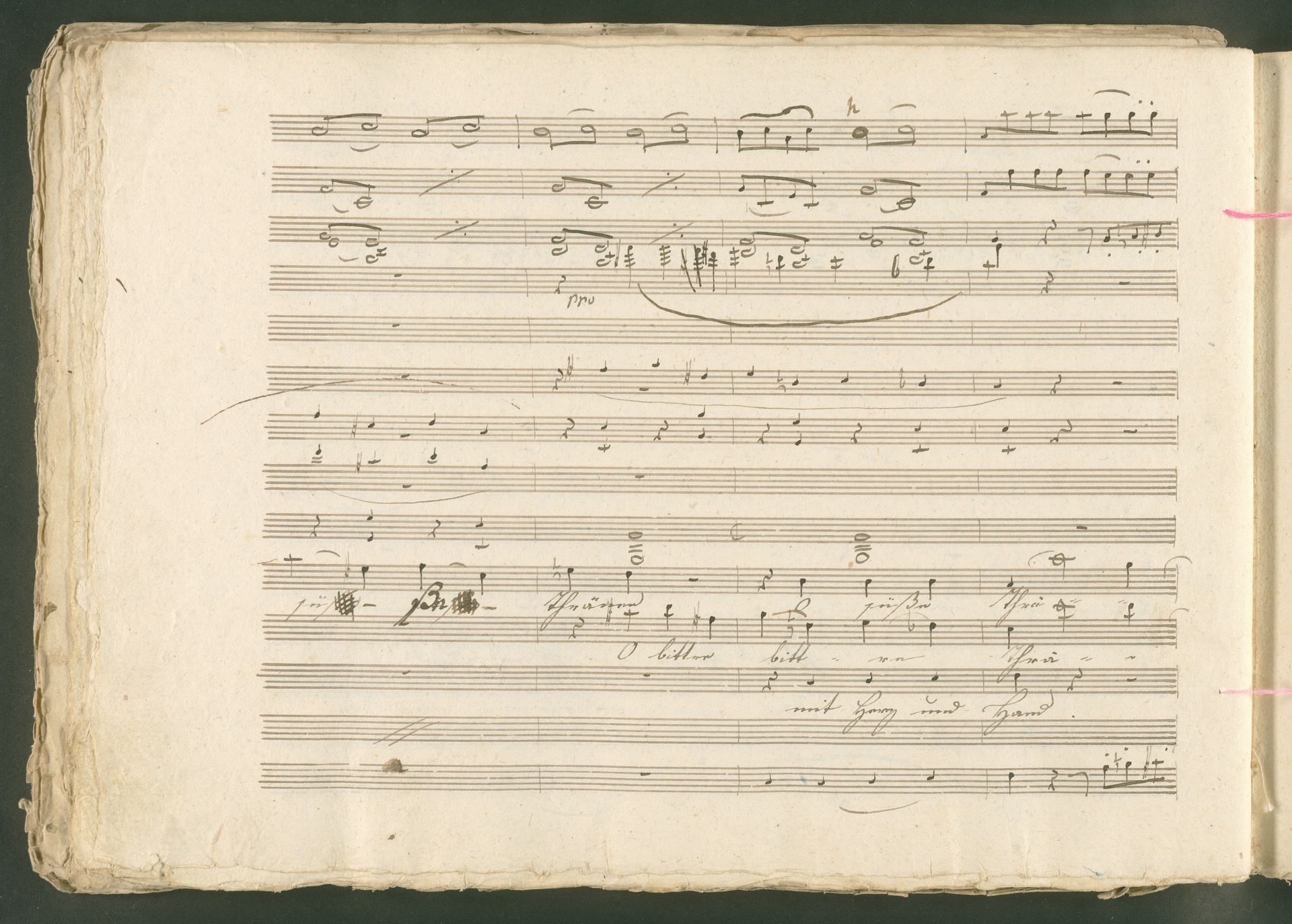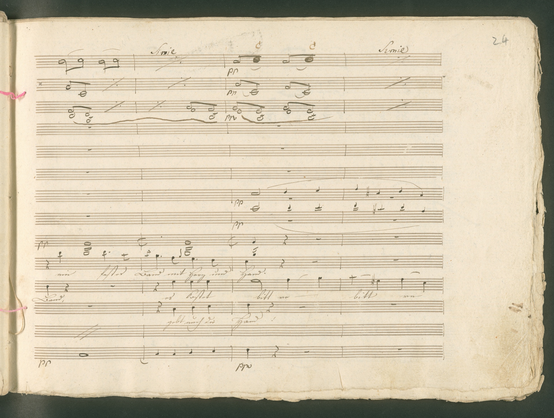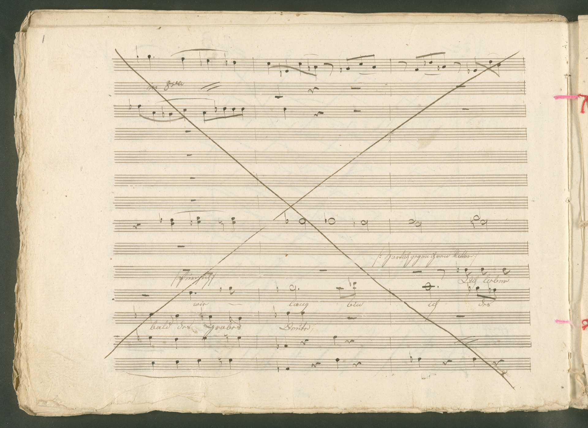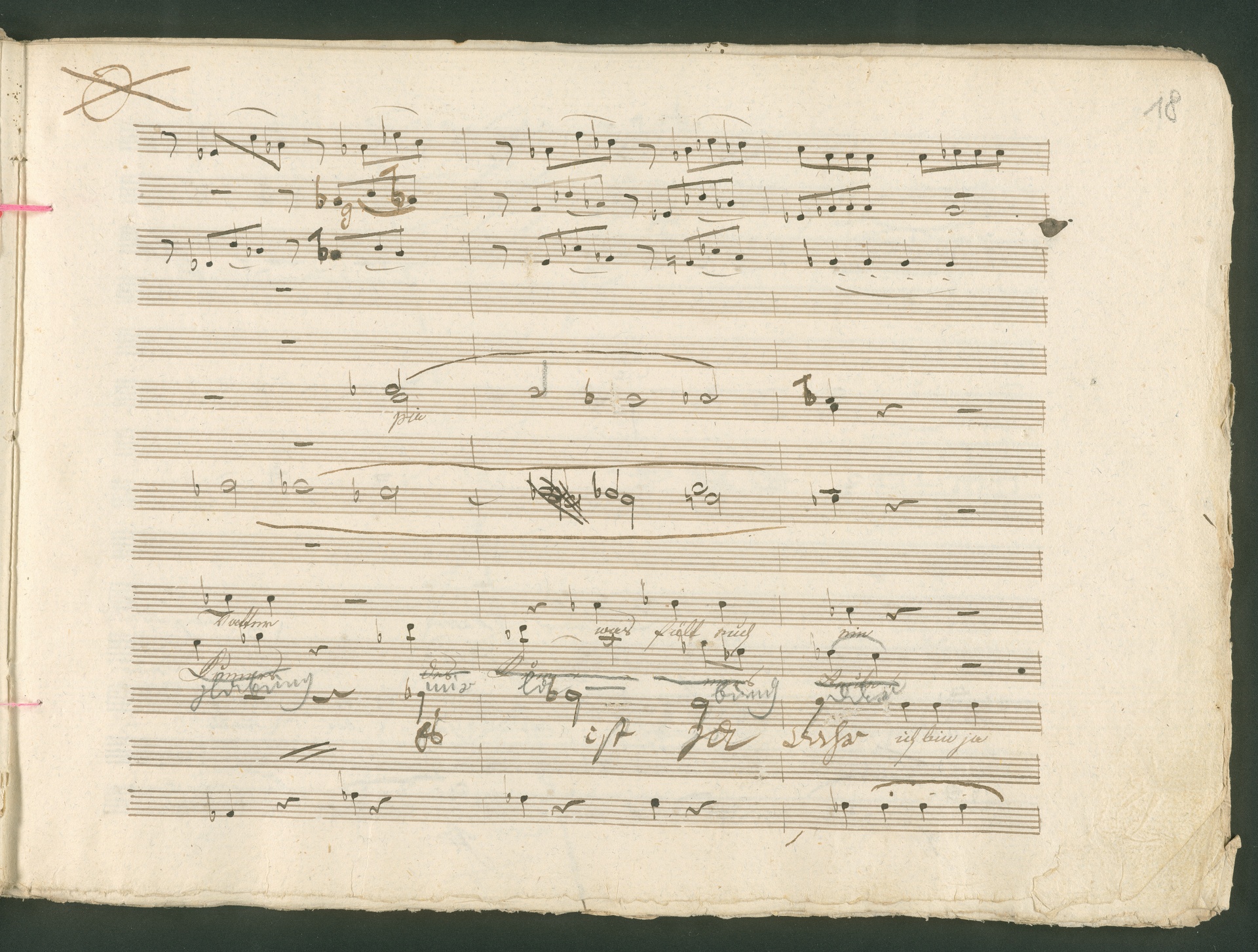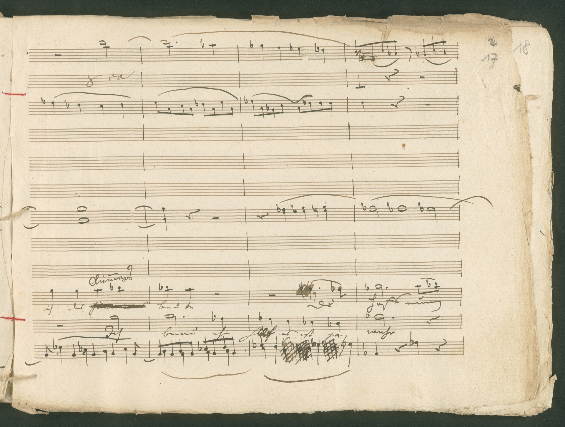 The trio from Beethoven's opera Fidelio "Gut, Söhnchen, gut" ("Well said, my son"), of which we can see a corrected copy for the 1806 version, is the most problematic number in the opera. It is very long (in 1805 it had 232 bars, the version for 1806 211 bars and the 1814 version was shortened to 198 bars) and was originally the end of the exposition. Despite being shortened the trio only received minor revisions. While it still had a place amongst the other lighthearted numbers in 1806, its dramatic role changed in 1814 as the comic-larmoyante plot surrounding Marzelline was greatly reduced. (J.R.)