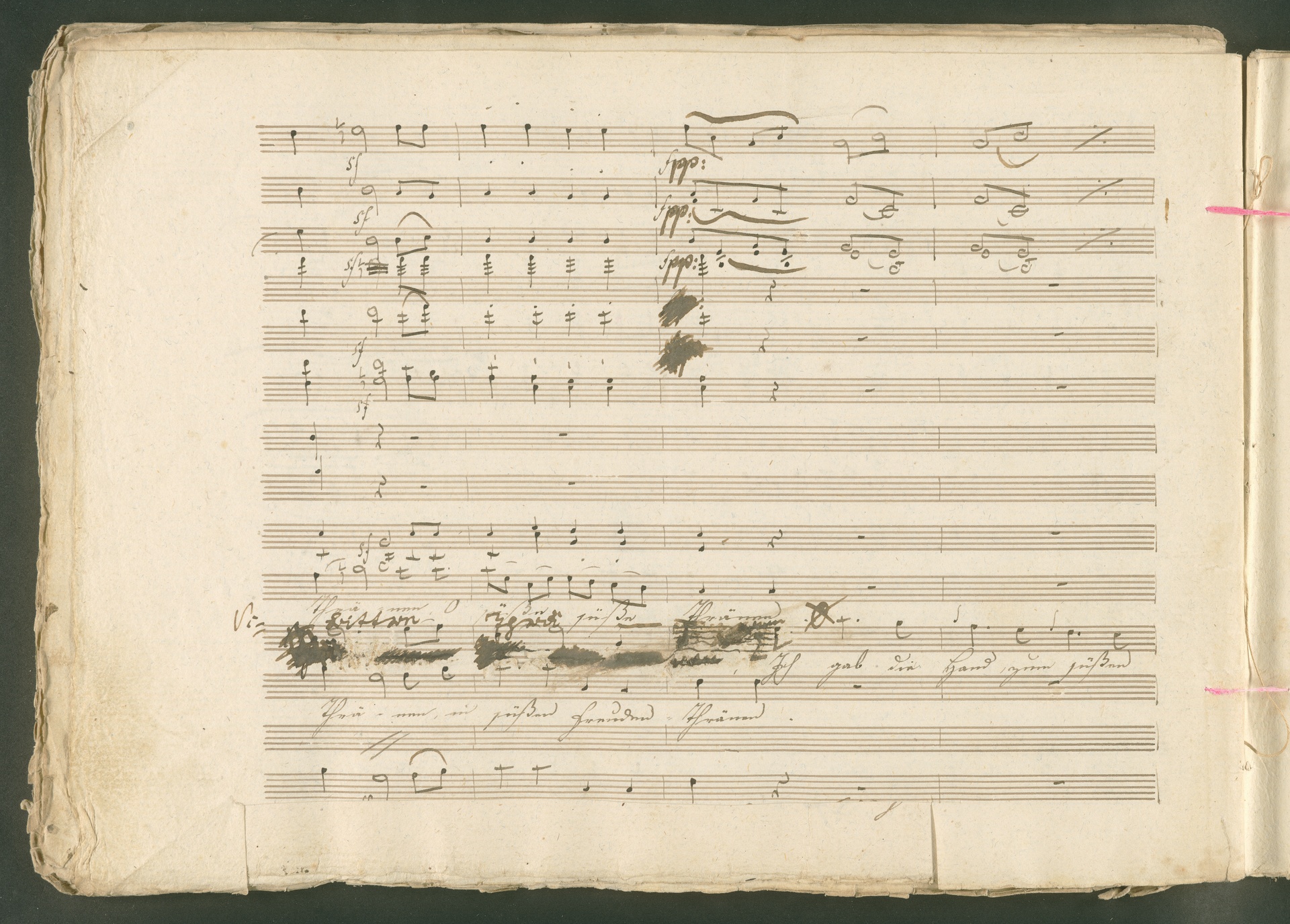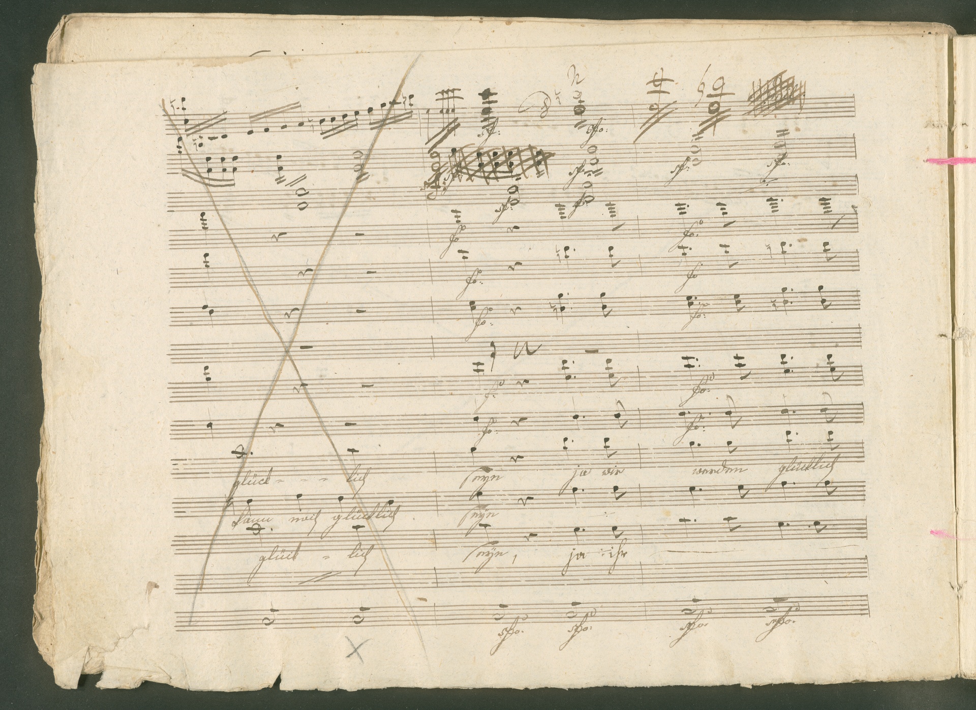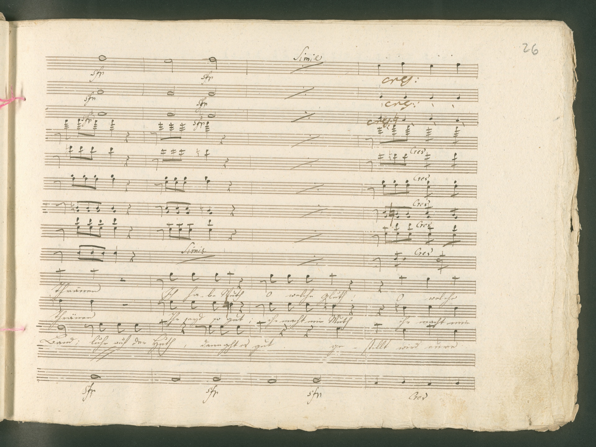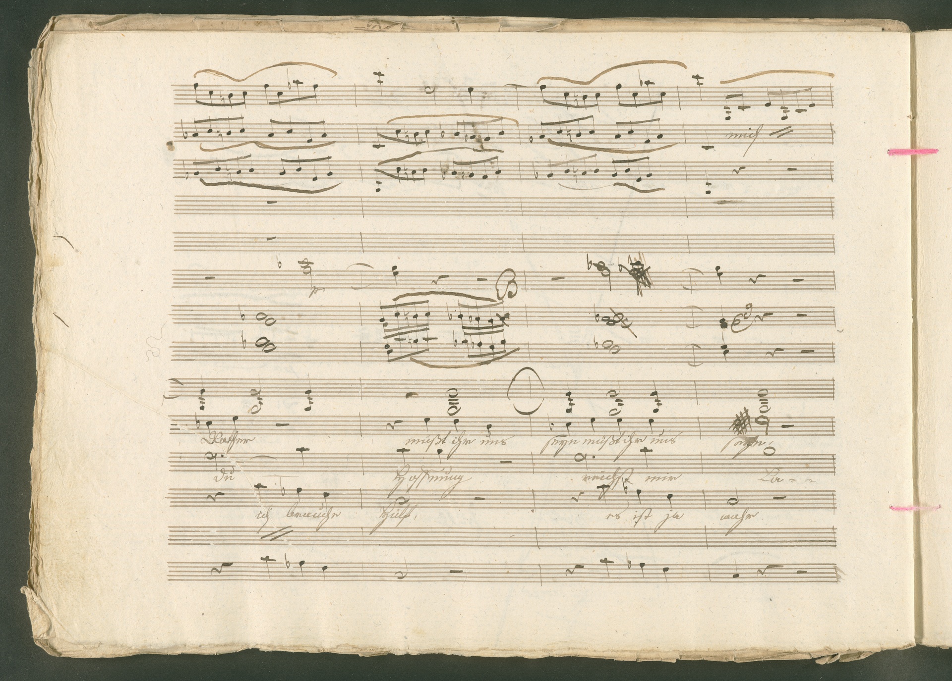 The trio from Beethoven's opera Fidelio "Gut, Söhnchen, gut" ("Well said, my son"), of which we can see a corrected copy for the 1806 version, is the most problematic number in the opera. It is very long (in 1805 it had 232 bars, the version for 1806 211 bars and the 1814 version was shortened to 198 bars) and was originally the end of the exposition. Despite being shortened the trio only received minor revisions. While it still had a place amongst the other lighthearted numbers in 1806, its dramatic role changed in 1814 as the comic-larmoyante plot surrounding Marzelline was greatly reduced. (J.R.)
