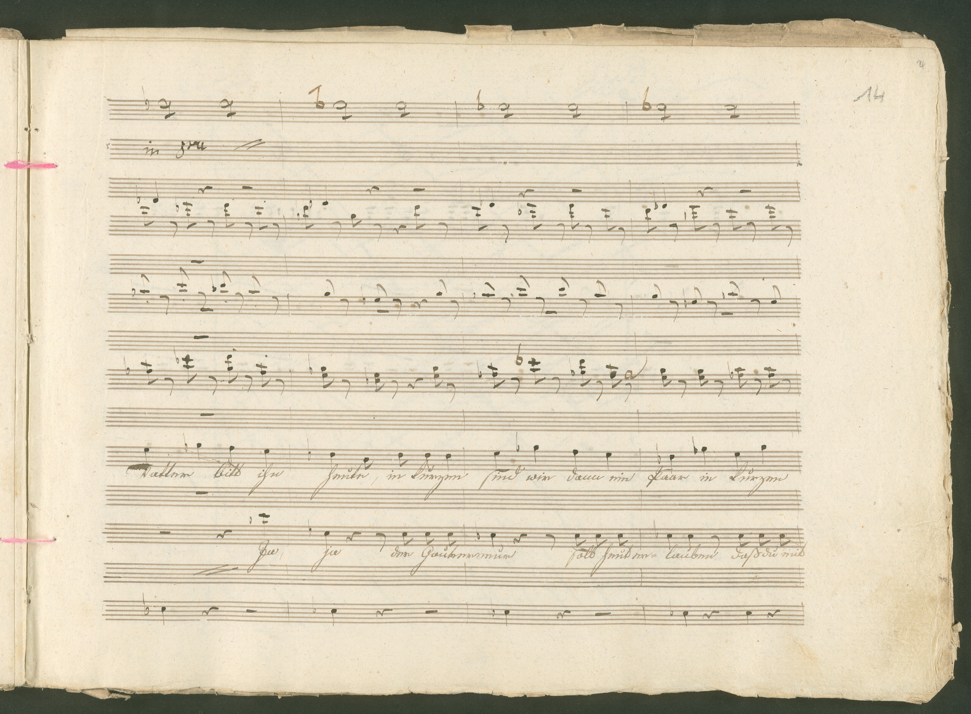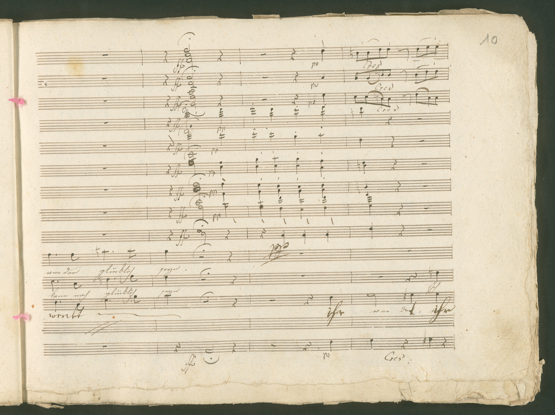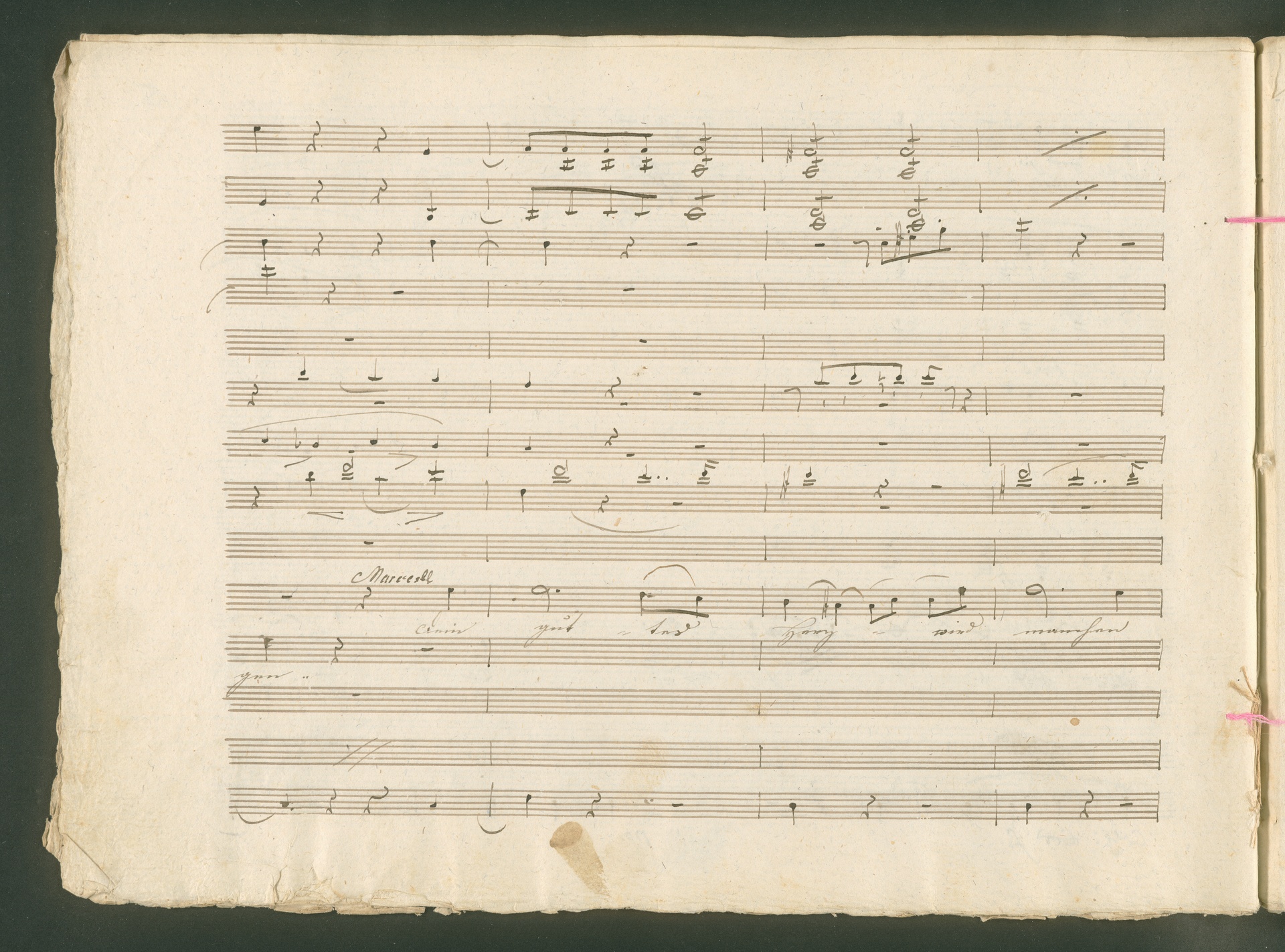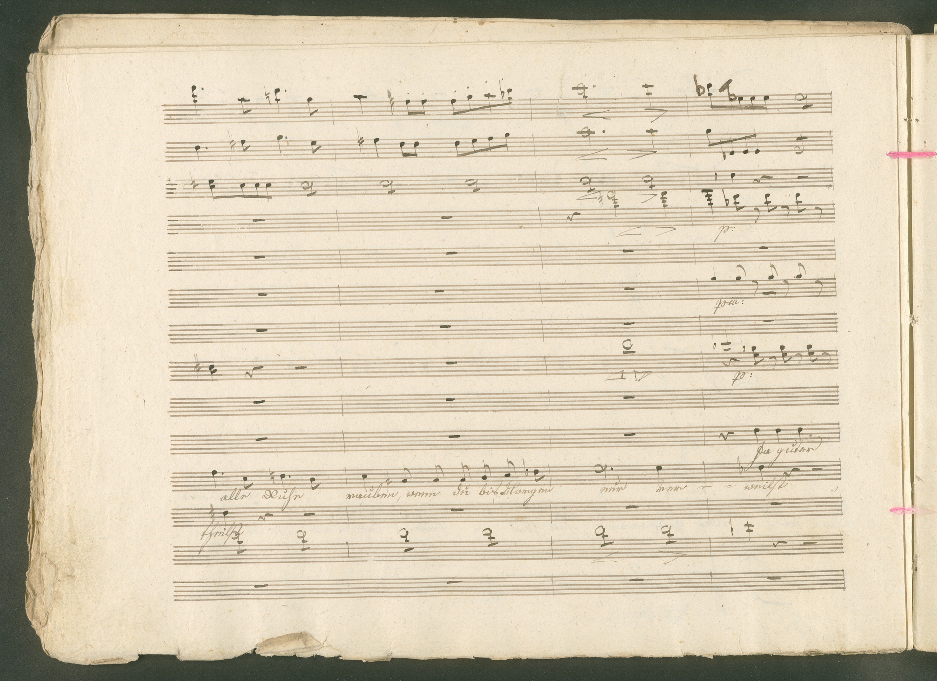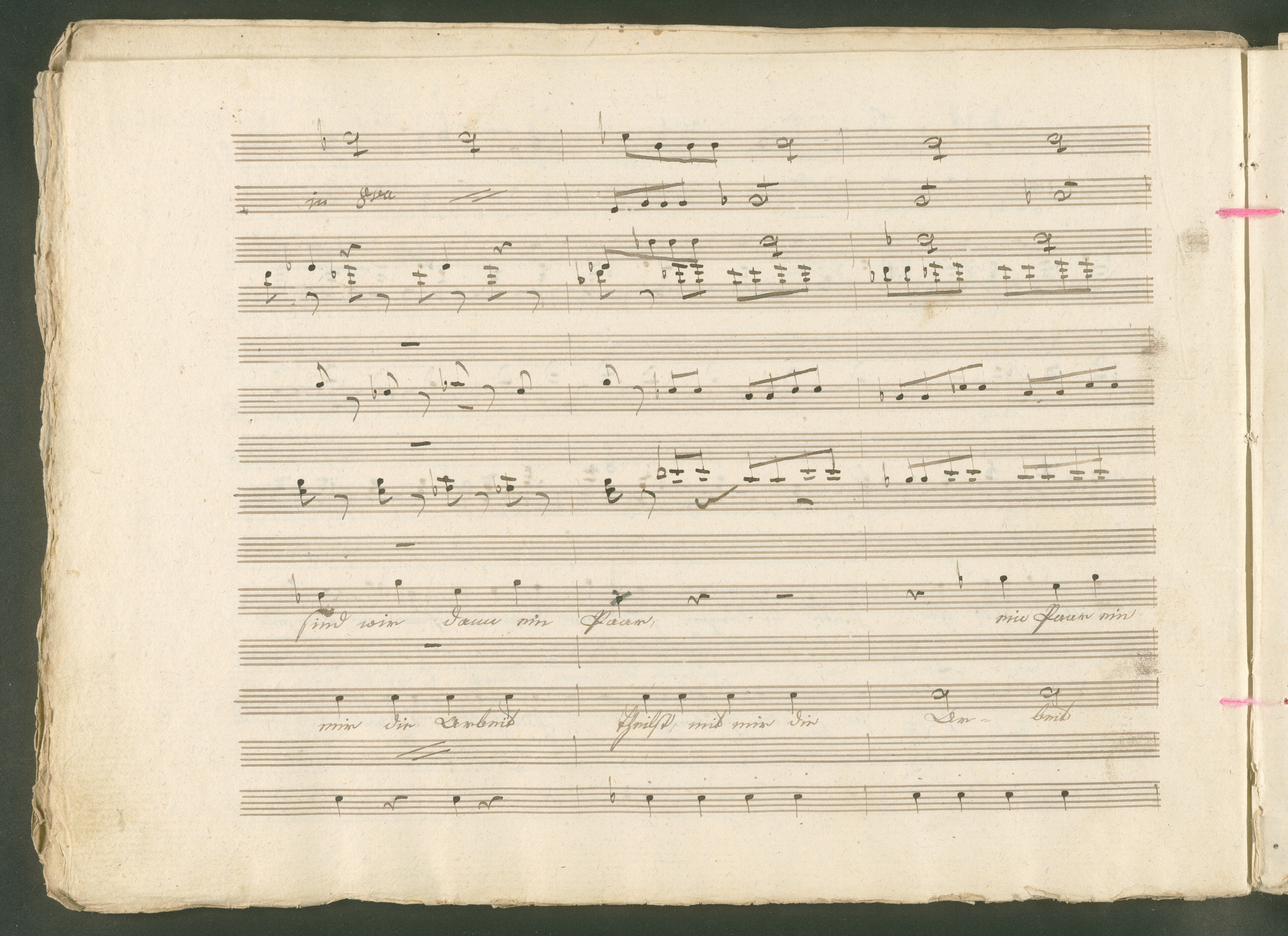 The trio from Beethoven's opera Fidelio "Gut, Söhnchen, gut" ("Well said, my son"), of which we can see a corrected copy for the 1806 version, is the most problematic number in the opera. It is very long (in 1805 it had 232 bars, the version for 1806 211 bars and the 1814 version was shortened to 198 bars) and was originally the end of the exposition. Despite being shortened the trio only received minor revisions. While it still had a place amongst the other lighthearted numbers in 1806, its dramatic role changed in 1814 as the comic-larmoyante plot surrounding Marzelline was greatly reduced. (J.R.)