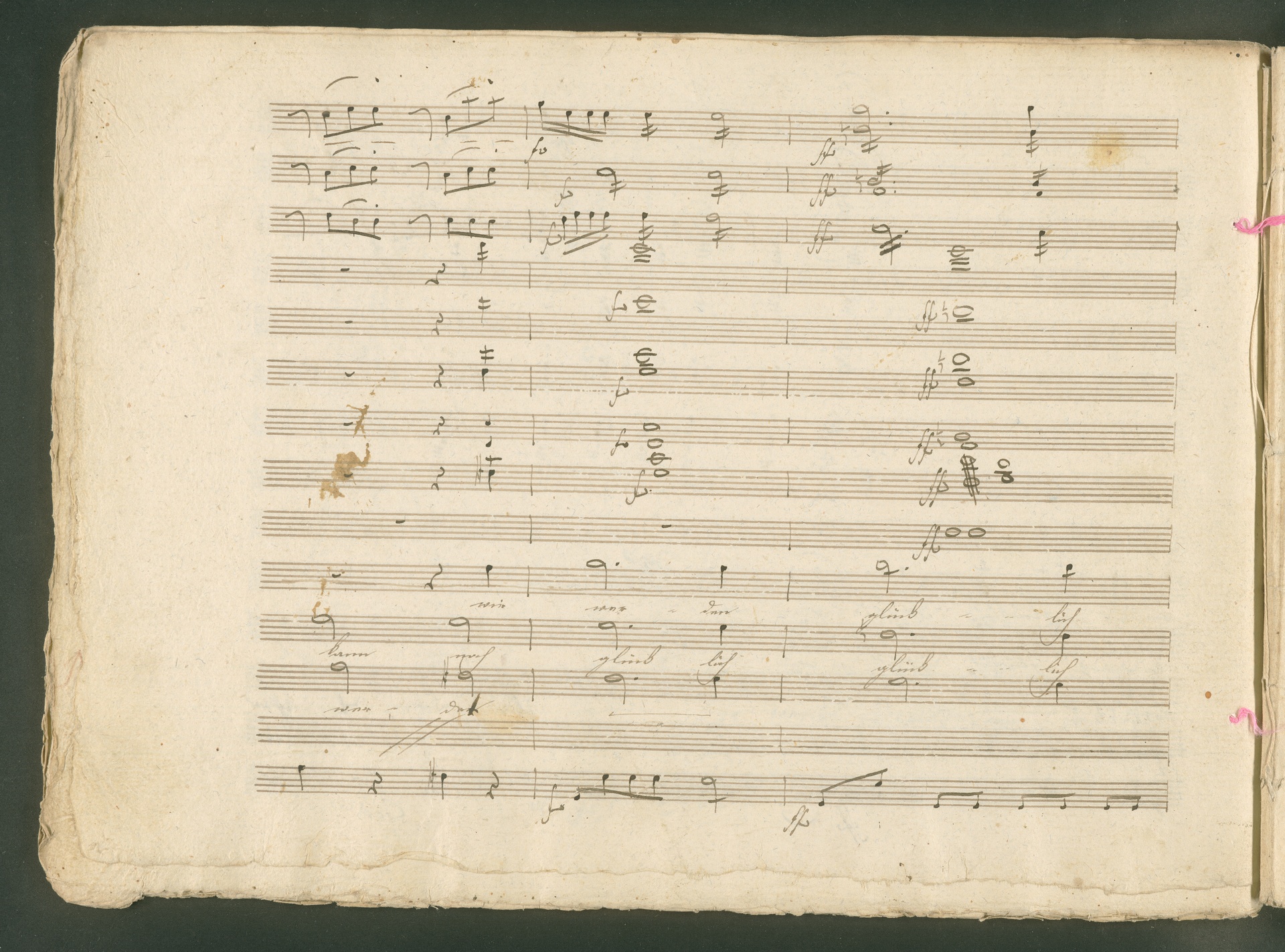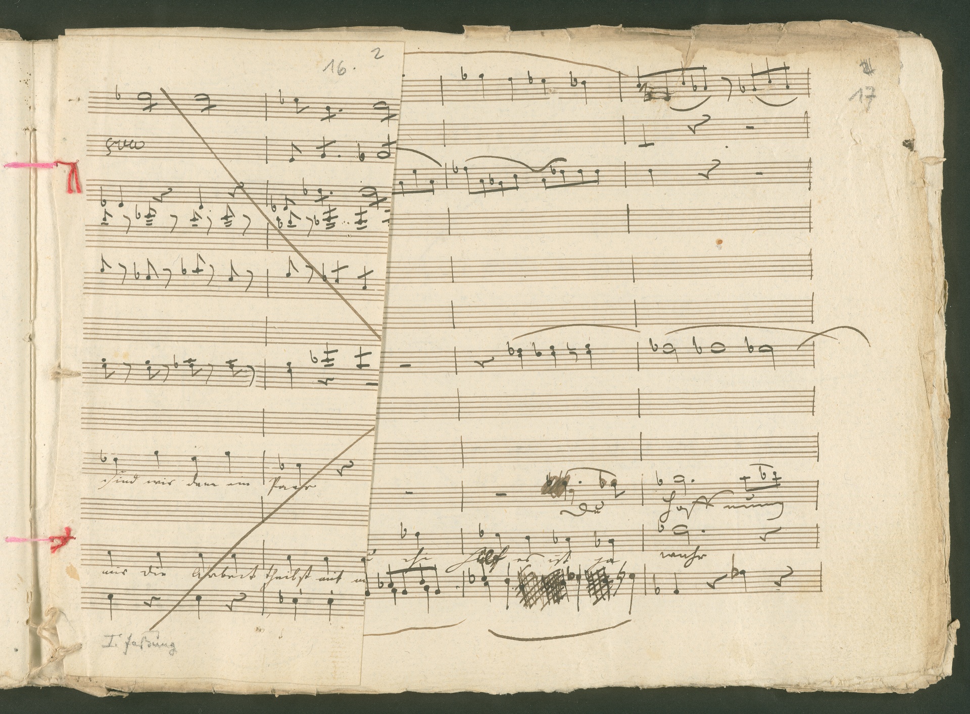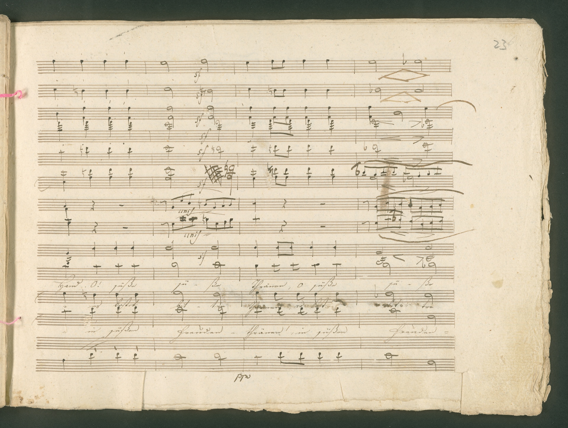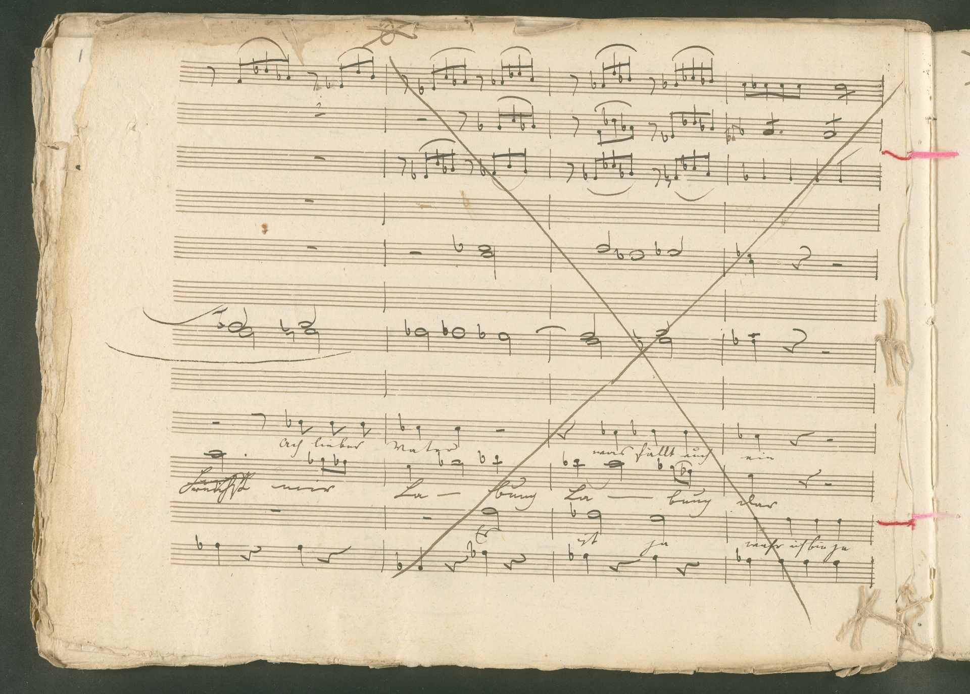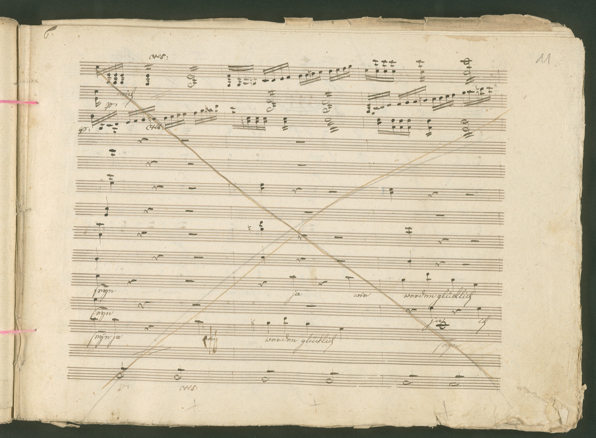 The trio from Beethoven's opera Fidelio "Gut, Söhnchen, gut" ("Well said, my son"), of which we can see a corrected copy for the 1806 version, is the most problematic number in the opera. It is very long (in 1805 it had 232 bars, the version for 1806 211 bars and the 1814 version was shortened to 198 bars) and was originally the end of the exposition. Despite being shortened the trio only received minor revisions. While it still had a place amongst the other lighthearted numbers in 1806, its dramatic role changed in 1814 as the comic-larmoyante plot surrounding Marzelline was greatly reduced. (J.R.)
