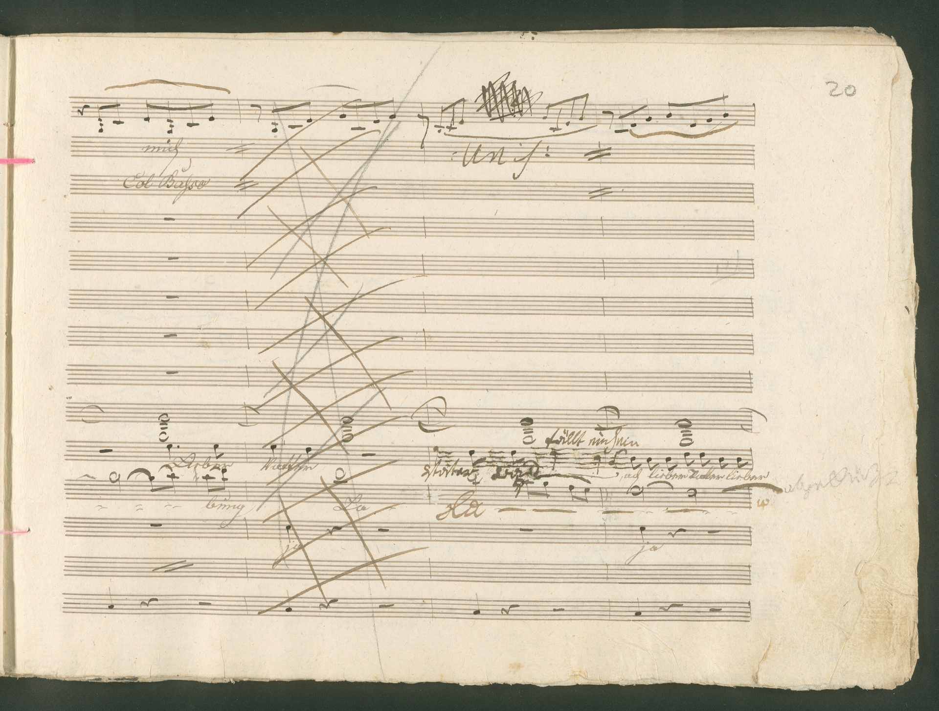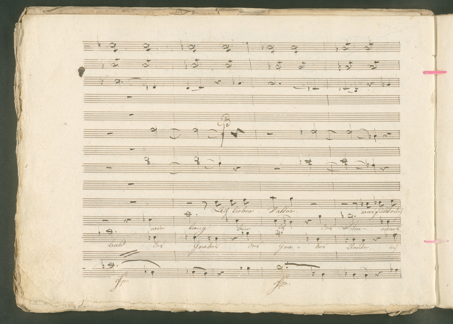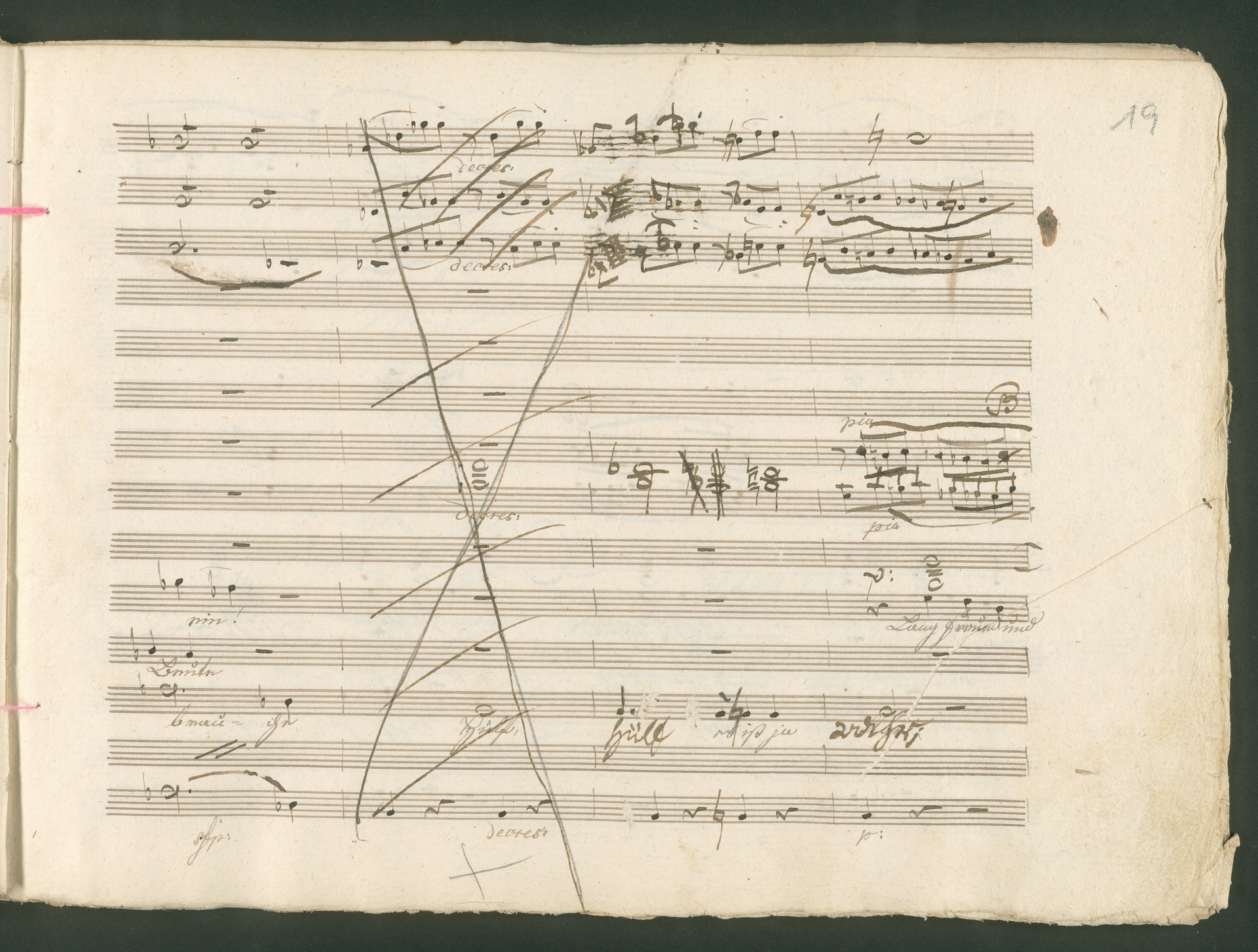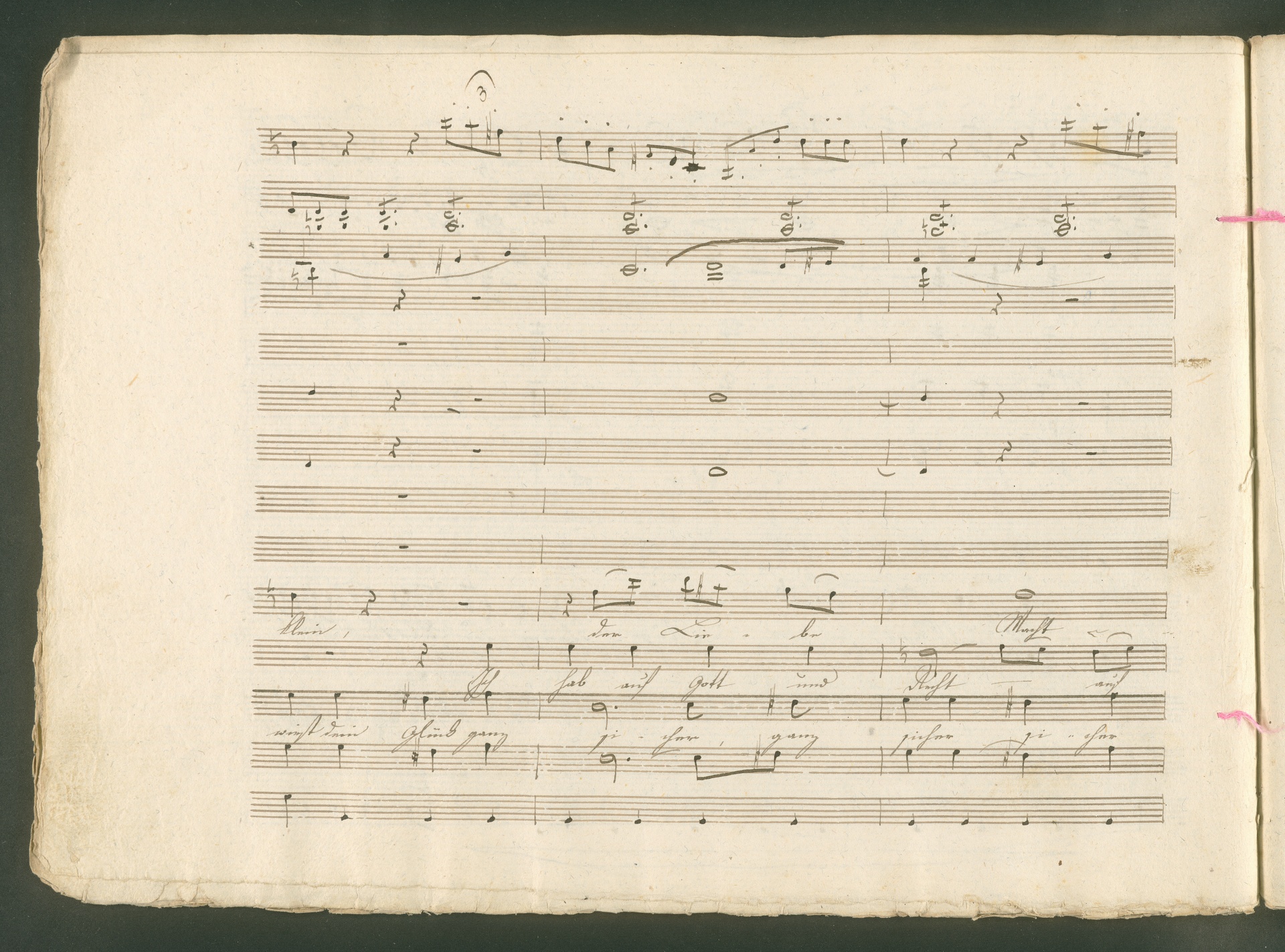 The trio from Beethoven's opera Fidelio "Gut, Söhnchen, gut" ("Well said, my son"), of which we can see a corrected copy for the 1806 version, is the most problematic number in the opera. It is very long (in 1805 it had 232 bars, the version for 1806 211 bars and the 1814 version was shortened to 198 bars) and was originally the end of the exposition. Despite being shortened the trio only received minor revisions. While it still had a place amongst the other lighthearted numbers in 1806, its dramatic role changed in 1814 as the comic-larmoyante plot surrounding Marzelline was greatly reduced. (J.R.)