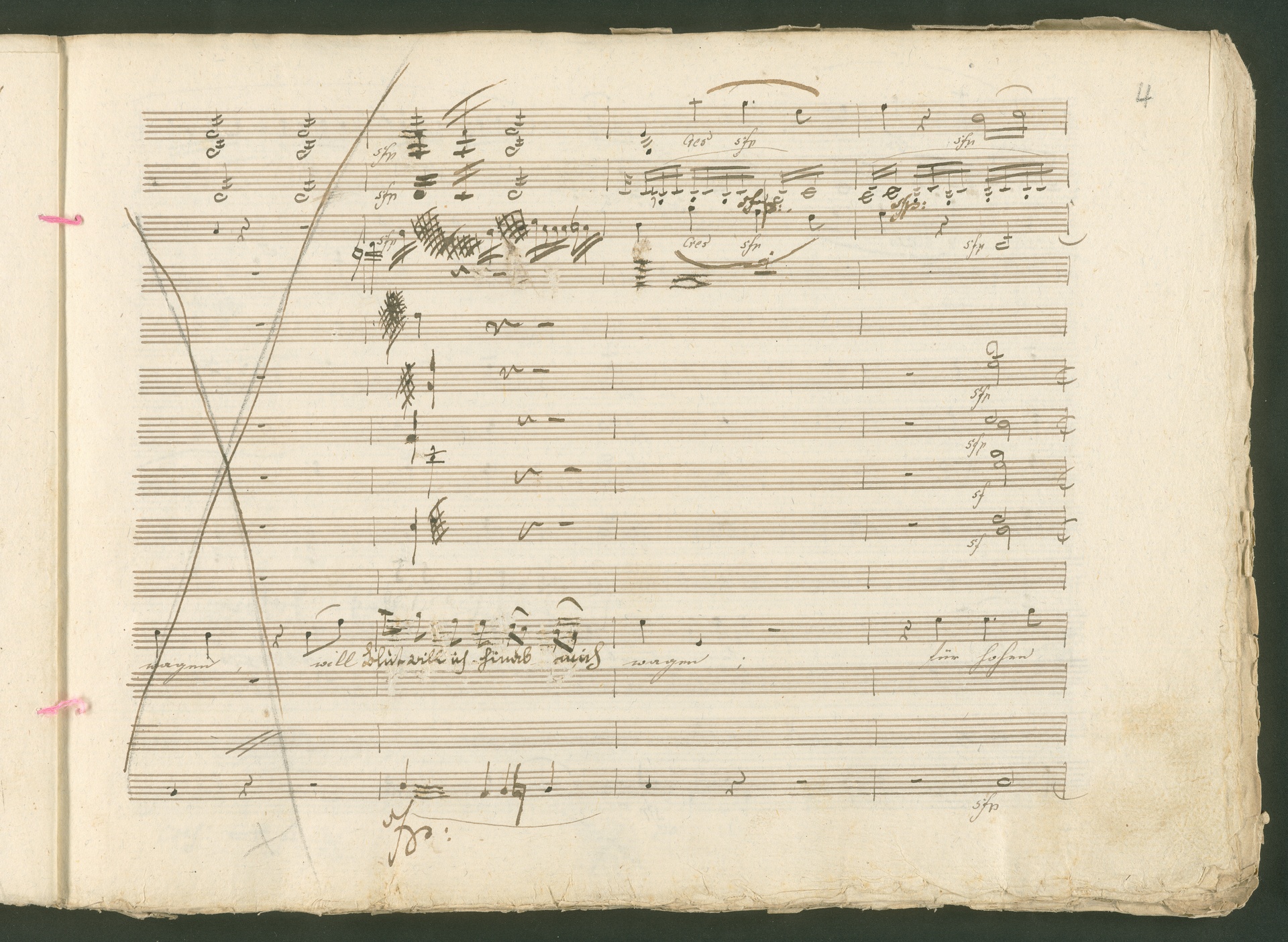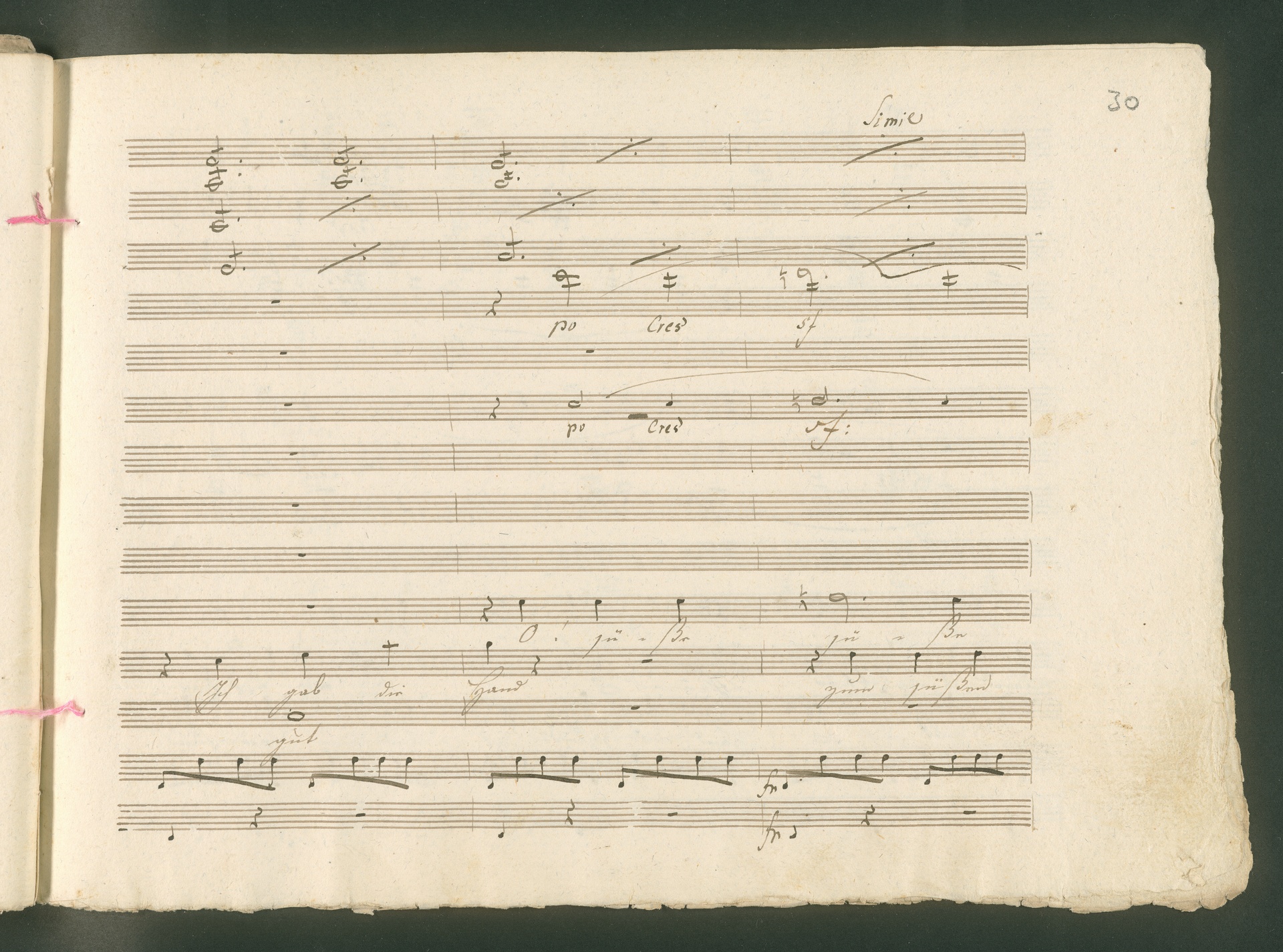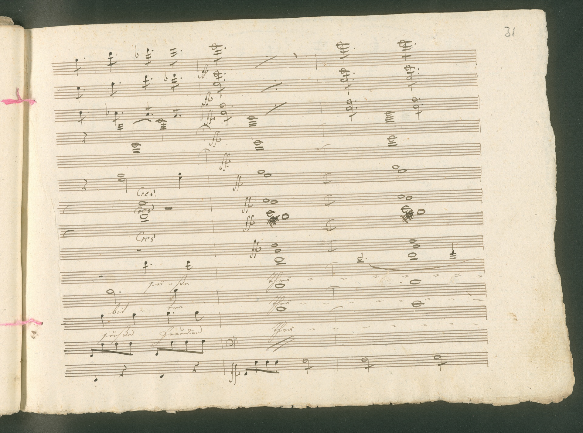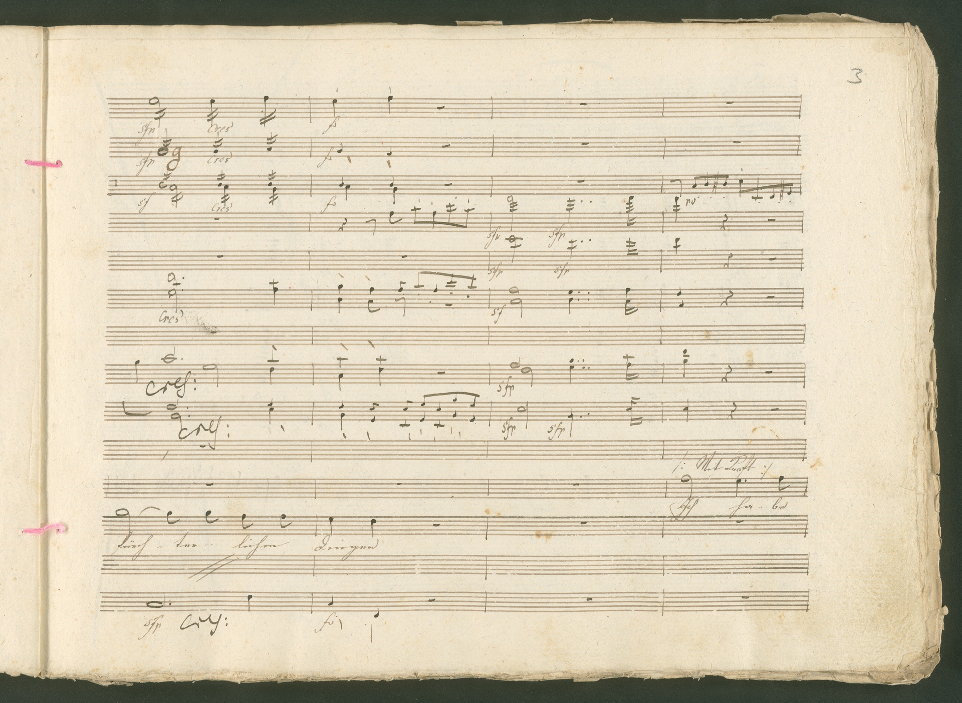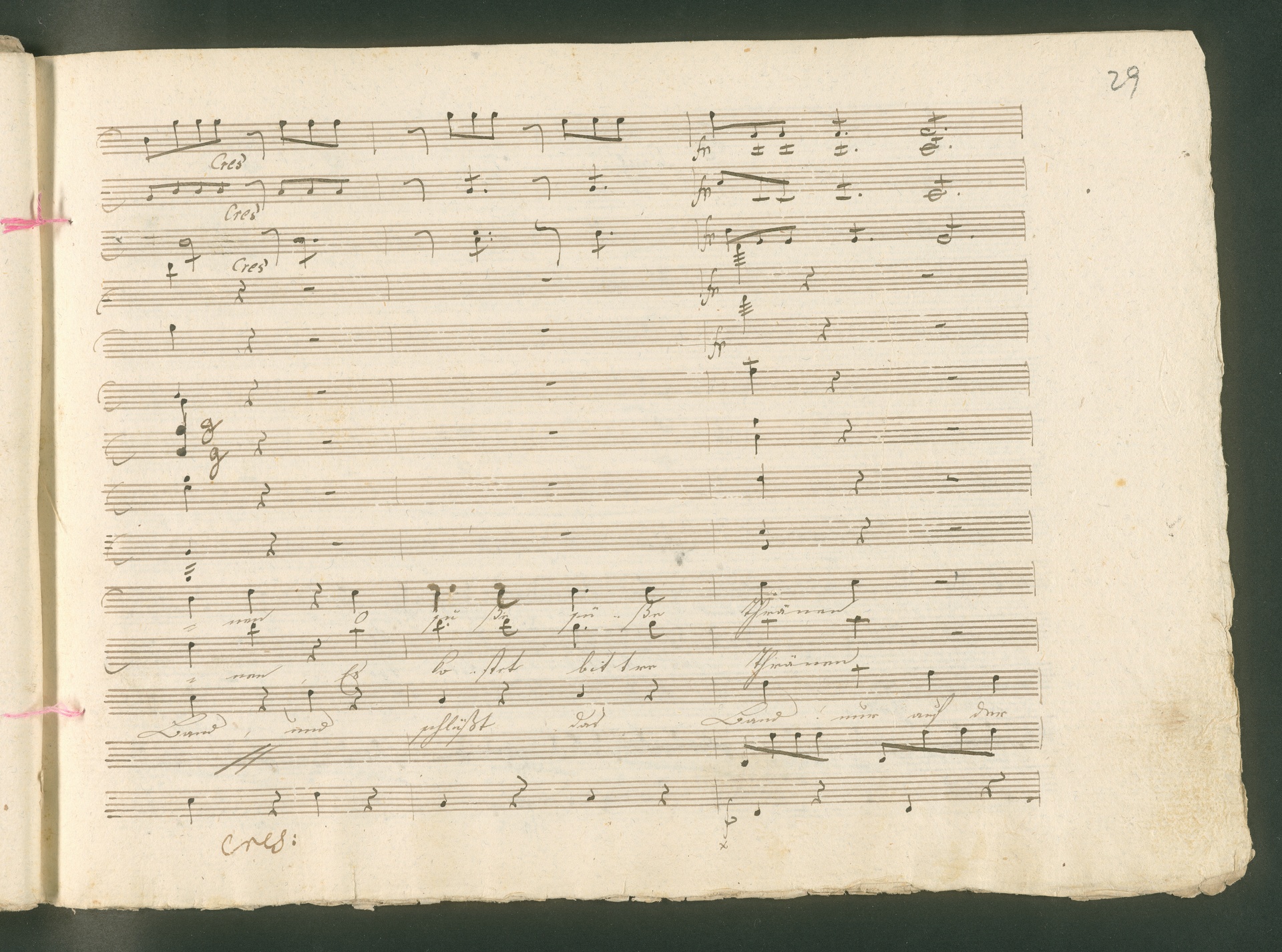 The trio from Beethoven's opera Fidelio "Gut, Söhnchen, gut" ("Well said, my son"), of which we can see a corrected copy for the 1806 version, is the most problematic number in the opera. It is very long (in 1805 it had 232 bars, the version for 1806 211 bars and the 1814 version was shortened to 198 bars) and was originally the end of the exposition. Despite being shortened the trio only received minor revisions. While it still had a place amongst the other lighthearted numbers in 1806, its dramatic role changed in 1814 as the comic-larmoyante plot surrounding Marzelline was greatly reduced. (J.R.)