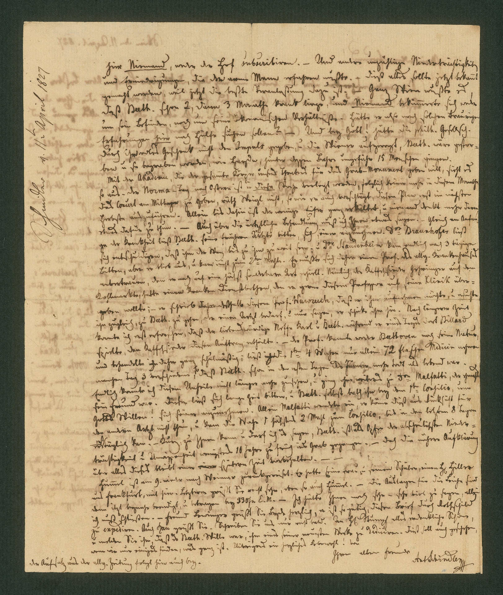 Beethoven has now been dead for two weeks. There had been some indignation in Vienna concerning the donation of the London Philharmonic Society. Schindler and Breuning are now trying to rectify the facts. Schindler encloses an article of the Augsburg General Newspaper (dated April 25th, 1827) which dealt with the matter in a positive way. He asks Moscheles to publish the letters Beethoven addressed to him and Smart. Thereby he wants to prove that Beethoven indeed needed help.