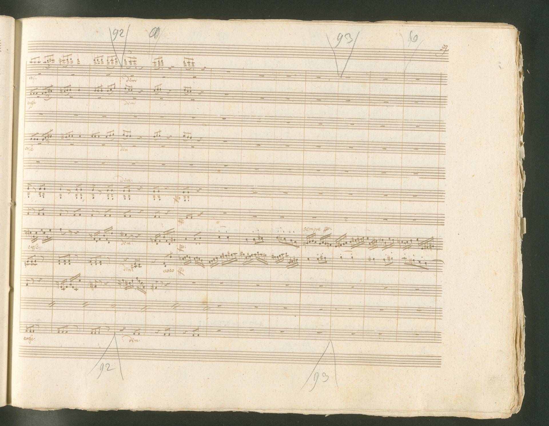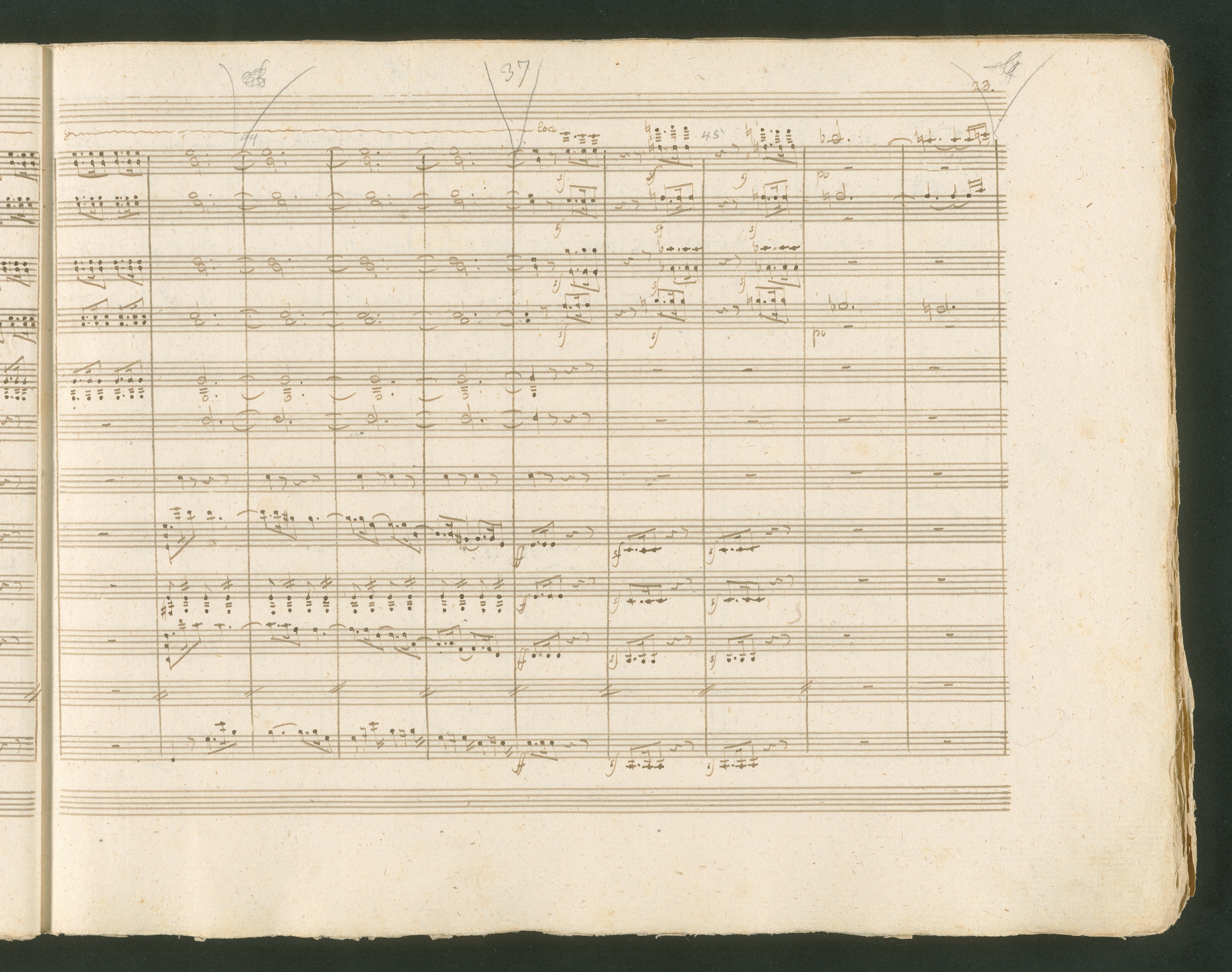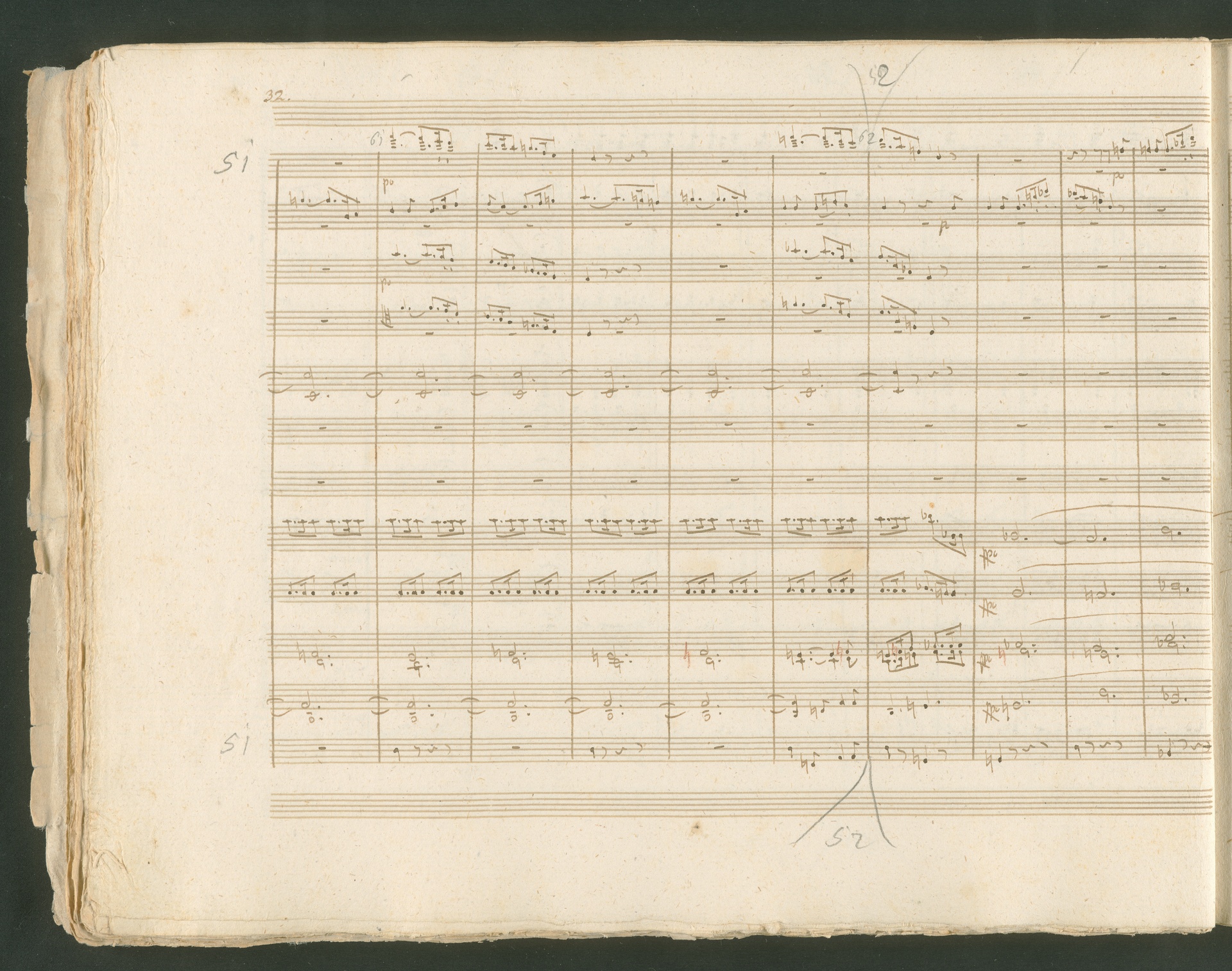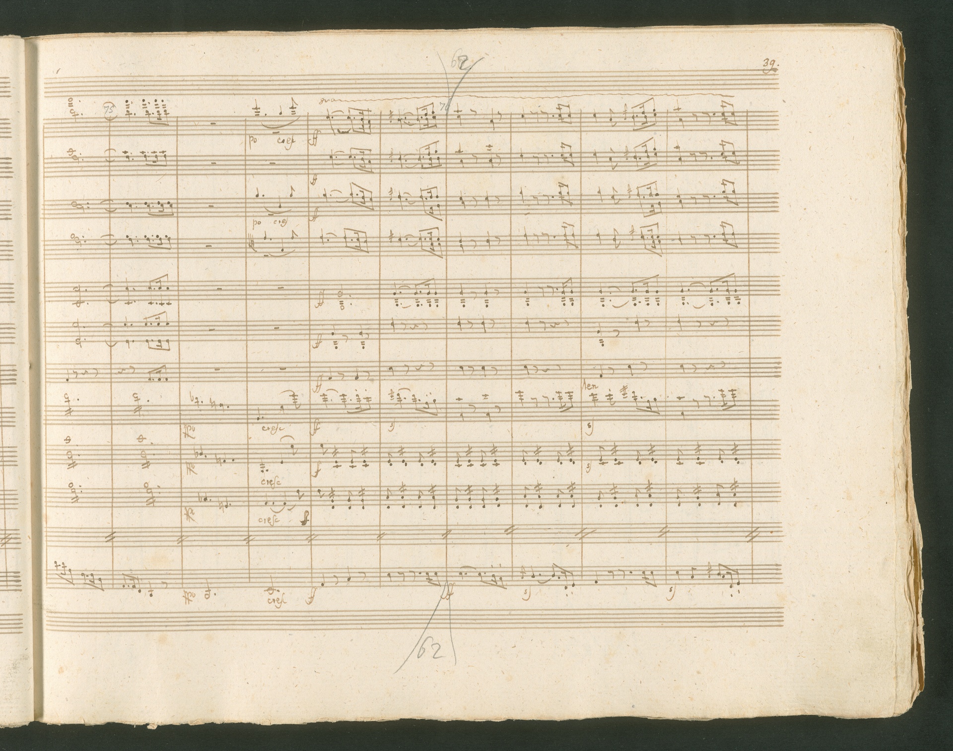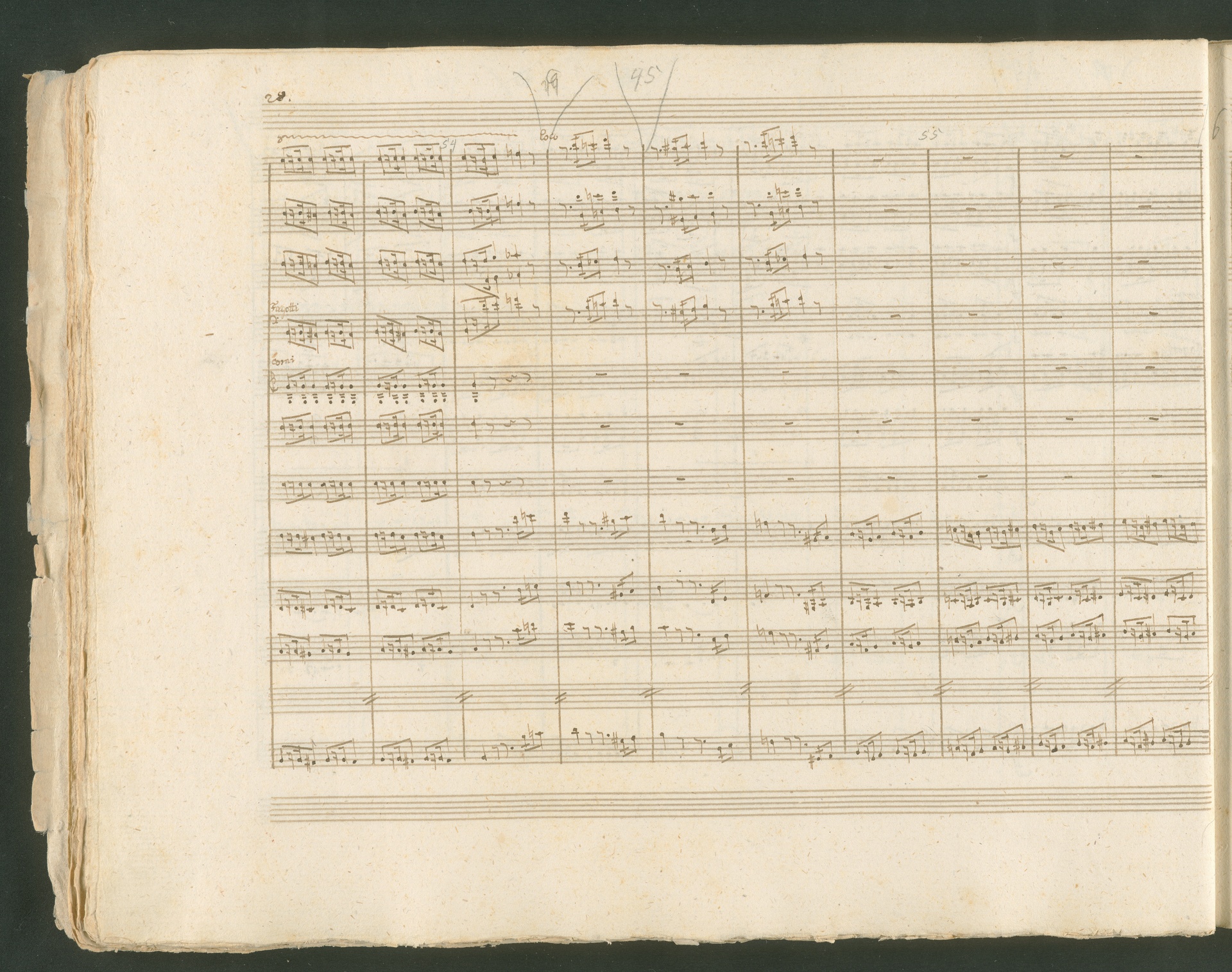 Anton Diabelli, today generally known as a composer, was actually for the main part a music publisher in Vienna. He began his career in publishing as an employee at Sigmund Anton Steiner's Chemische Druckerei, where he was a proof-reader. Beethoven greatly admired Diabelli's work (he conscientiously corrected spelling mistakes in manuscripts), and jokingly called him "Diabolus Diabelli". As part of his work at the publishing house, Diabelli copied the engraver's model for the Seventh Symphony op. 92 for Steiner's first edition. It is extremely accurate and carefully done. In fact it is so careful that it only contains one single correction by Beethoven (two natural signs are missing in one bar), although Beethoven certainly saw the copy, as shown by the directions in red crayon on the title page. (J.R.)