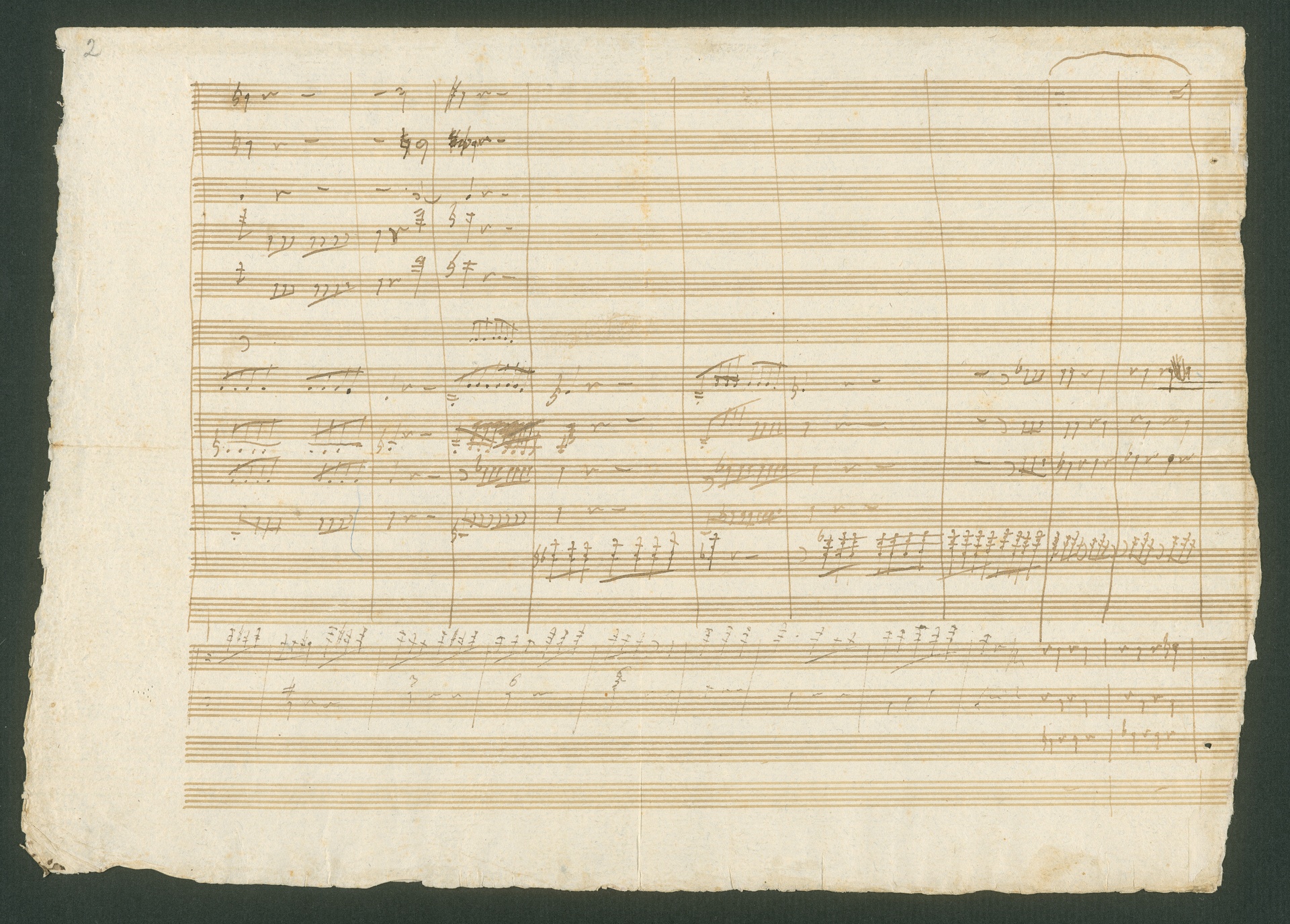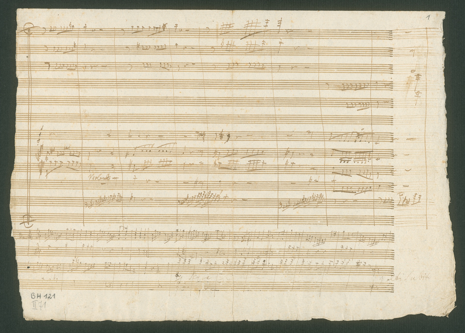 The leaf shown here contains - aside from sketches for a menuett in C major and a trio with basso continuo figuring - nineteen bars for the first movement of the Second Piano Concerto, written down in the form of an orchestral score. Although it is defined as a sketch leaf for research purposes, the appearance of the autograph gives the impression that it is a preliminary final version rather than a sketch. Articulation markings, phrasing and dynamics are missing and the piano part is notated without the left hand. Yet the notation is so clear and complete that today it is thought that the autograph could be an insertion for a lost second version of the concerto. The insertion sign (a crossed circle) on the top left-hand side of the first page supports this supposition. Beethoven's Second Piano Concerto was composed at a time when he himself appeared as a concert pianist (although he gave this up later not least because of his failing hearing) and performed his own concertos. A complete notation of the solo part would therefore not have been necessary. In the same way phrasing, dynamics and articulation markings would not have been needed if Beethoven had, for instance, used the leaf as an aid to memory. It is possible that the sketch leaf was used for this purpose although it cannot be proven. Even though it is certain that one or even several early versions of the concerto existed, they cannot be reconstructed. (J.R.)