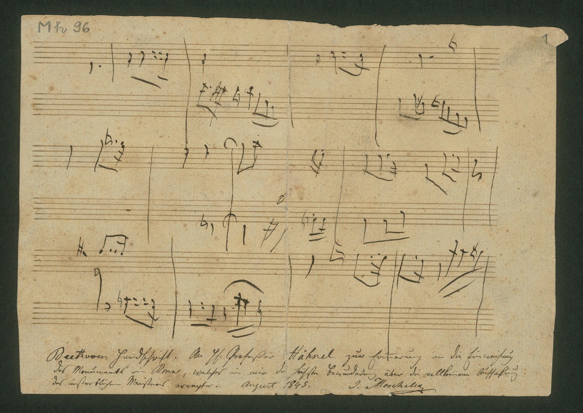 Schindler took the pocket sketchbook in its entirety. Half a year after Beethoven's death, in September 1827, he had already removed 16 leaves and given them to the pianist Ignaz Moscheles. But Moscheles did not keep his bundle intact either, but used it as a reservoir. When the Beethoven memorial was being erected in Bonn in 1845, Moscheles also removed a leaf - "our" leaf - from his bundle and gave it to Ernst Julius Hähnel, the sculptor who had designed the statue. Moscheles wrote a dedication on the front page, "Beethovens Handschrift. An H. Professor Hähnel zur Erinnerung an die Einweihung des Monuments in Bonn, welches in mir die höchste Bewunderung über die vollkommene Auffassung des unsterblichen Meisters erregte. August 1845. I. Moscheles" (Beethoven's manuscript. To H. Professor Hähnel in memory of the unveiling of the monument in Bonn, which awoke the greatest admiration in me for the perfect manner in which it had captured the immortal master. August 1845. I. Moscheles).