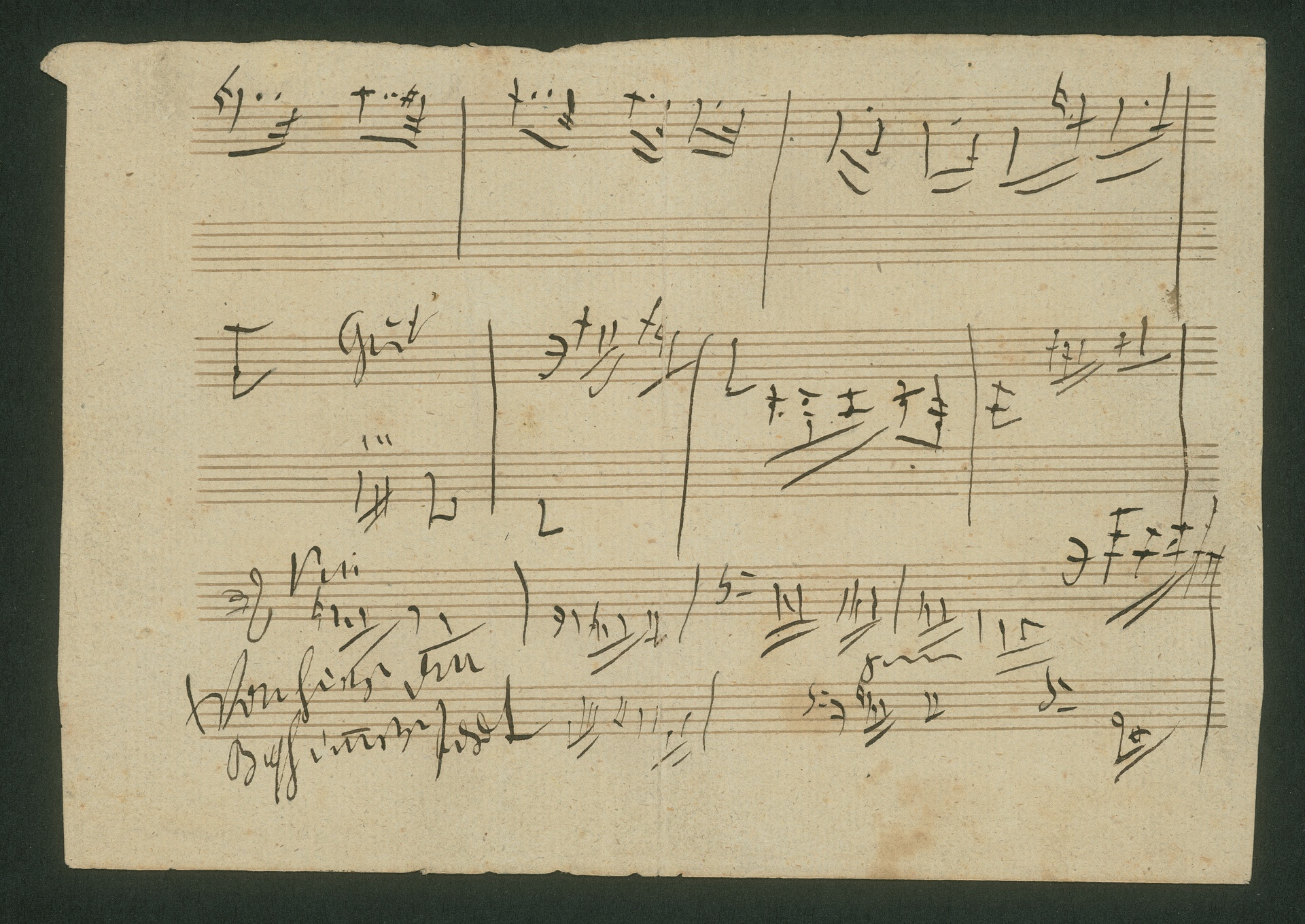 The leaf was originally part of a pocket sketchbook. Beethoven used paper in an upright format with 12 lines, folded it twice, bound it along one of the folds and cut open the edges on the other. This way he made smaller books which fitted in his coat pocket. Thus he always had music paper with him when he was out so as to be able to write down any musical ideas which occurred to him. In the book which this leaf belonged to he wrote down ideas for his late string quartets, in this case sketches for the fourth movement of the Quartet op. 131.