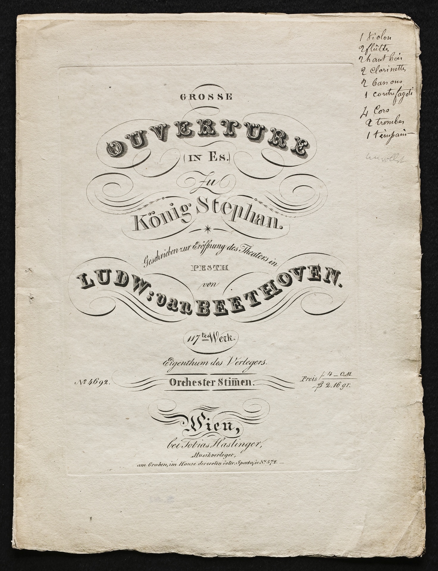 Ludwig van Beethoven, Ouvertüre (Es-Dur) zu August von Kotzebues Festspiel "Ungarns erster Wohltäter" op. 117, Orchesterstimmen, Haslinger, 4692