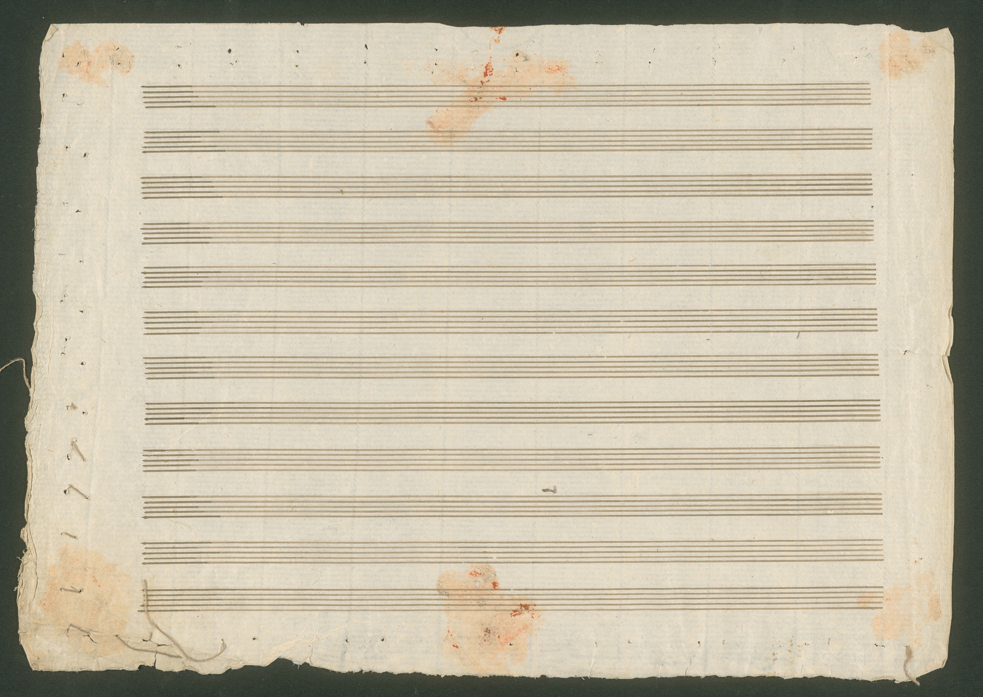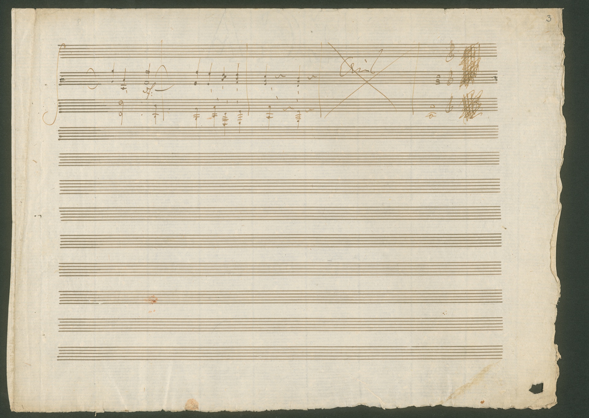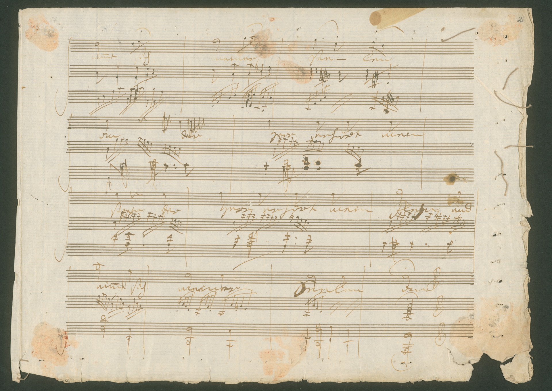 Here you can see the autograph score of the Gellert lied op. 48 no. 5, "Gottes Macht und Vorsehung" ("God's might and providence"). Along with the autograph score of no. 6 (also at the Beethoven-Haus, call number HCB Mh 30), with which the one shown here was once joined, it is the only surviving manuscript of the songs. Whereas the autograph score of no. 6 contains a clean and complete revision, the manuscript shown here is somewhat different. The lied "Gottes Macht und Vorsehung" no. 6 is on leaves 2v and 3r (in the original edition it was no. 5) although Beethoven did not give it a title here. However, on leaf 2r there is the end of an older version of the Bußlied op. 48 no. 6. These bars are the only ones that have survived from Beethoven's first manuscript of the Gellert lieder. Whilst the composer used the first version of "Gottes Macht und Vorsehung" without making any changes, he decided to revise the Bußlied. Beethoven obviously wanted this older version to completely disappear because he sewed an empty leaf over the front of the second leaf, sticking the pages together with sealing wax for increased durability. The pages have now been opened for the purpose of research, although the wax and the places where it was sewn can still be clearly seen. (J.R.)