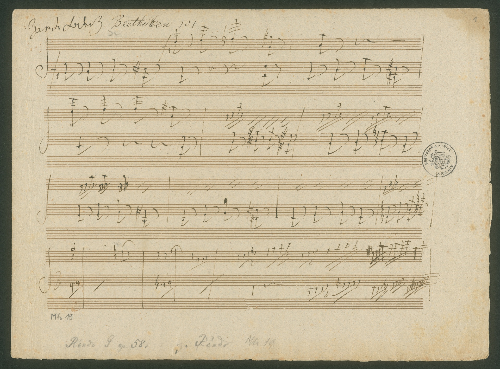 Beethoven composed three cadenzas for the last movement of his Fourth Piano Concerto op. 58. HCB Mh 19 bears Beethoven's own heading "Zweite Kadenz" ("second cadenza"). Up to now it was thought that the composer wanted to number alternative versions of his rondo cadenzas. But the paper and writing refute this theory. Beethoven actually composed his cadenzas in pairs. A cadenza for the first movement was paired with a cadenza for the last one - like cadenza "full versions" for the whole concerto. HCB Mh 19 is the second cadenza of one of these pairs, its other half being HCB Mh 14. The latter was also logically given the heading "Zweite Kadenz" by the composer. (J.R.)