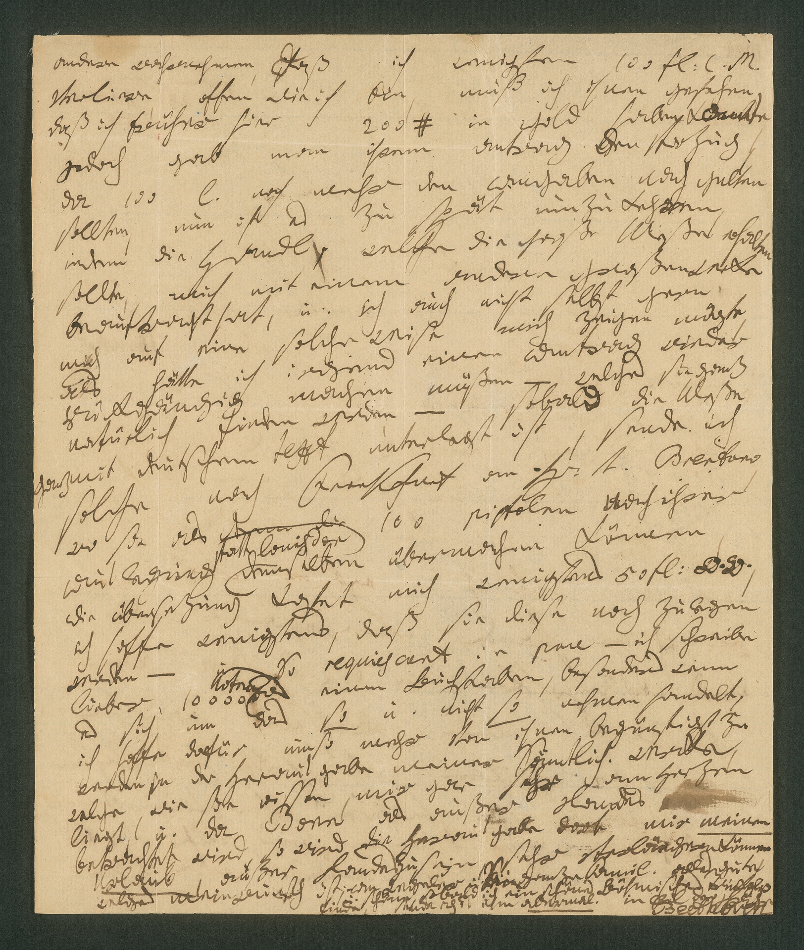 Beethoven writes to his publisher Simrock regarding the Mass op. 123. This time it is about payment. Beethoven accepts Simrock's offer of 100 pistoles instead of 100 louis d'or, although this means he will suffer a loss. He promises to immediately send the mass to Brentano in Frankfurt, who will then send it on to Bonn. Beethoven adds that the translation of the text of the mass is an additional cost. He hopes that at least this sum will be reimbursed by Simrock. Beethoven once again mentions the complete edition of his works which is very important to him. He ends the letter with greetings to the Wegeler family.