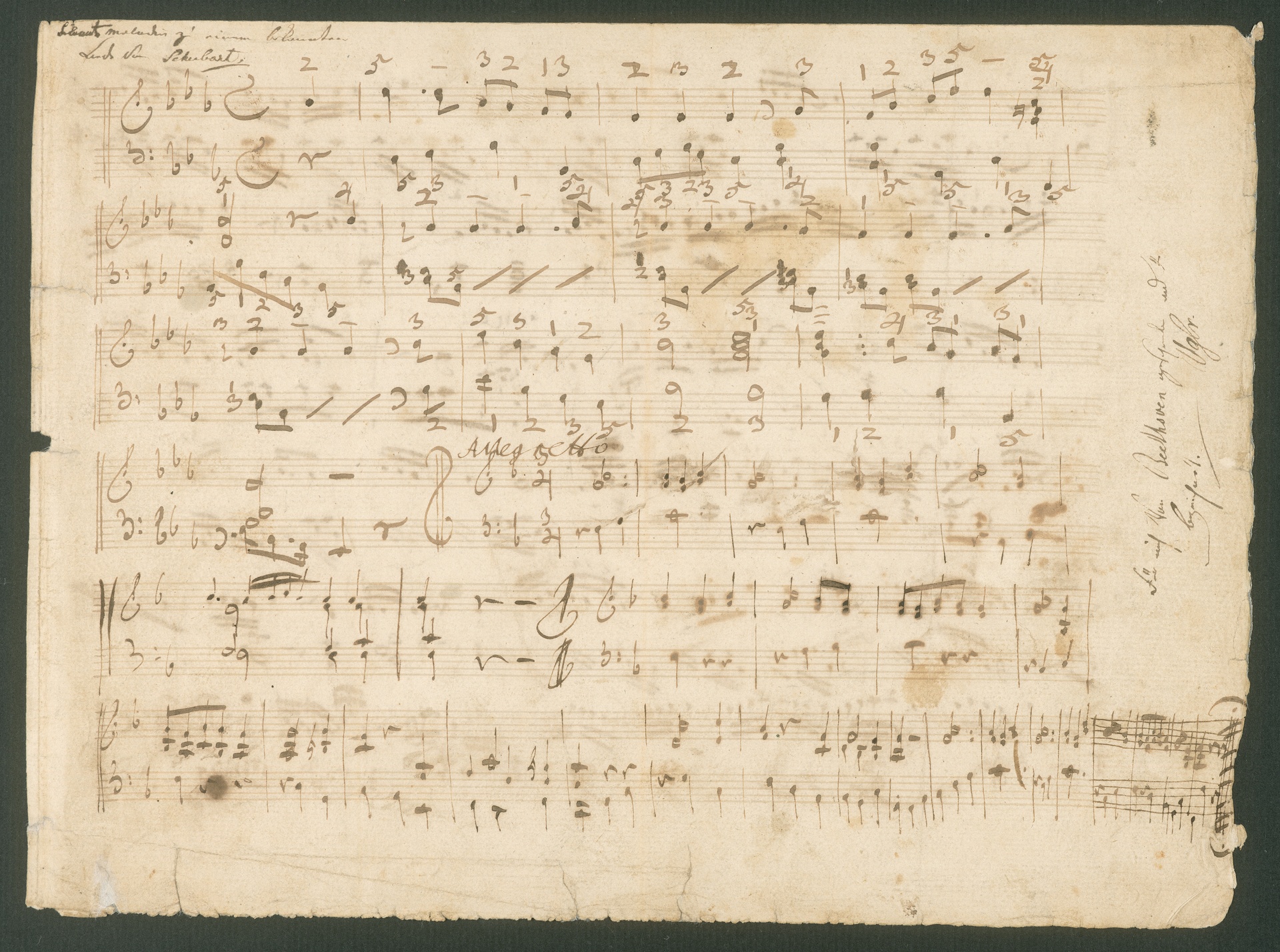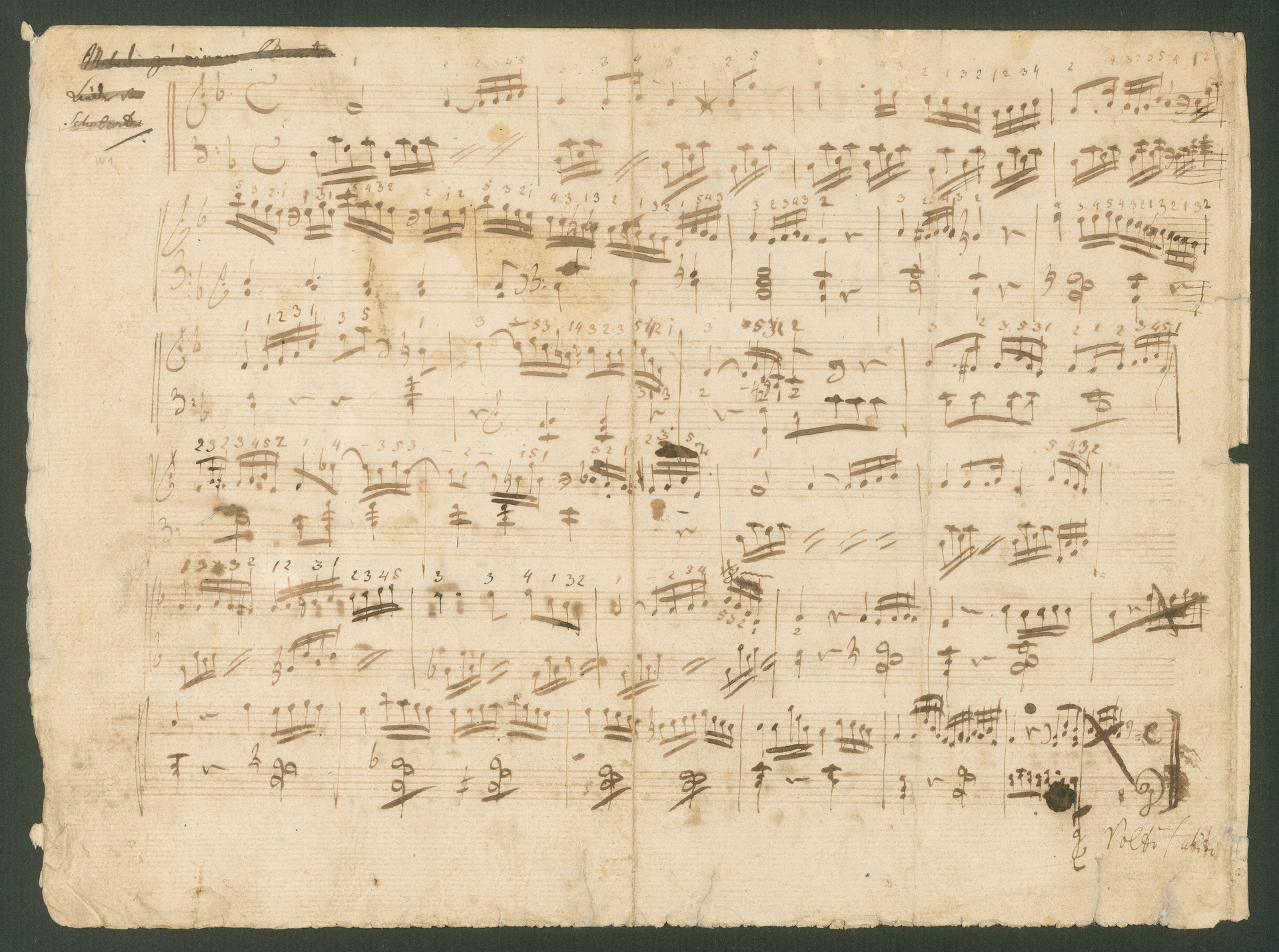 The Bonn doctor Franz Gerhard Wegeler (1765-1848) was one of Beethoven's oldest friends. They had already known each other in Bonn. Wegeler's marriage to Beethoven's childhood friend Eleonore von Breuning in 1802 strengthened their relationship. Their friendship lasted their whole lives. Wegeler studied medicine in Vienna from 1787-1789, returning to his hometown of Bonn afterwards. Beethoven said goodbye to his friends in Bonn in autumn 1792 to study in Vienna (and in the end never returned to Bonn). It was probably in 1790 or 1791 that Beethoven gave Franz Gerhard Wegeler the leaf with the Sonatine WoO 50 and a copy or rather a piano arrangement of the so-called Kaplied (Cape Lied) by Christian Friedrich Daniel Schubart. Beethoven even added fingerings to the piano arrangement for Wegeler, as the latter noted across the margin, "Für mich Von Beethoven geschrieben und bezeichnet. Wglr" ("Written and with fingerings for me by Beethoven. Wglr"). The leaf was definitely a single leaf at the time on which it was written. Today the front contains the piano version of the Lied and the reverse Beethoven's sonatine. However Beethoven originally wanted to have them the other way around: on the reverse at the end of the last stave there is an upside down clef which is the wrong way wrong and the accompanying accidentals. Beethoven obviously wanted to begin the musical text here, decided otherwise, turned over the leaf and first of all wrote down Schubart's Kaplied. He then turned over the leaf again and wrote the sonatine down on the reverse. But there was not enough space on this page, which is why he wrote the end of the first movement of the sonatine on the front, in the first empty stave underneath the Kaplied. He now had hardly any space left for the second movement of the sonatine and began it directly after the Kaplied (two thirds of the line had remained empty). He finished this movement by jumping over the following part of the fifth accolade which already contained the last two bars of the first movement. Due to lack of space he was obliged to "tack" a few bars onto the staves at the end of the page. (J.R.)