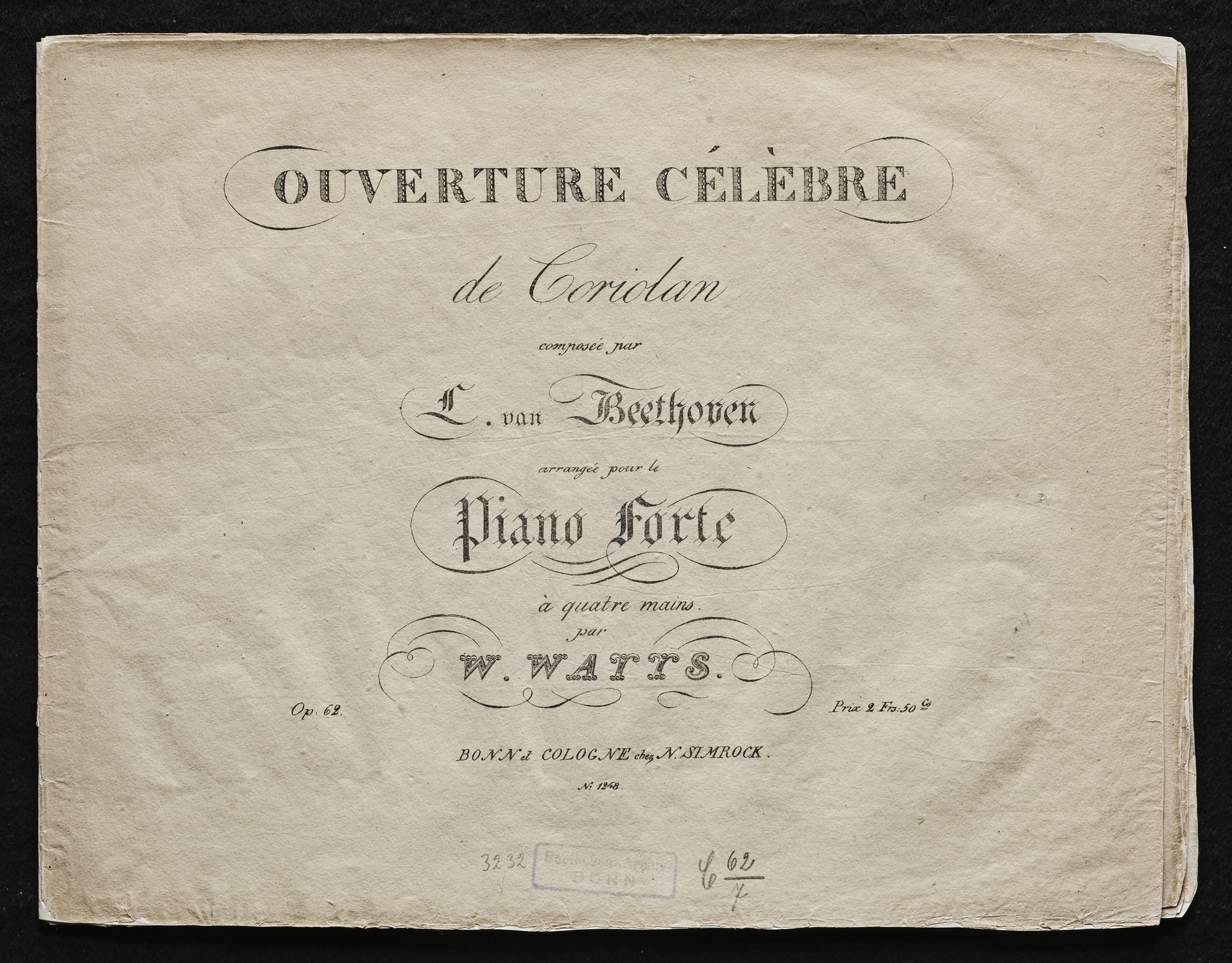 Ludwig van Beethoven, Ouvertüre (c-Moll) zu Heinrich Joseph von Collins Trauerspiel "Coriolan" op. 62, Bearbeitung für Klavier zu 4 Händen von William Watts, Simrock, 1268