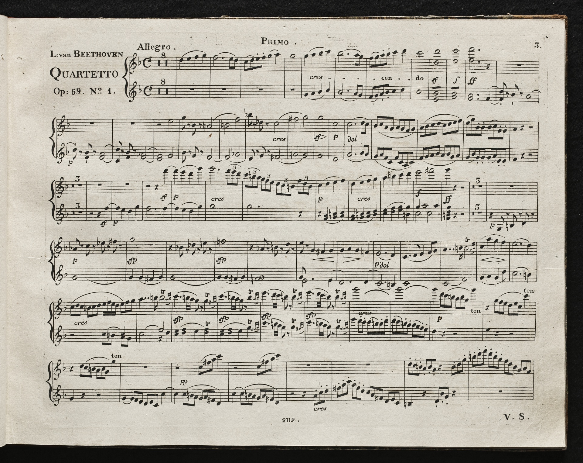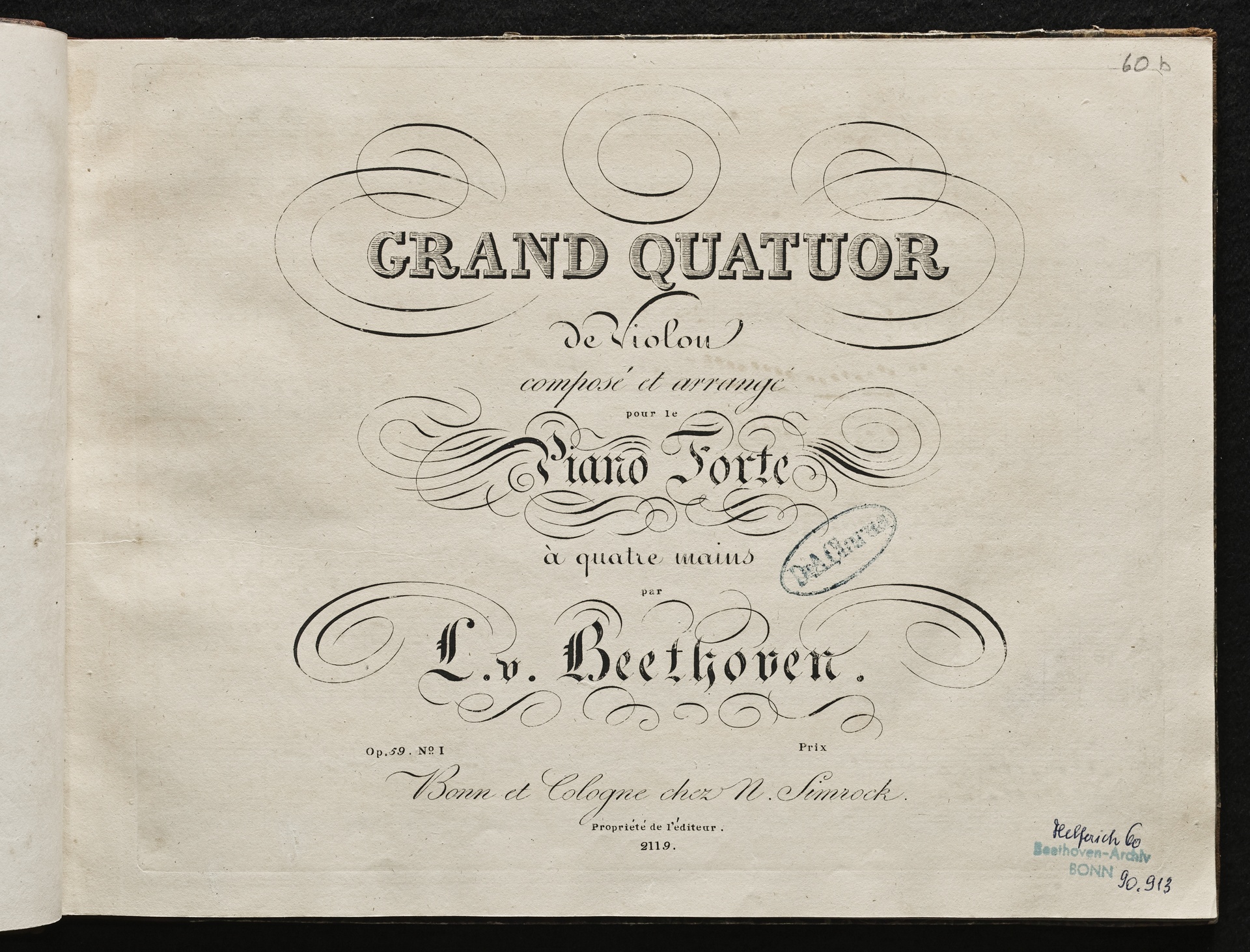 Ludwig van Beethoven, Quartett für 2 Violinen, Viola, Violoncello (F-Dur) op. 59, 1, Bearbeitung für Klavier zu 4 Händen von Carl David Stegmann, Simrock, 2119