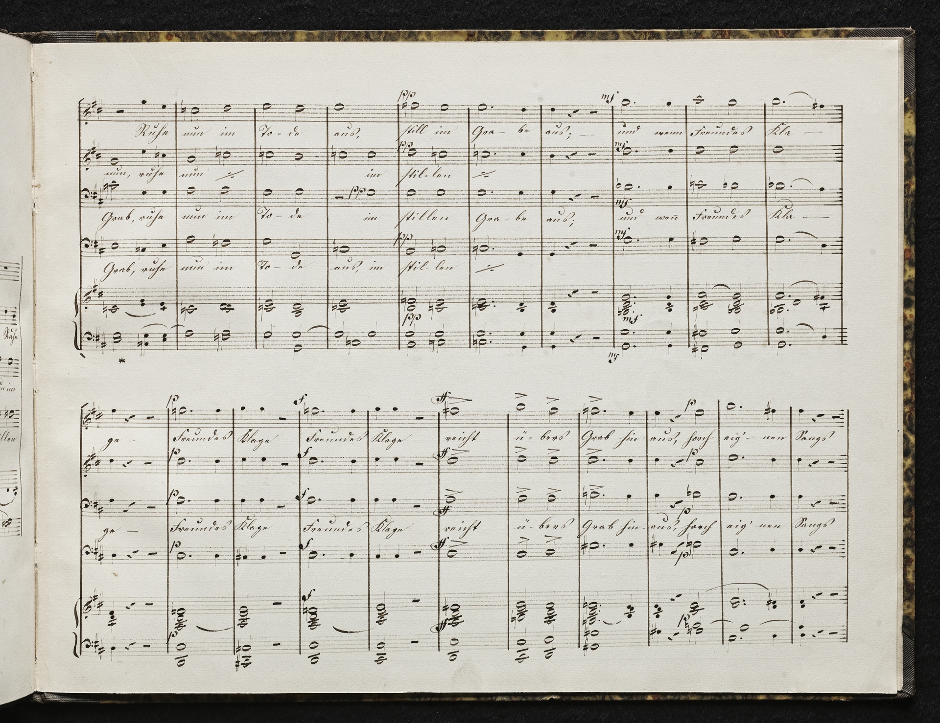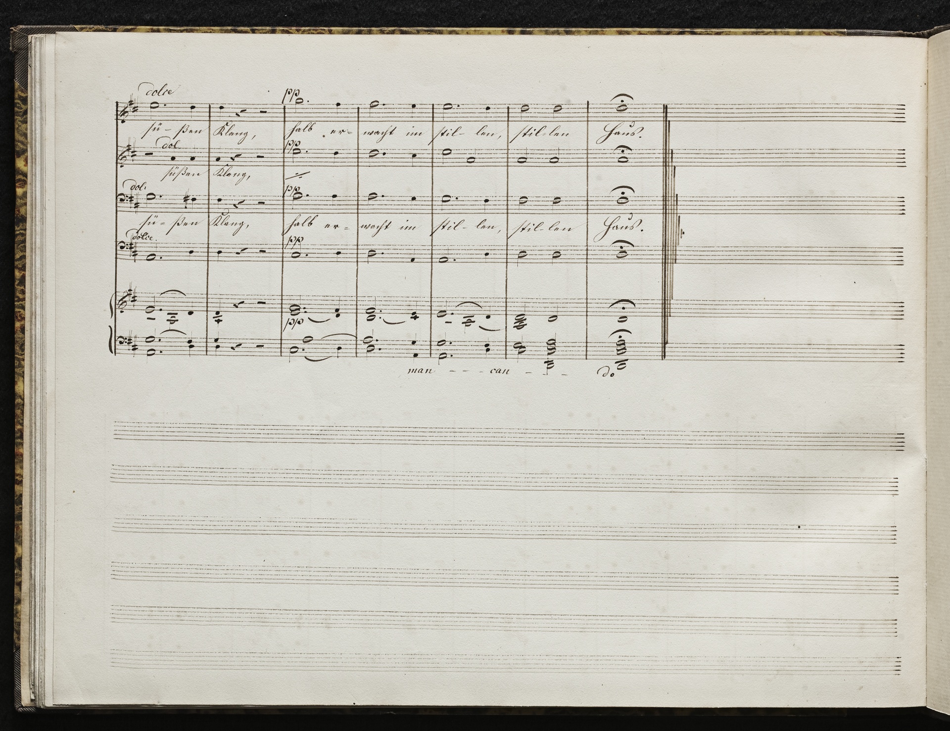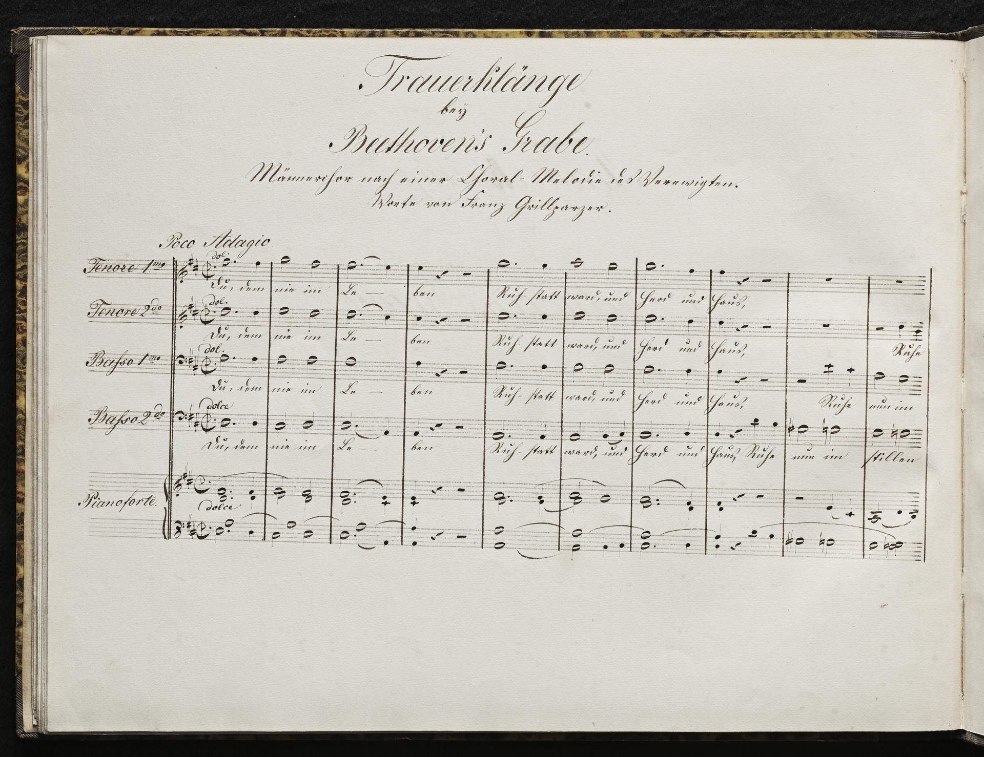 Ludwig van Beethoven, "Trauerklänge bey Beethoven's Grabe", Choral für vierstimmigen Männerchor und Klavier von Ignaz von Seyfried bearbeitet nach Ludwig van Beethovens Equale WoO 30, 2 (D-Dur), Partitur, Abschrift
