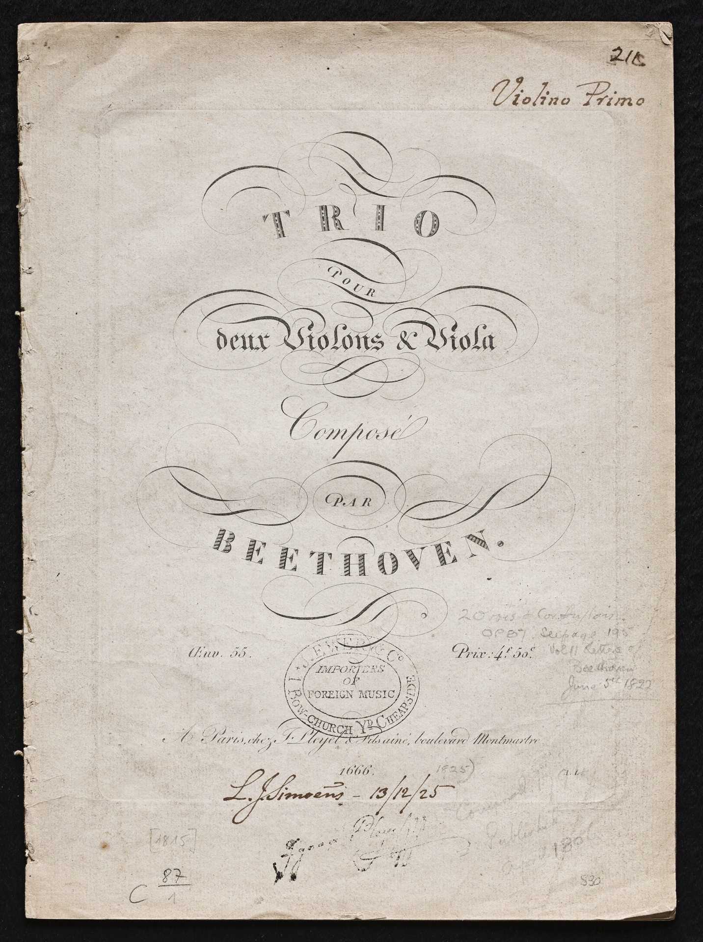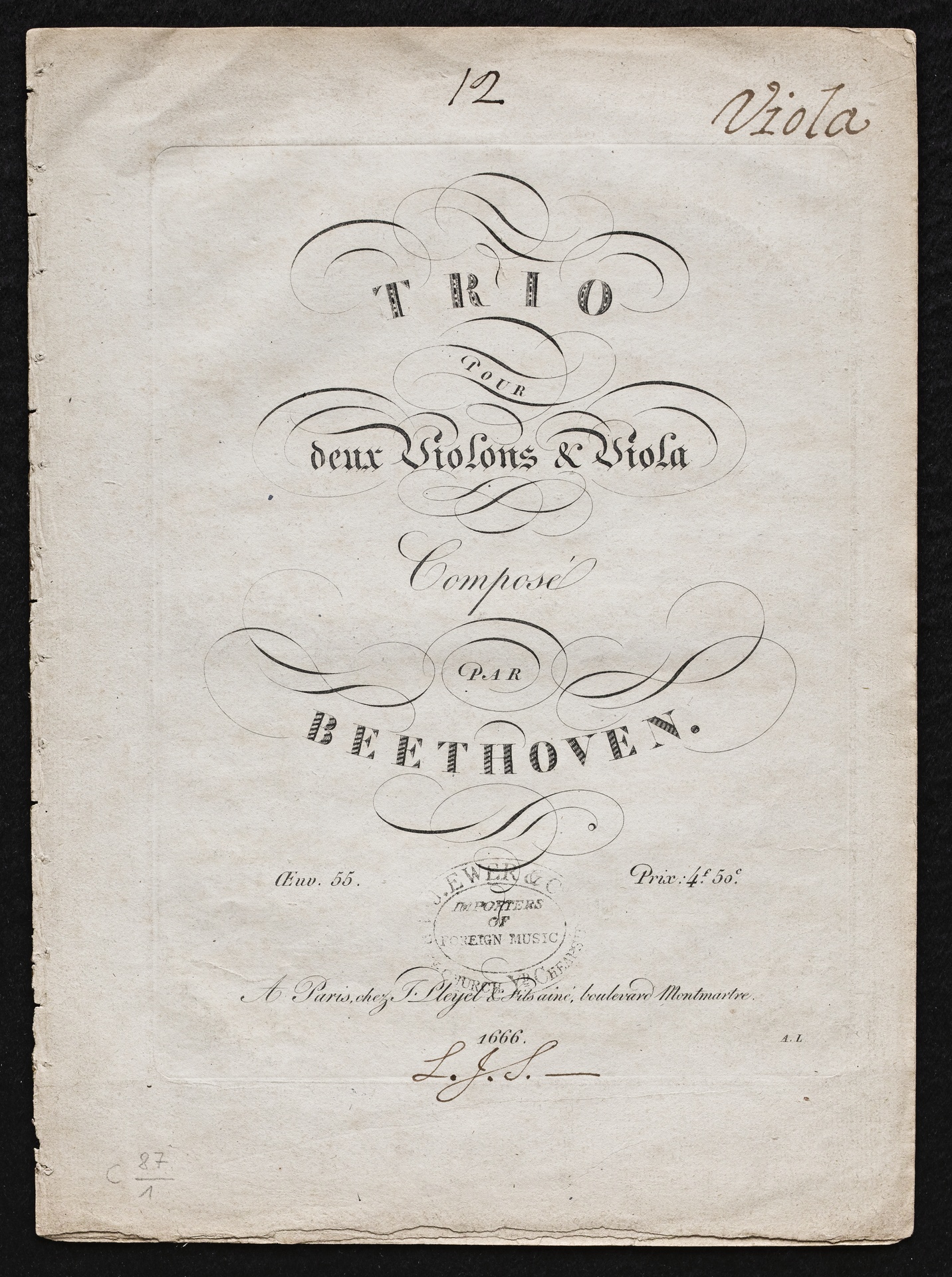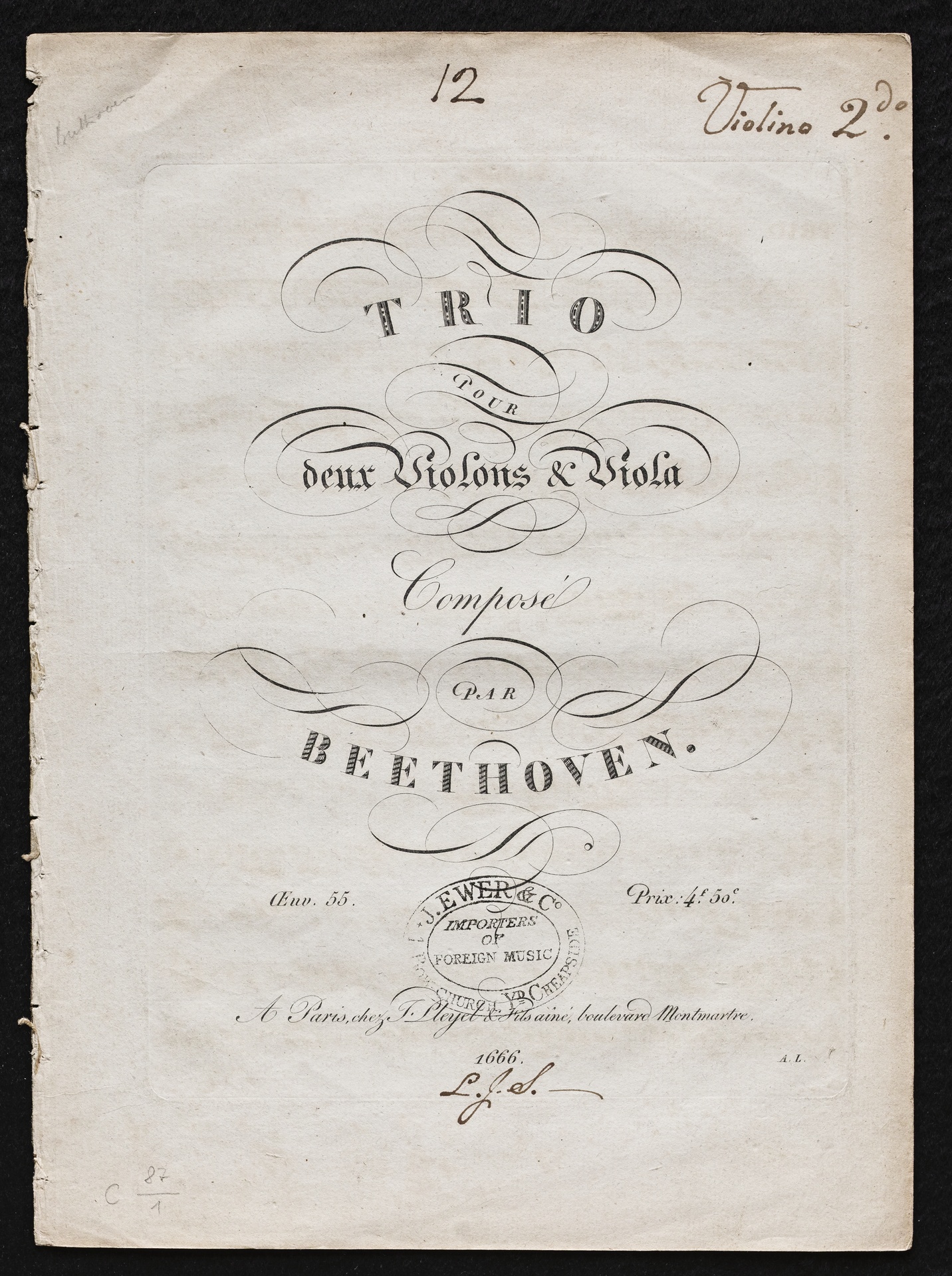 Ludwig van Beethoven, Trio für 2 Oboen und Englisch Horn (C-Dur) op. 87, Bearbeitung für 2 Violinen, Viola, Stimmen, Pleyel, 1666
